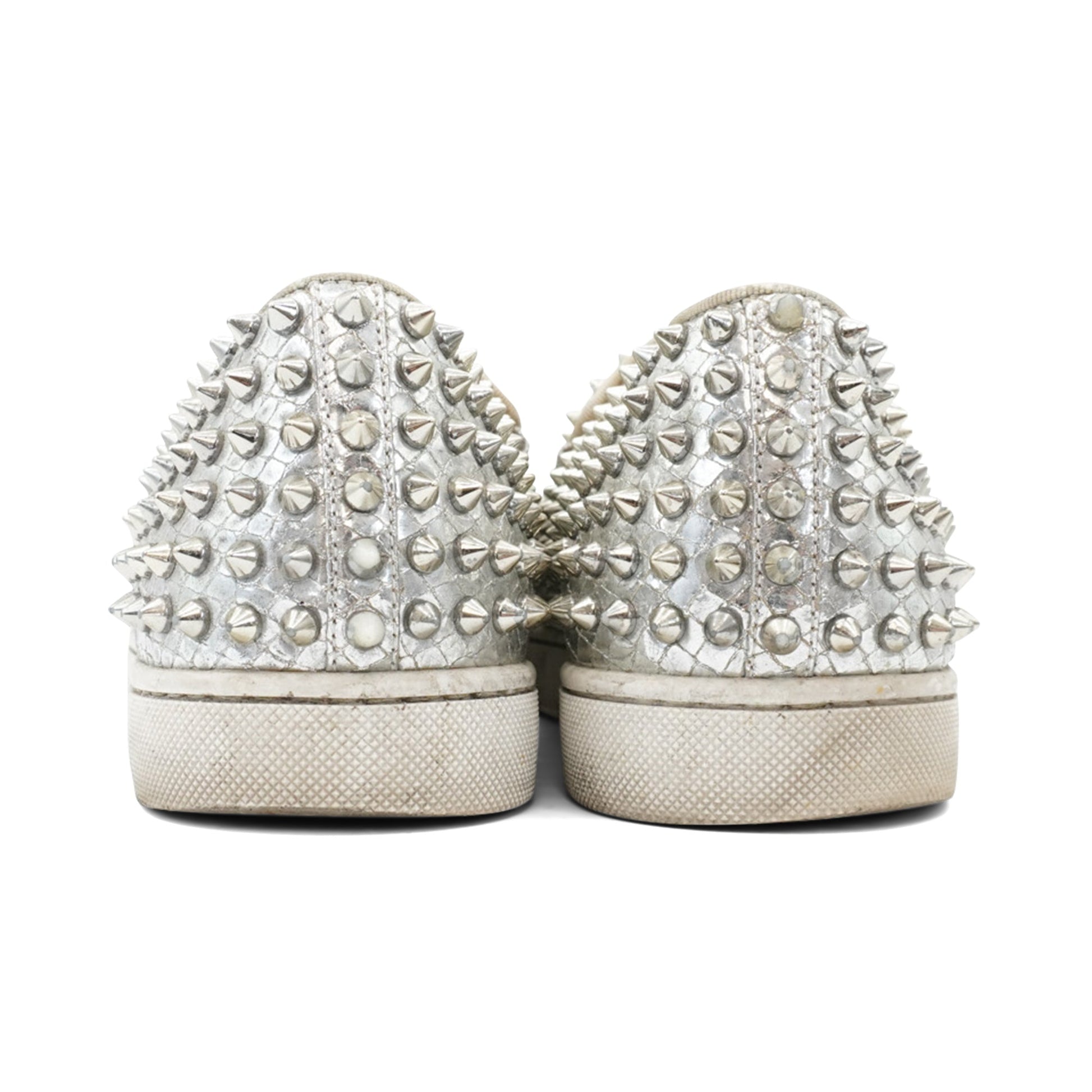 Christian Louboutin 'Spike Boat' slip on sneakers in metallic snakeskin with all over silver spike studs, white grosgrain trim, and signature red rubber soles.
