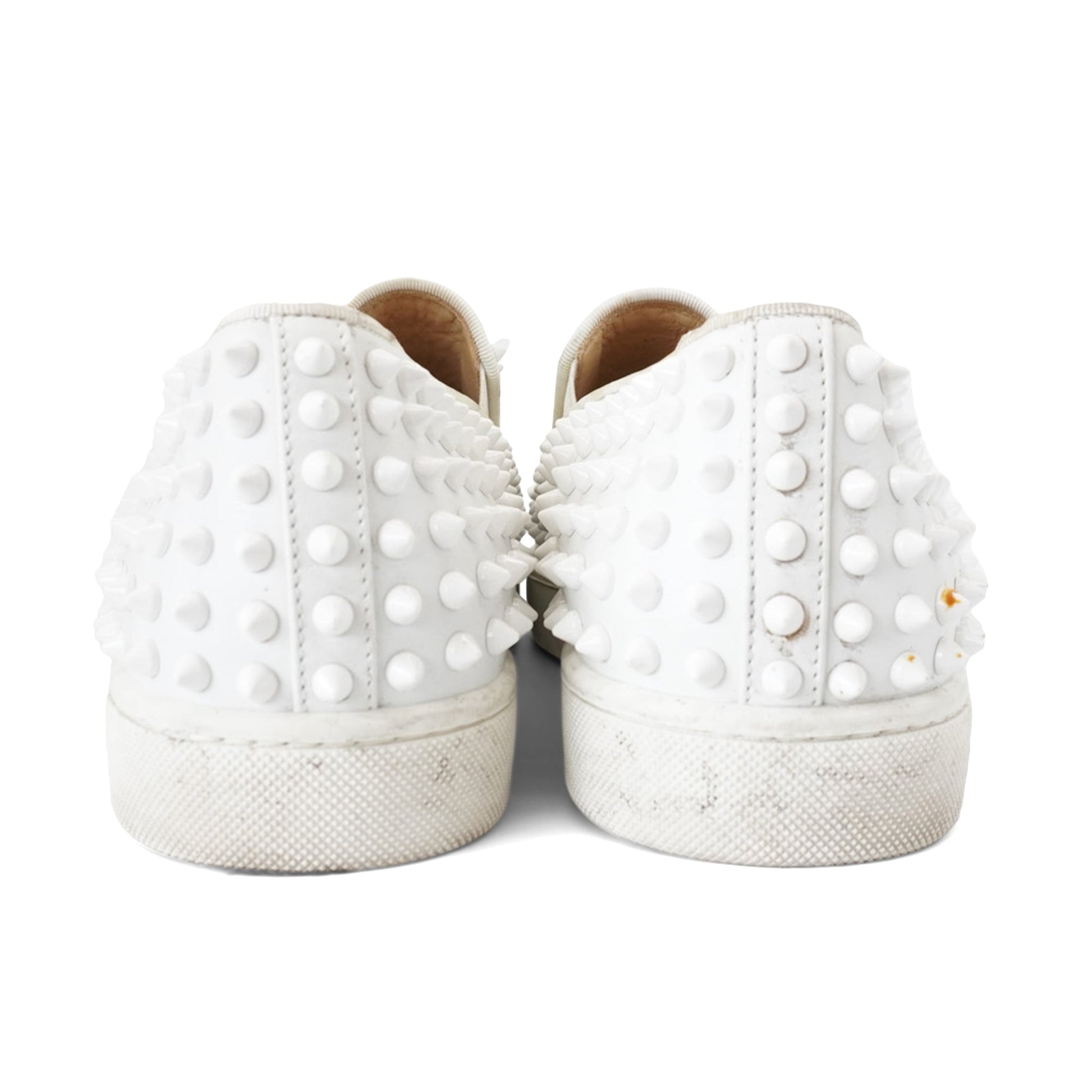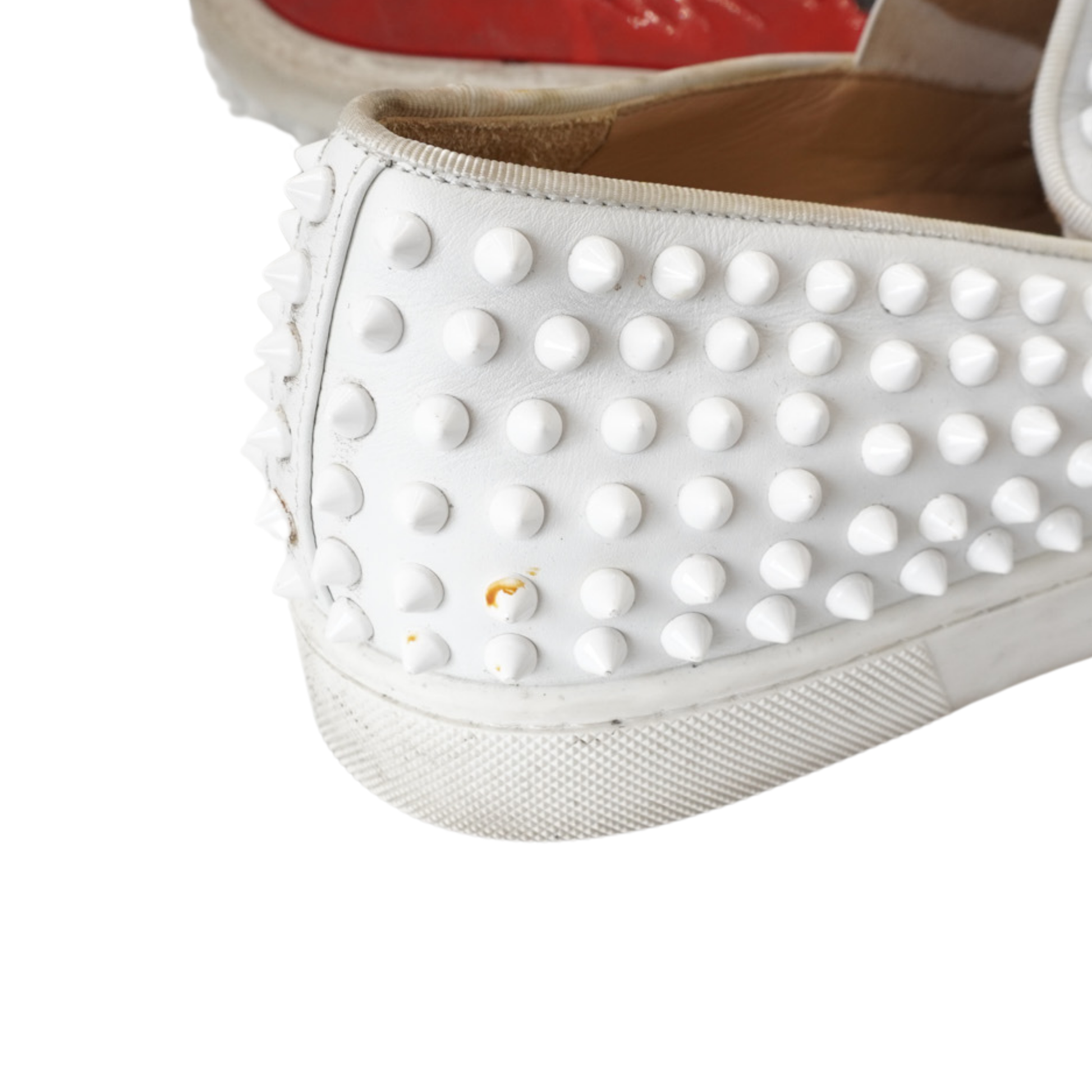 Christian Louboutin 'Spikeboat' slip on sneakers in white leather with white spike studs throughout.