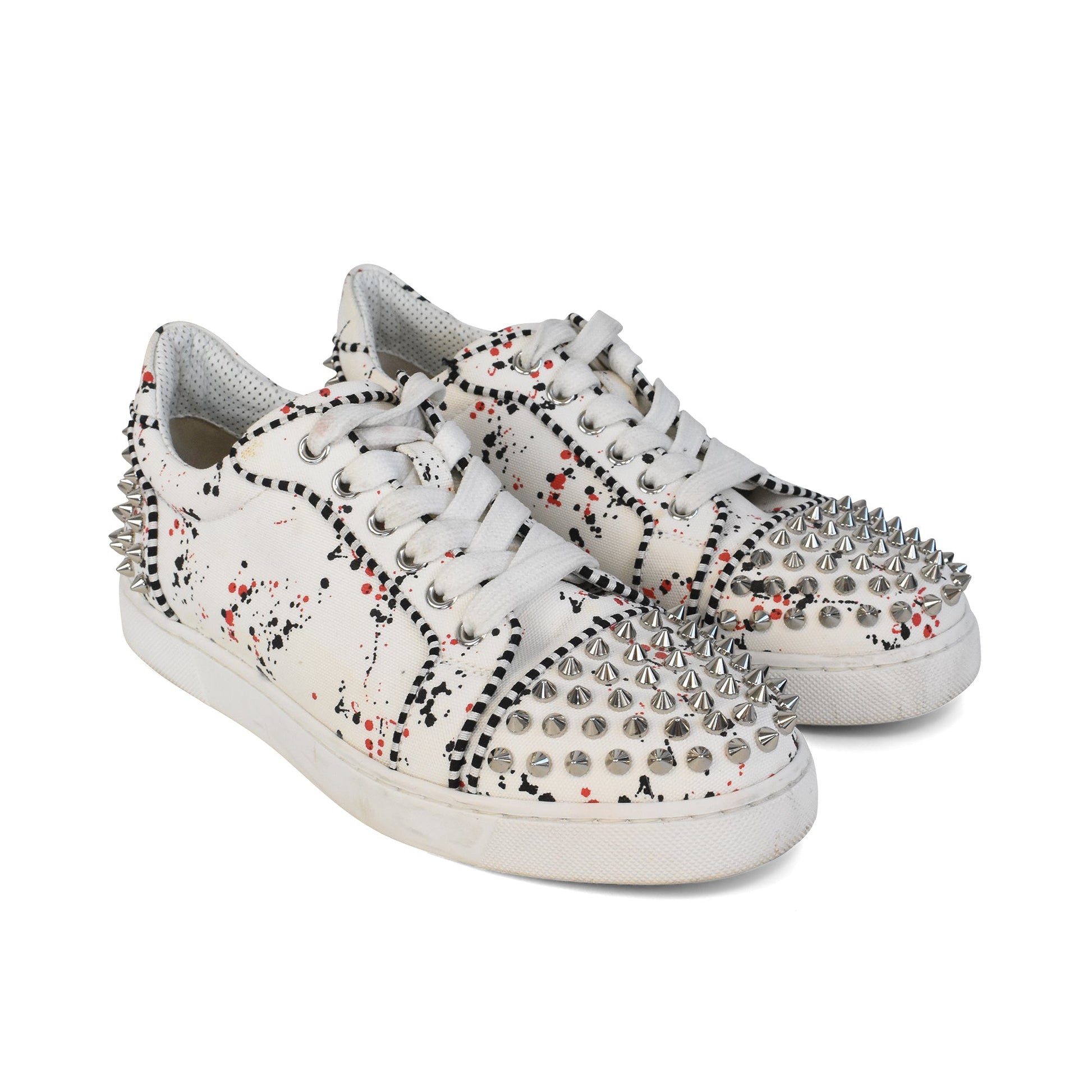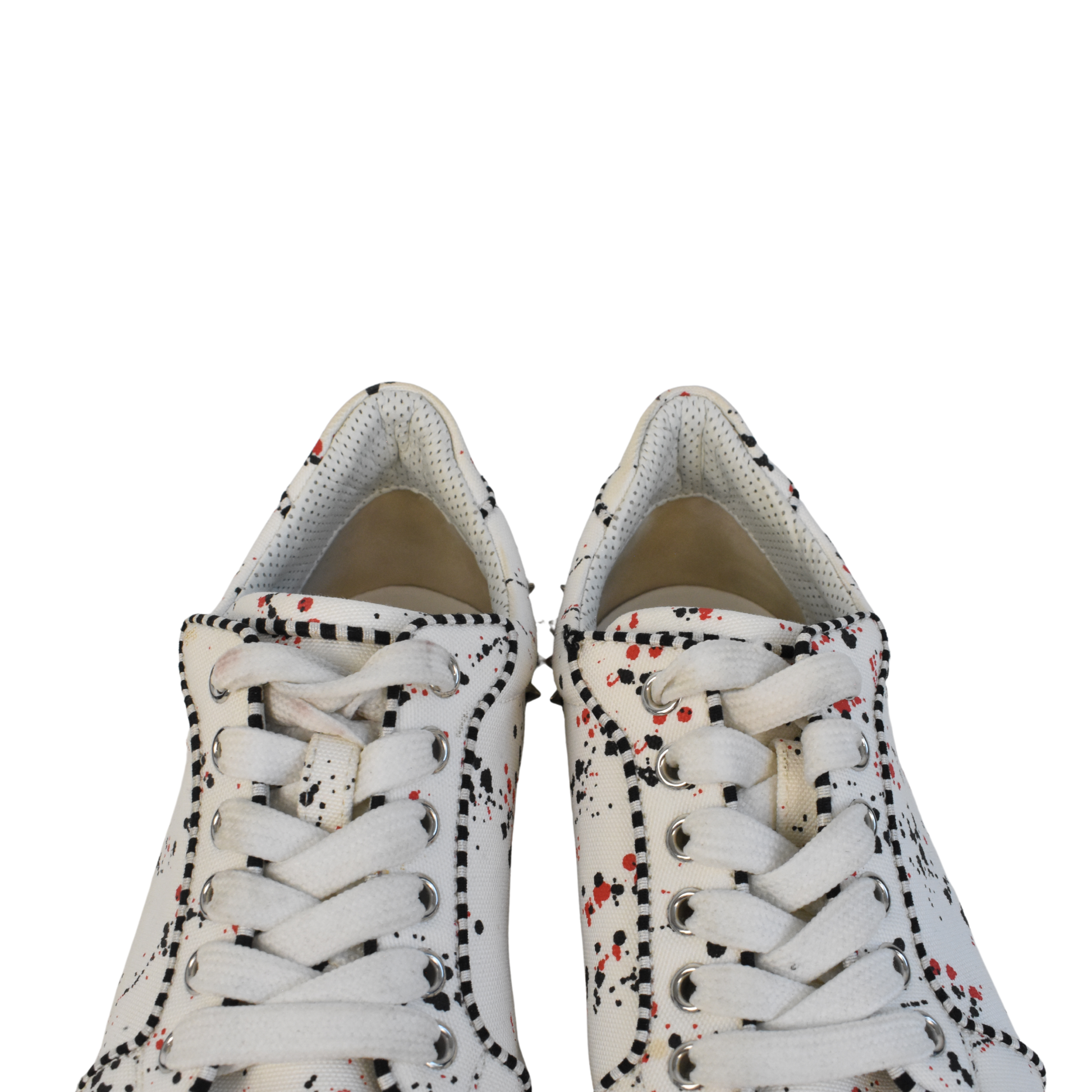 Christian Louboutin 'Vieira 2' sneakers in white canvas with an all over black and red paint splatter effect and silver pyramid studs on the toe.