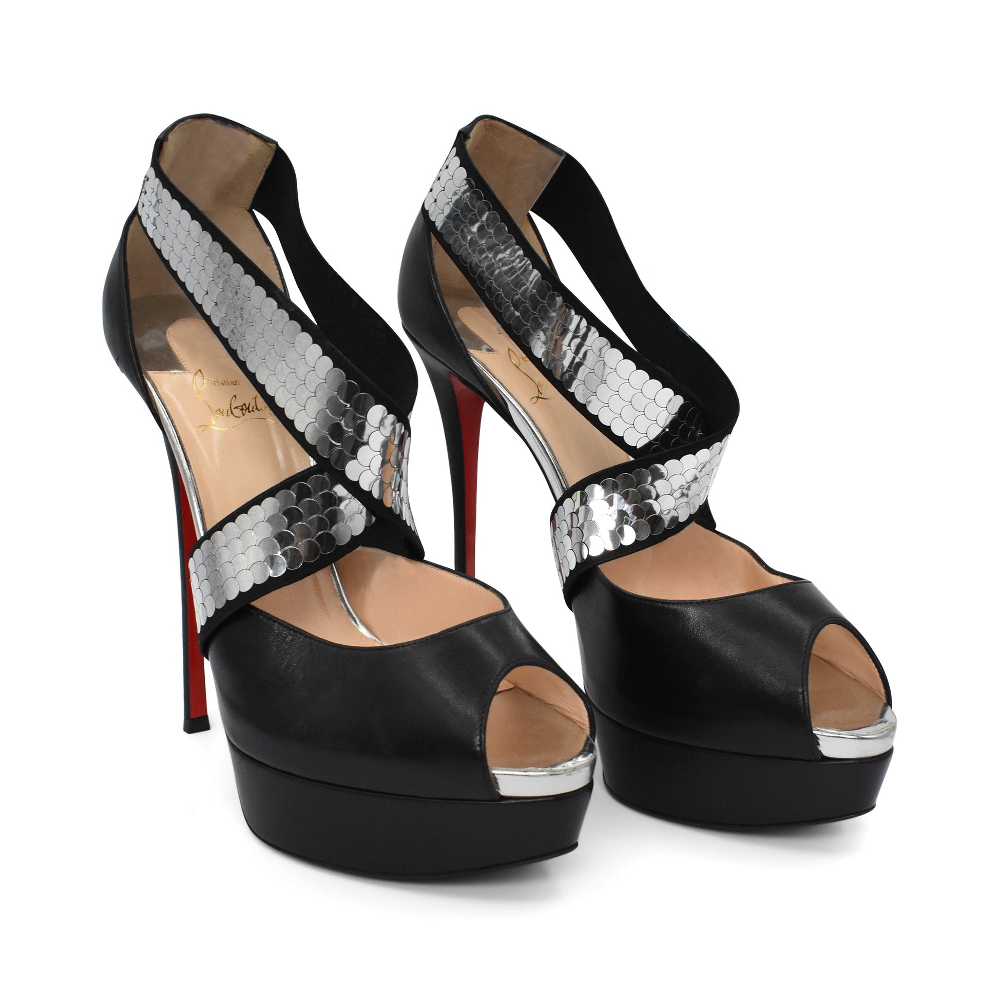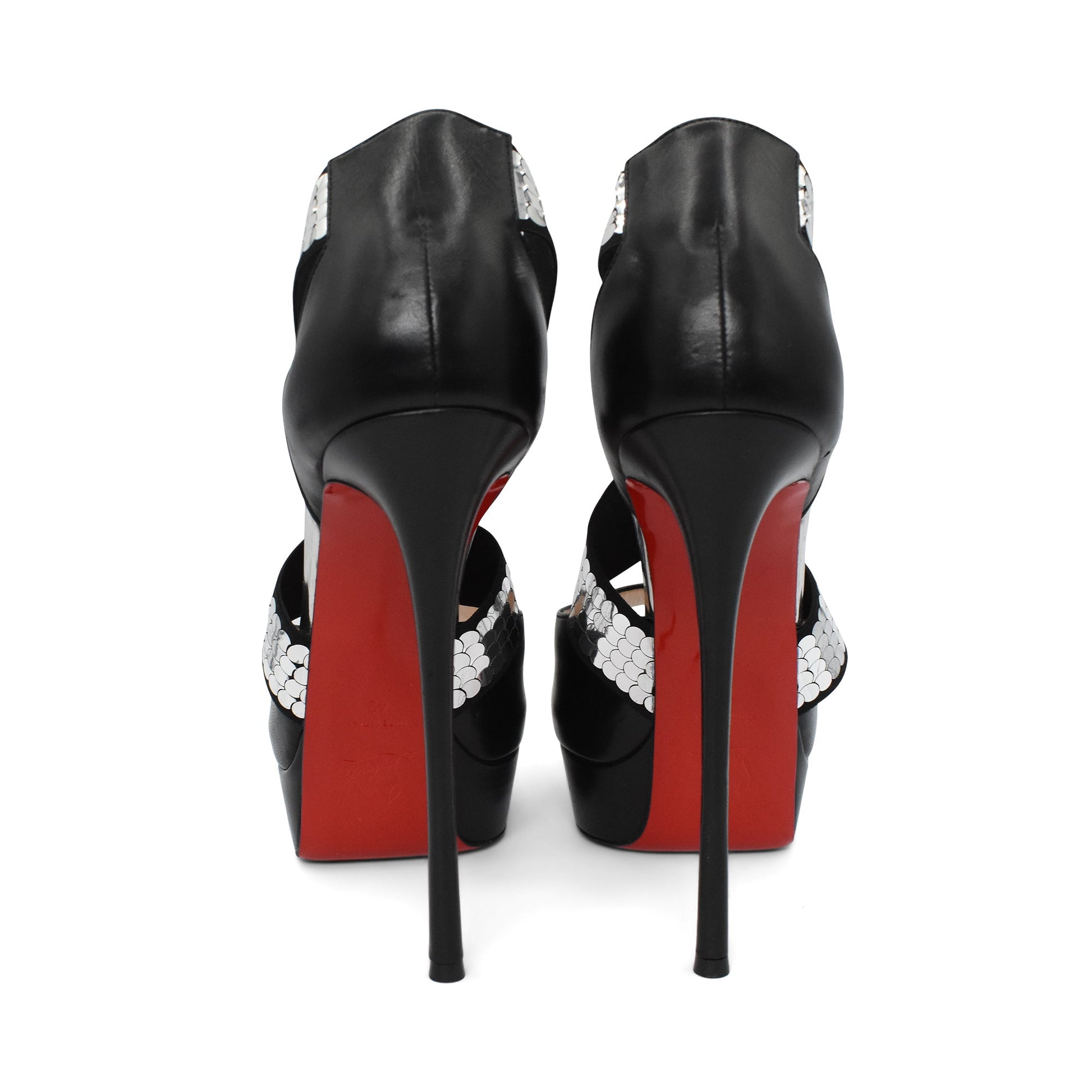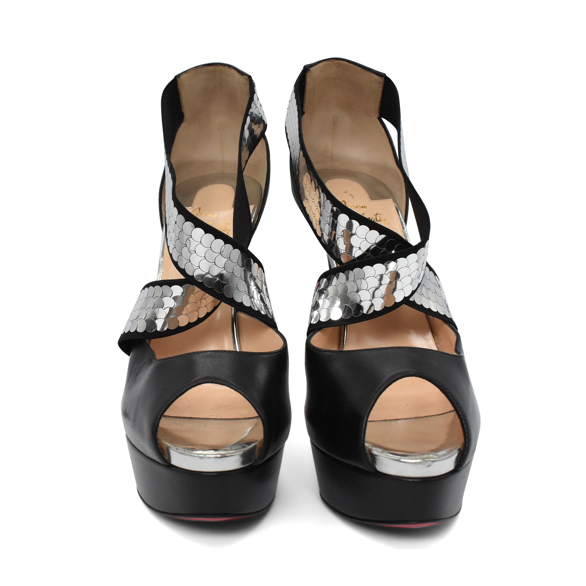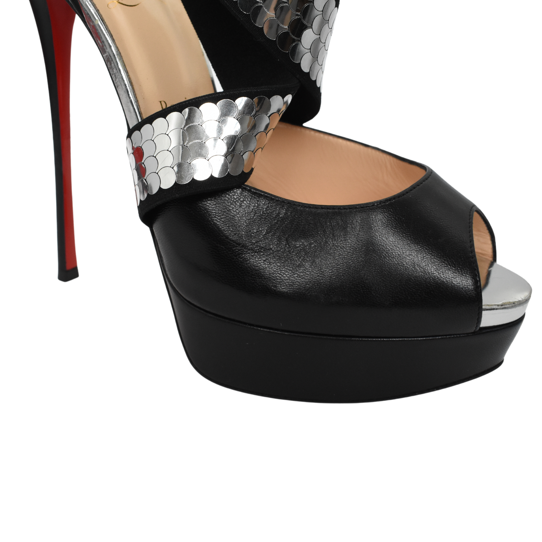 Christian Louboutin 'Xiletta' platform heels in black leather with an elastic crossover ankle strap covered in silver sequins, a tall stiletto heel, and a peep-toe.