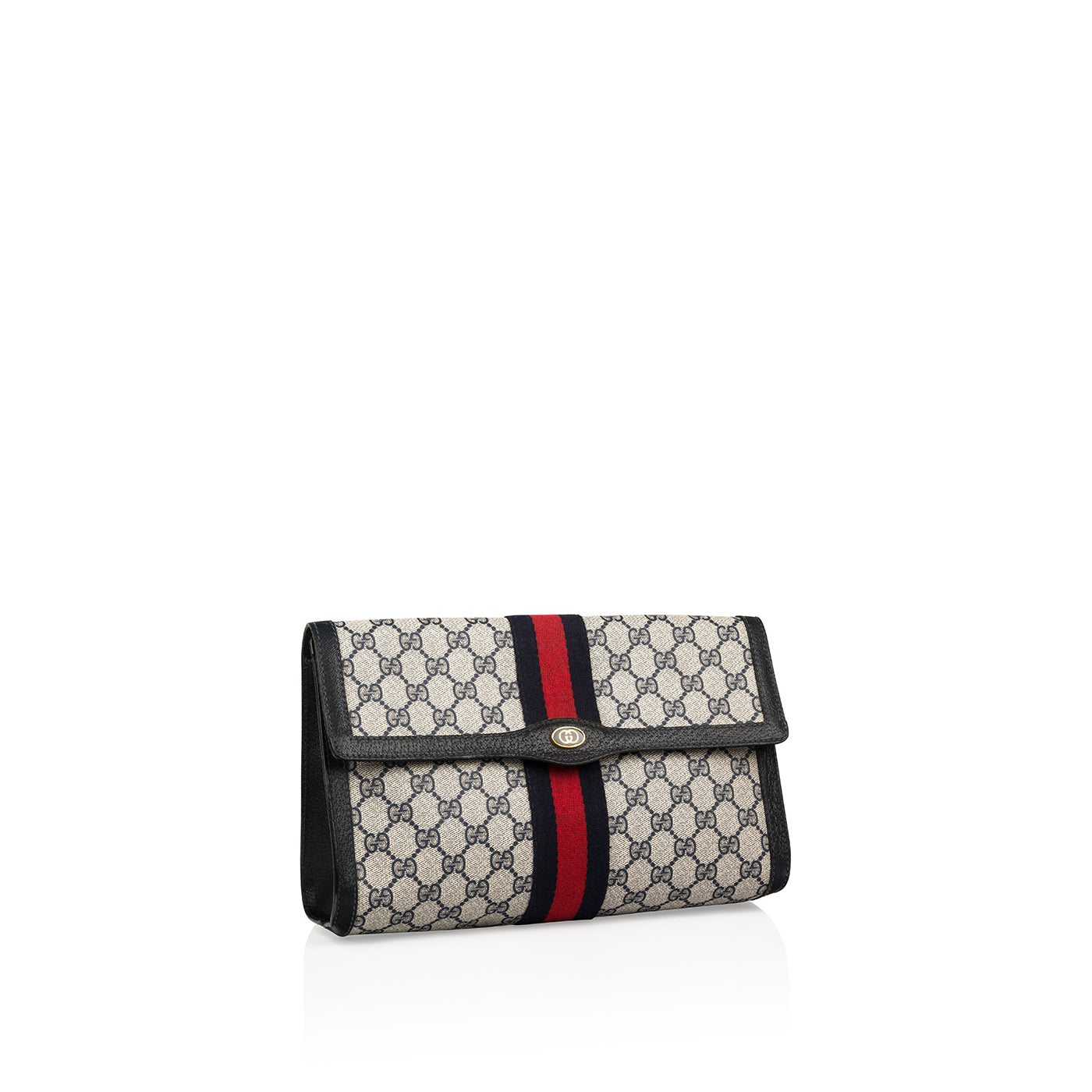 Go vintage with this adventurous Gucci Linea clutch. This gorgeous vintage clutch incorporates everything that we adore about Gucci; the monogram print, gold hardware and the vivid red we’ve come to associate so frequently with Gucci. With its bold, dark blue leather interior and incorporation of a large storage space, there’s no reason to worry about where to store your nose powder and compact mirror. Just throw it all in! Which makes it ideal for those lazy Sunday brunches by the river.