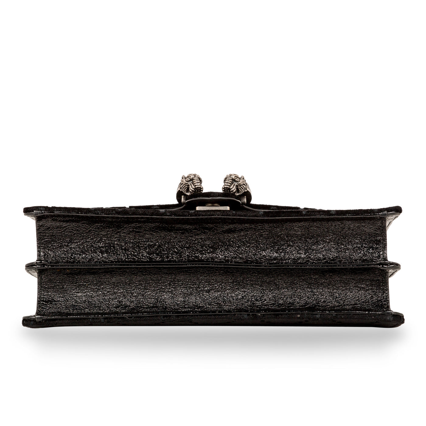 The very popular Gucci signature GG motif has been reworked in a luxurious black velvet. Made in Italy the Dionysus shoulder bag is suspended from a sliding chain that can be worn multiple ways. The tiger head is enriched with crystals remains an eye catching feature on this defining silhouette. The Dionysus is the perfect statement handbag to be added to any collection.