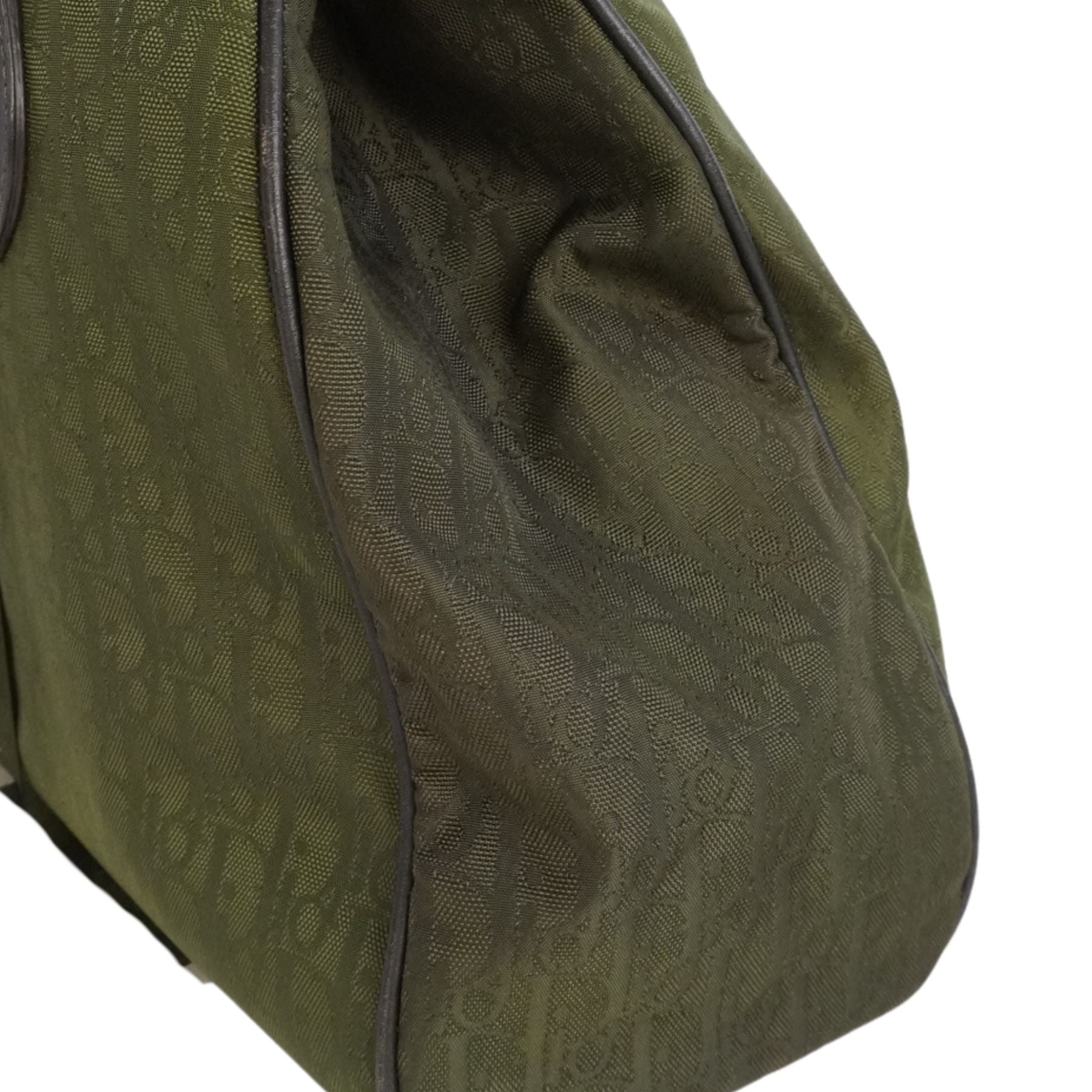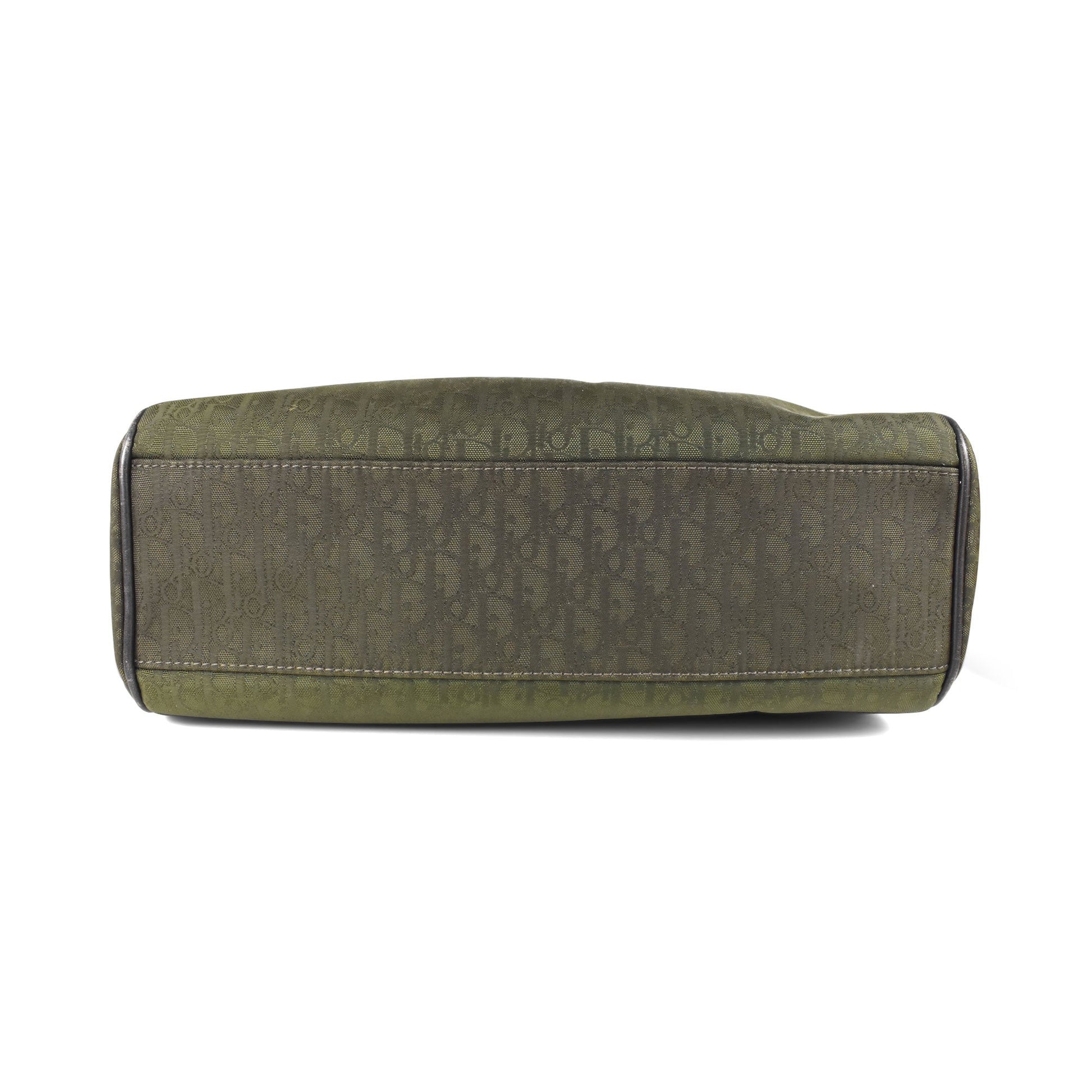 Dior 'Trotter' shoulder bag in army green canvas with an all-over tonal oblique logo pattern, brown leather trim, and wrapped leather handles. The bag has a silver logo charm on the front, a top-clip closure, and a green canvas inner lining with zip and slip pockets.