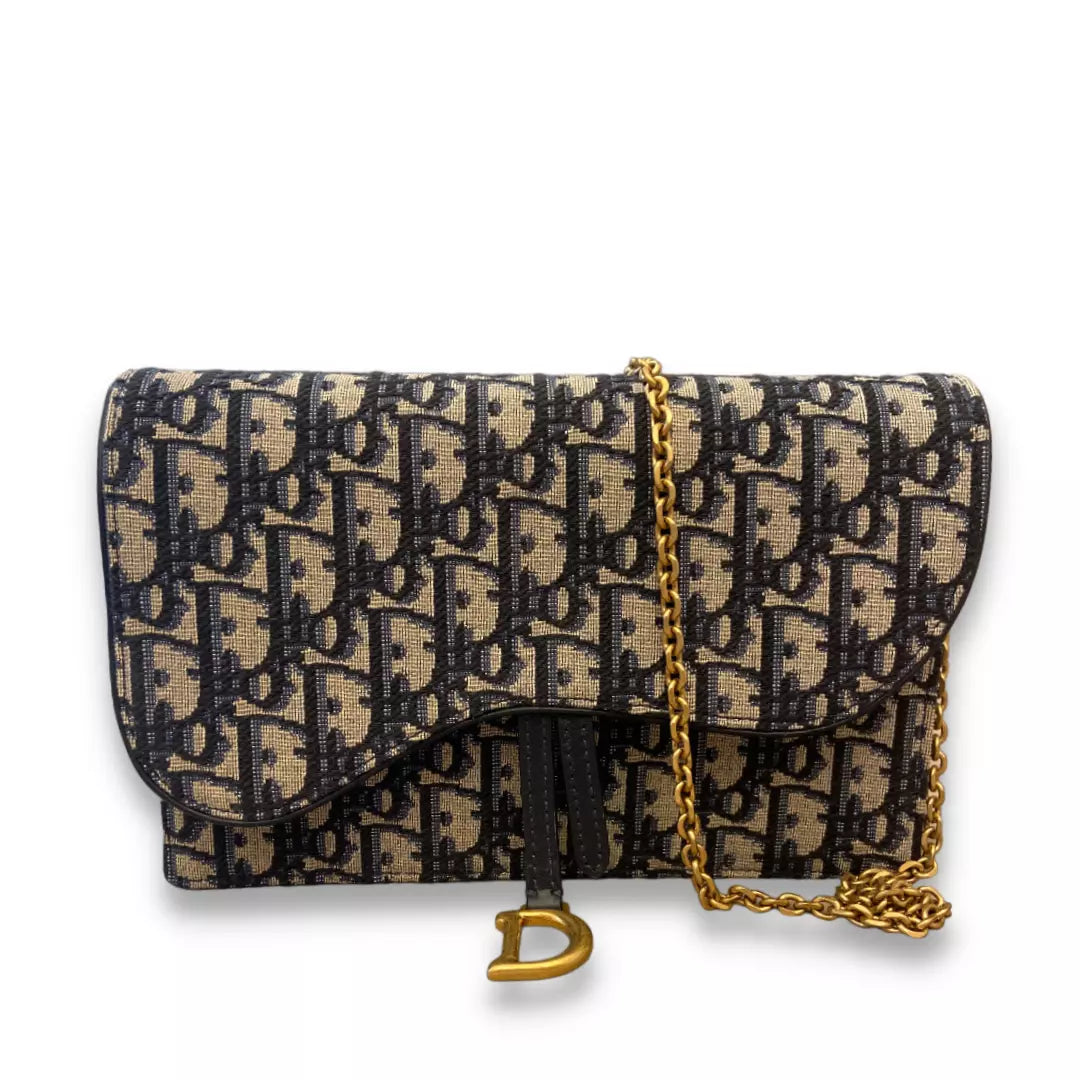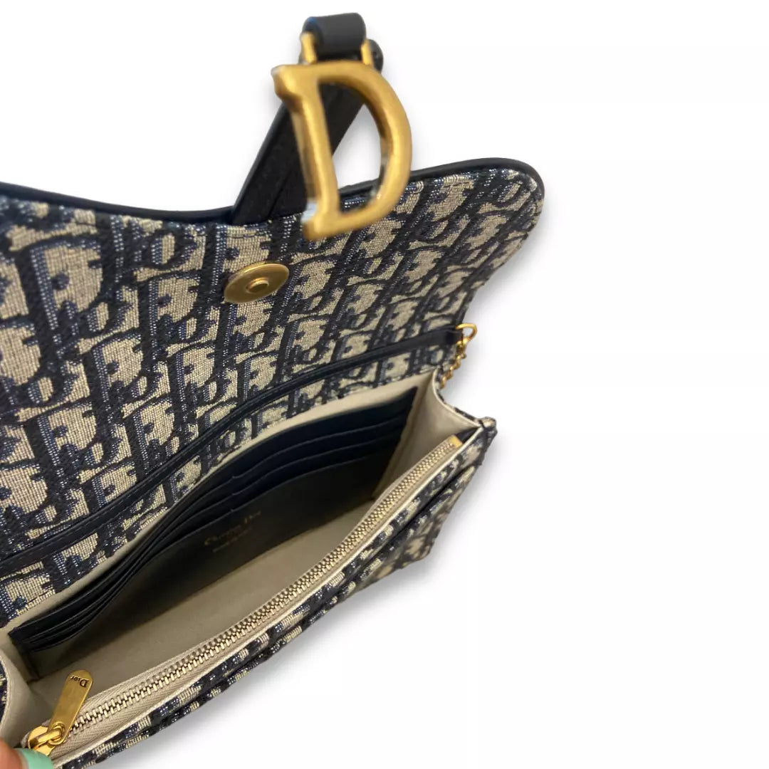 Long Saddle chain wallet, crafted in blue Dior Oblique jacquard. The wallet features a removable chain strap. It may be carried by hand, over the shoulder or crossbody.