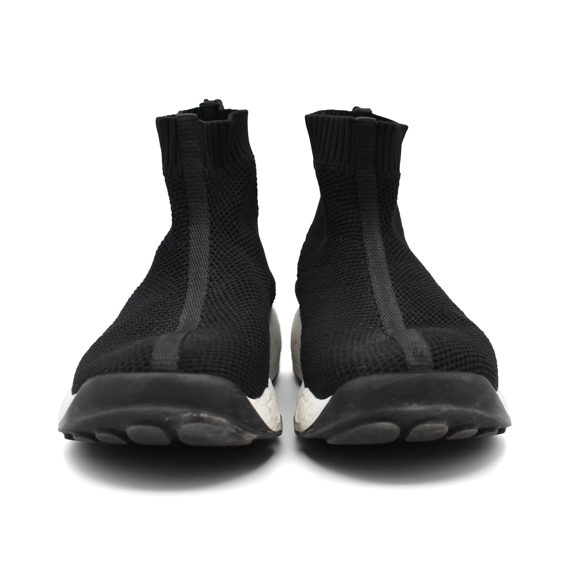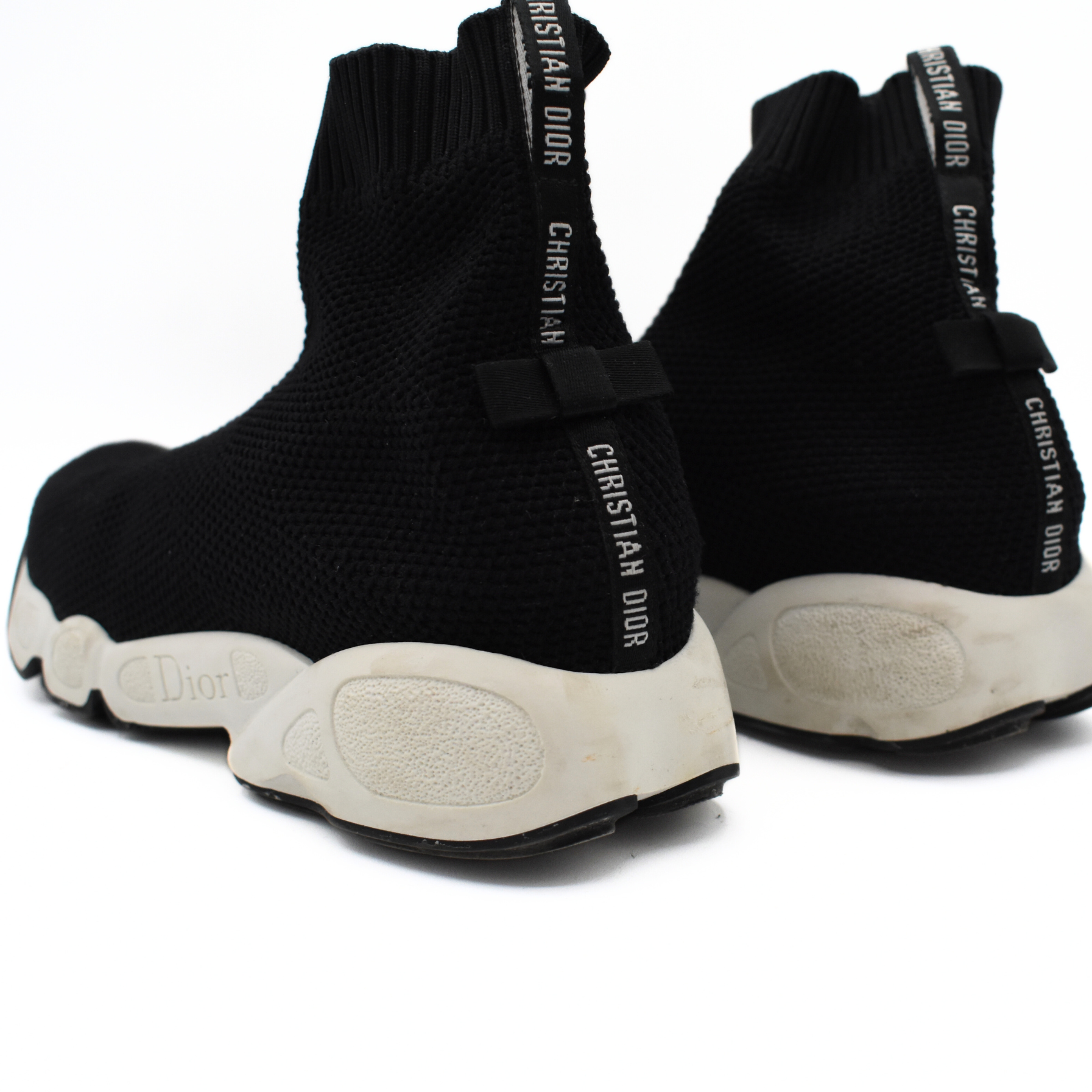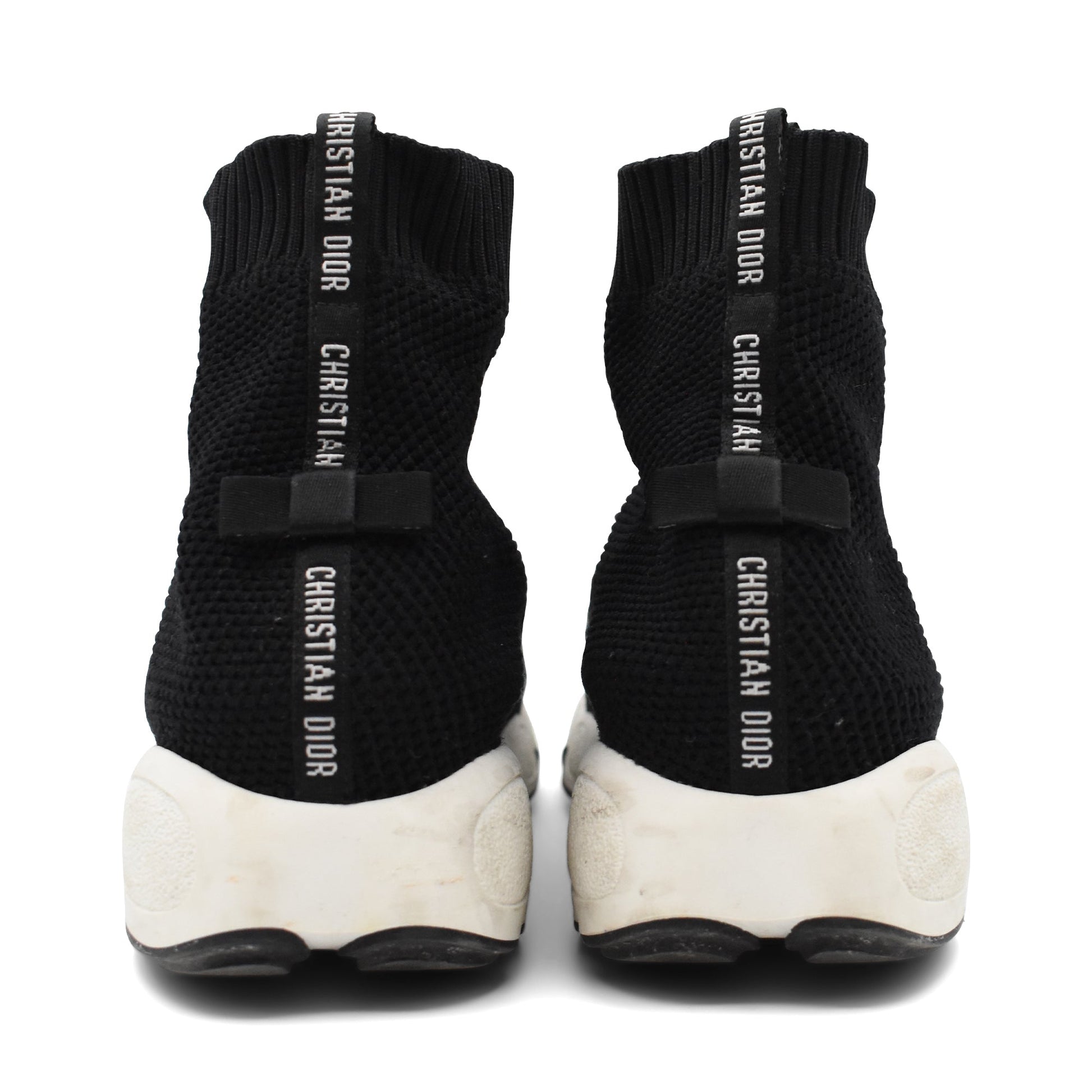 Dior 'Fusion' sock sneakers in black mesh with a white rubber sole and a monogram logo trim on the back heel with a bow detail.