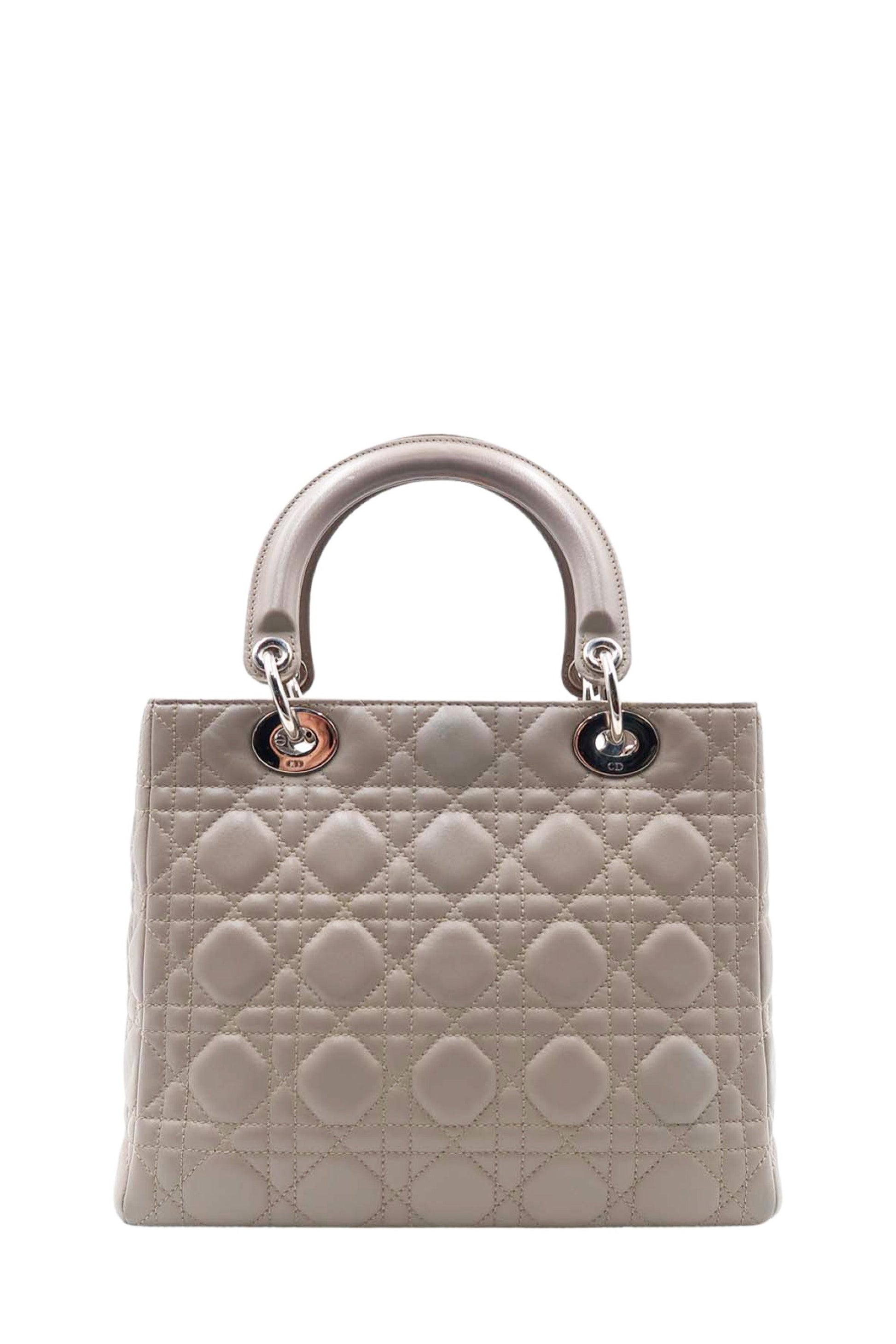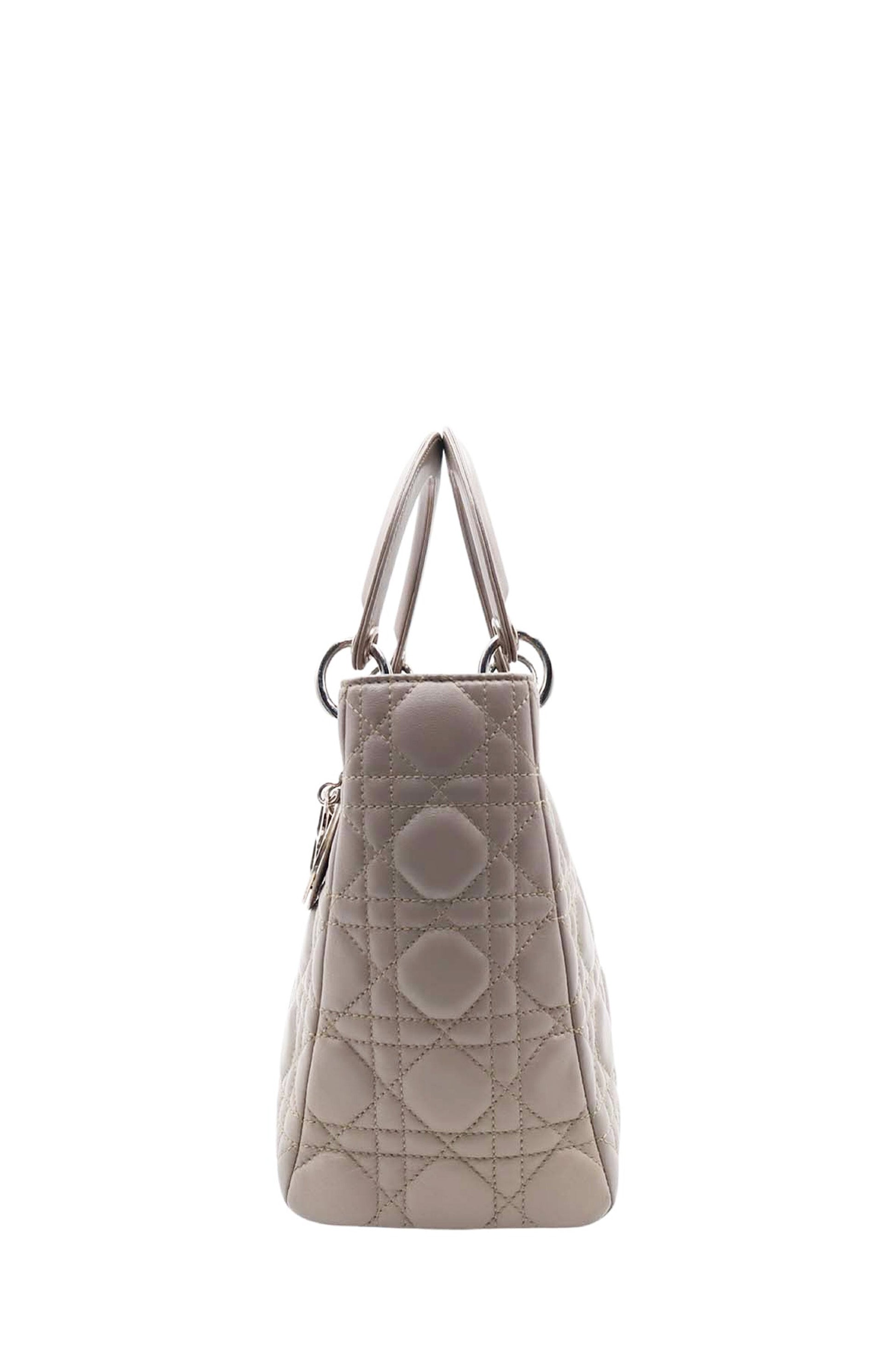 The Lady Dior bag epitomizes Dior's vision of elegance and beauty. Refined and sophisticated, the timeless yet relevant style is crafted in grey lambskin with Cannage stitching, creating the instantly recognizable quilted texture. The silver-finish metal 'D.I.O.R.' charms further embellish the silhouette.