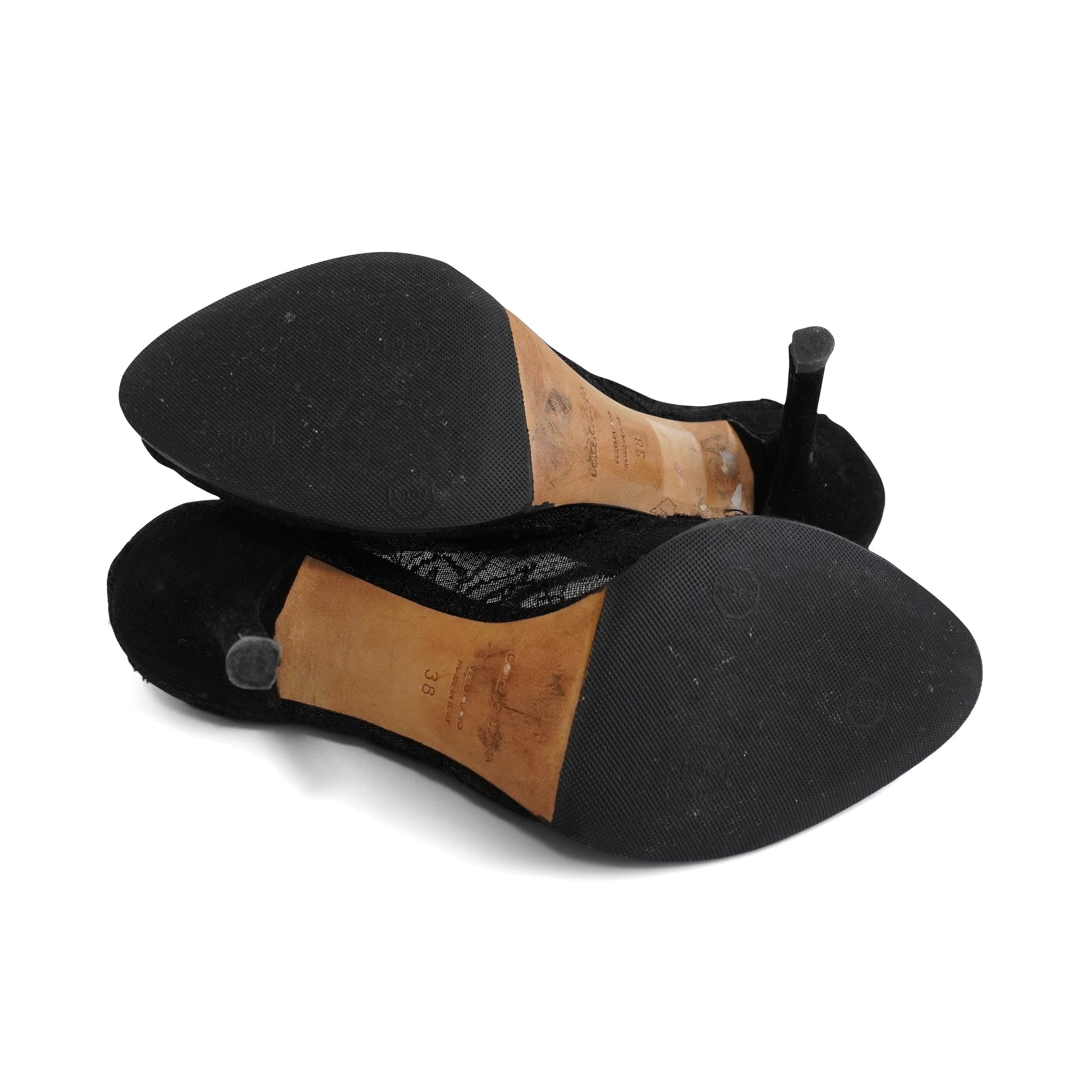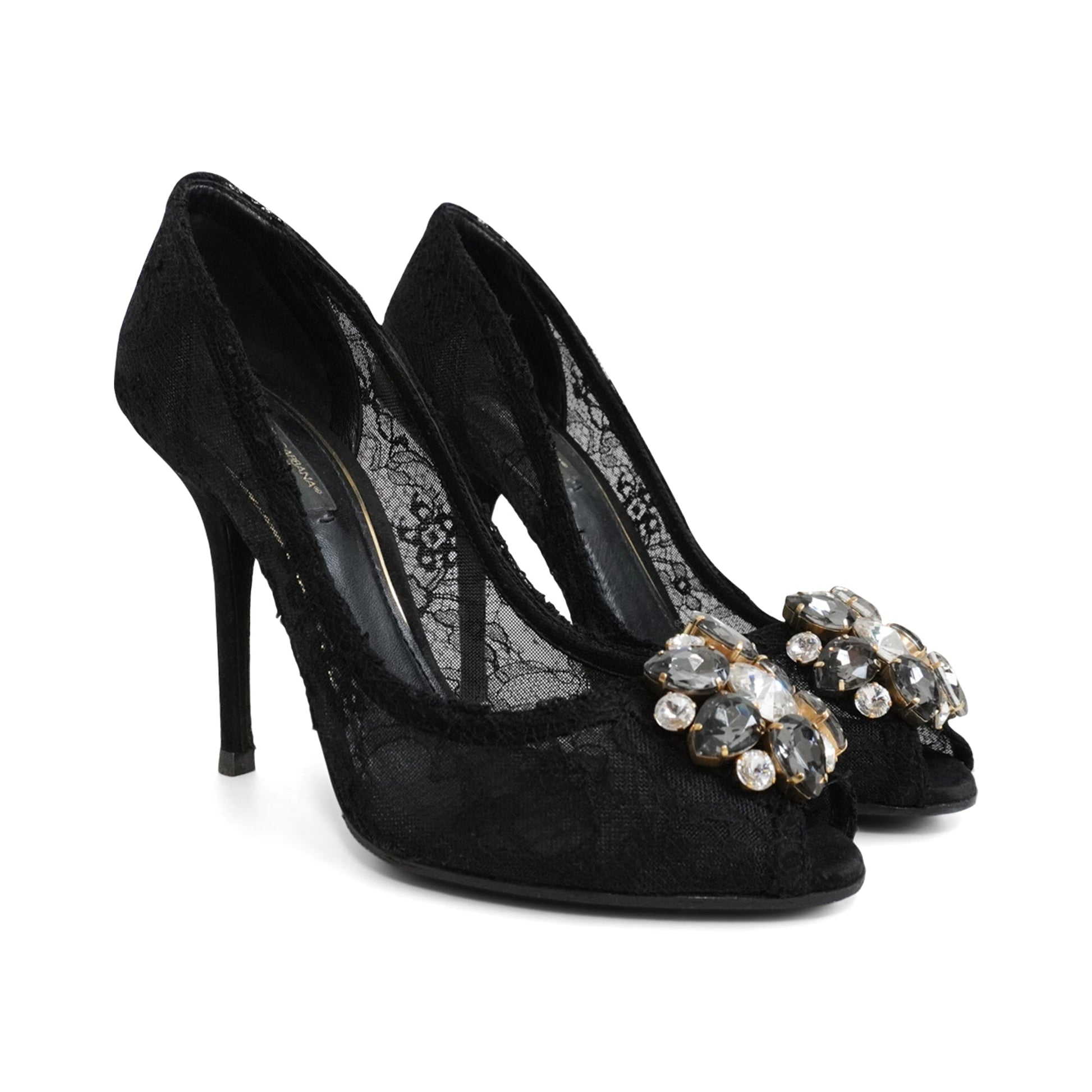 Dolce & Gabbana 'Bellucci Crystal' peep toe pumps in black lace with black suede heels. Feature white and grey crystal embellishments in a gold setting.