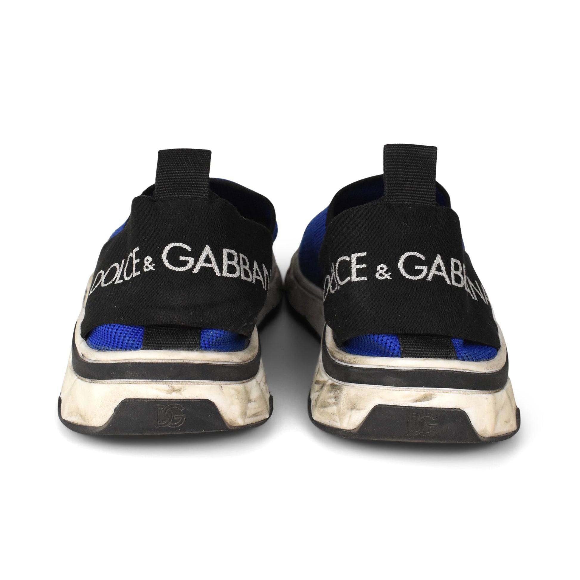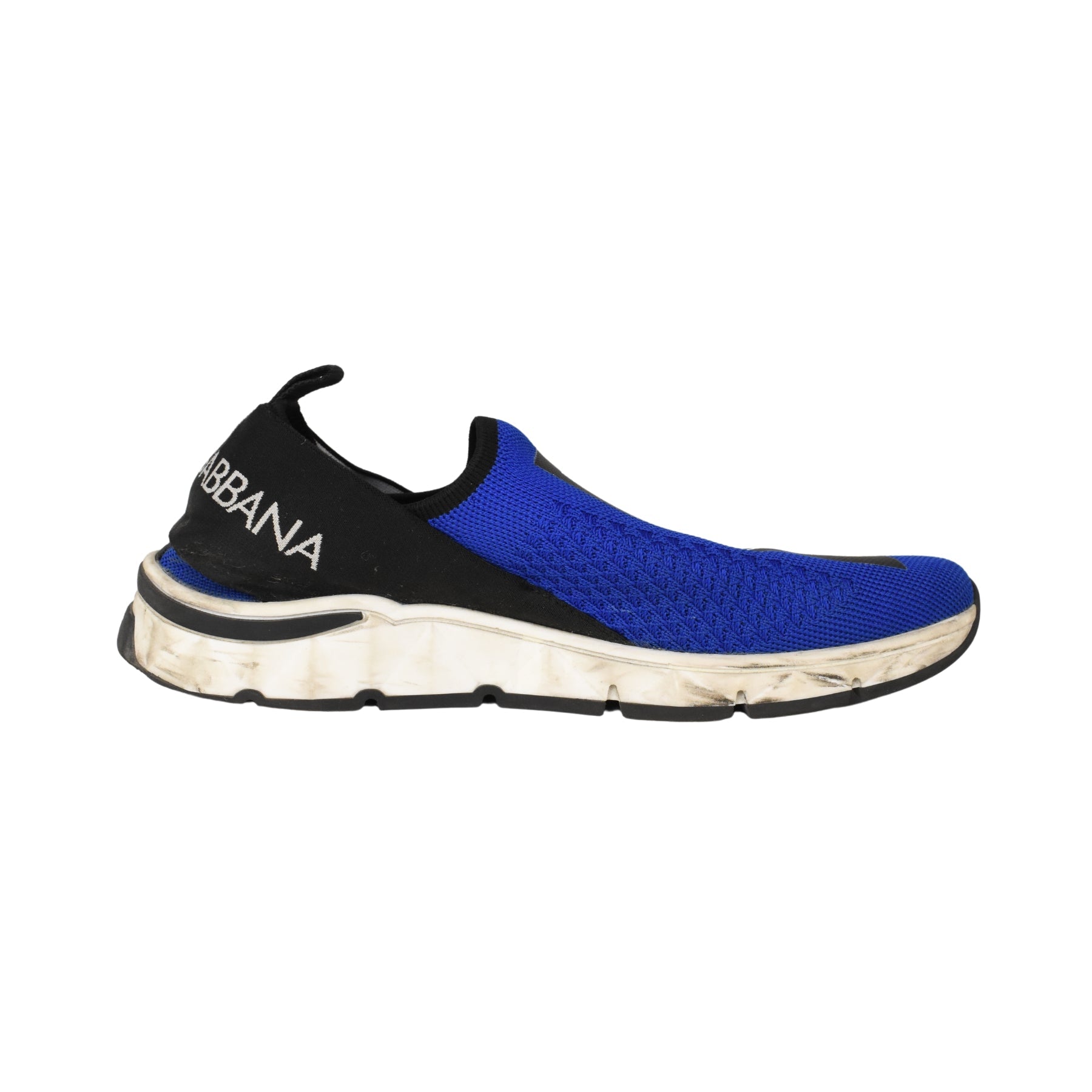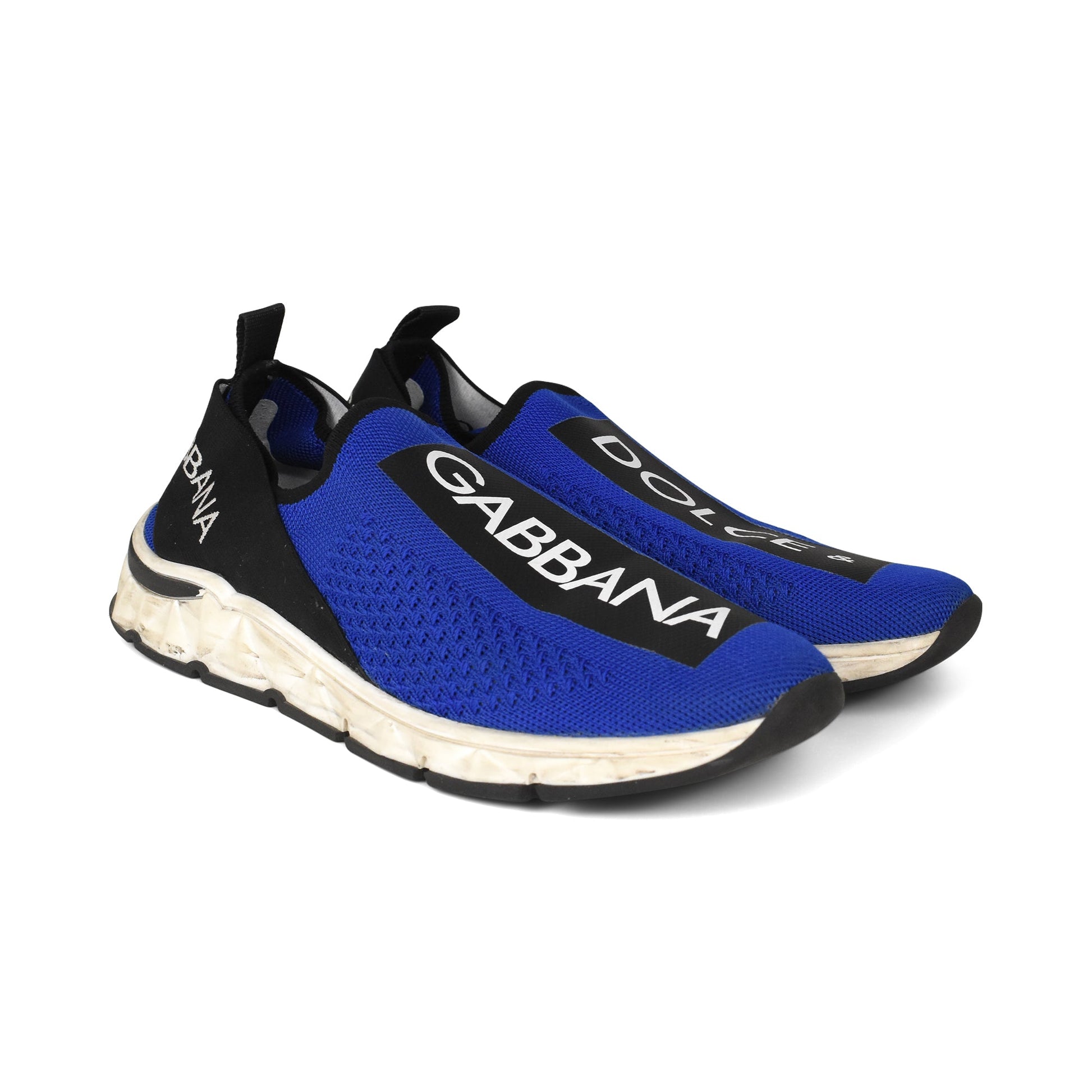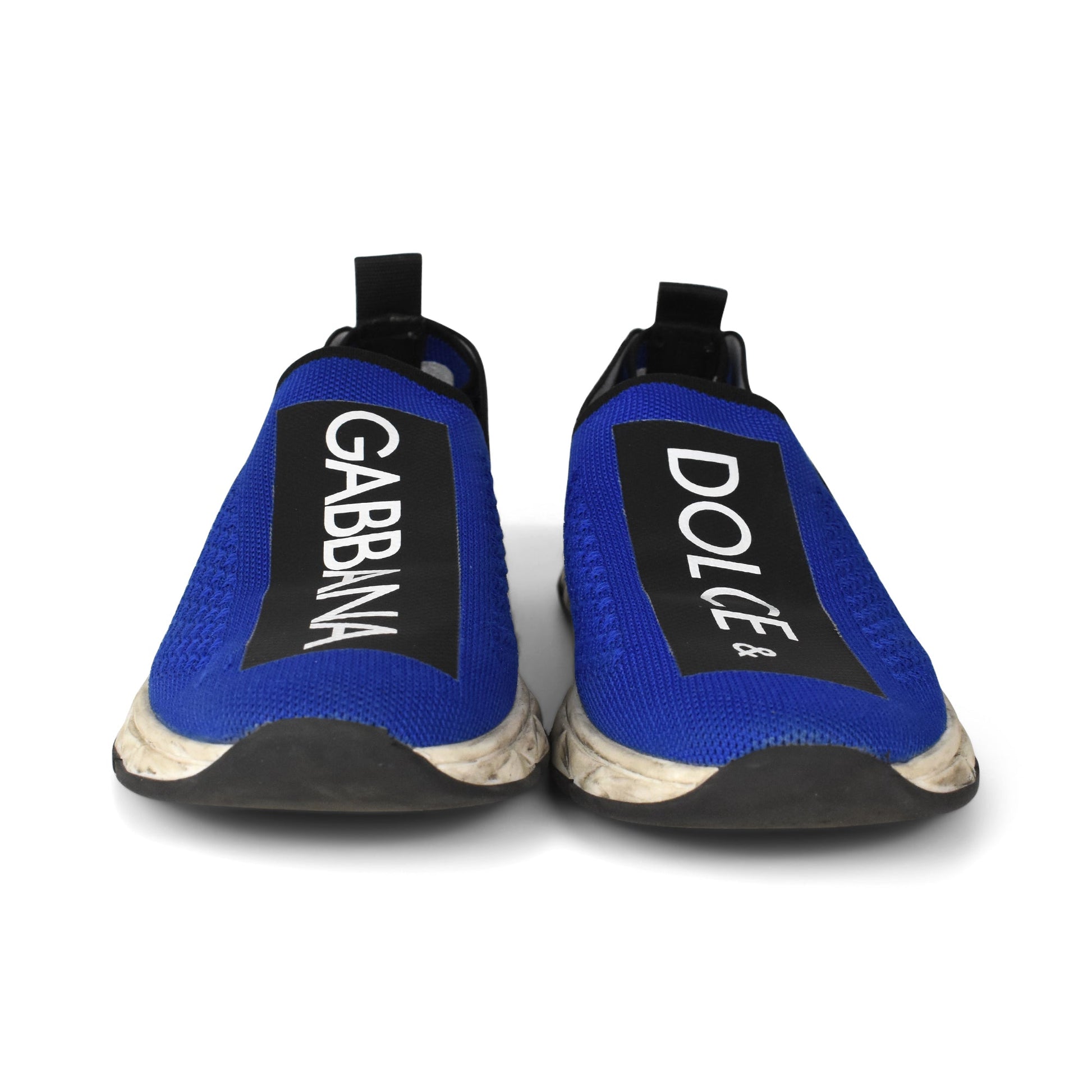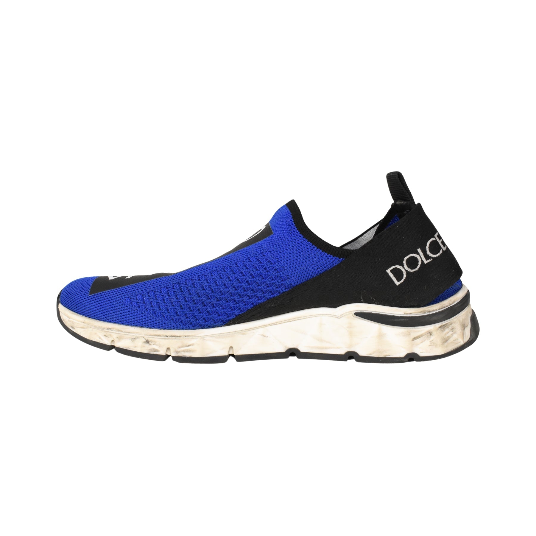 Dolce & Gabbana 'Sorrento' Slip-On Sneakers are in blue knit with a white and black printed logo patch on the upper and a black stretch knit logo on the heel.