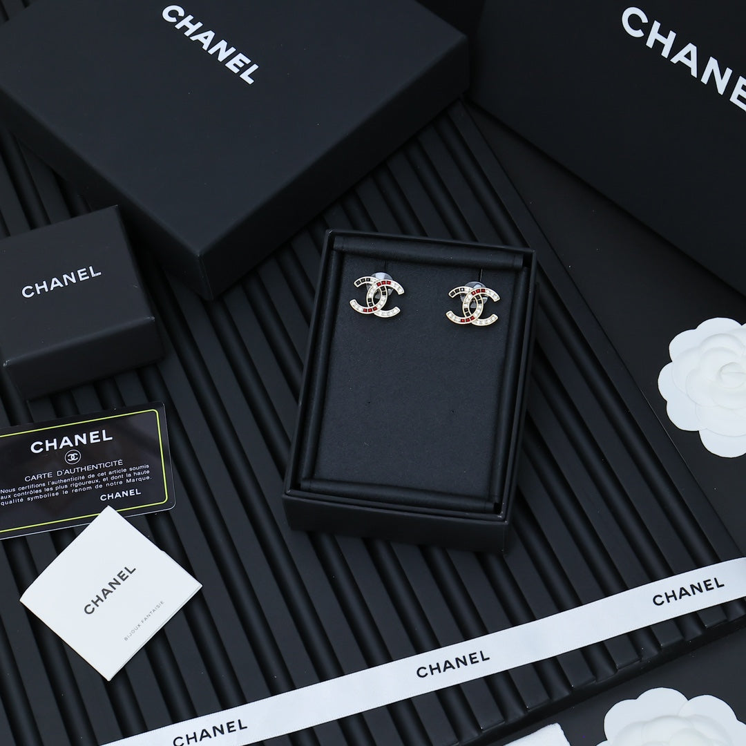 DOUBLE C STUD EARRINGS IN LIGHT GOLD METAL WITH MULTICOLOR CRYSTALS