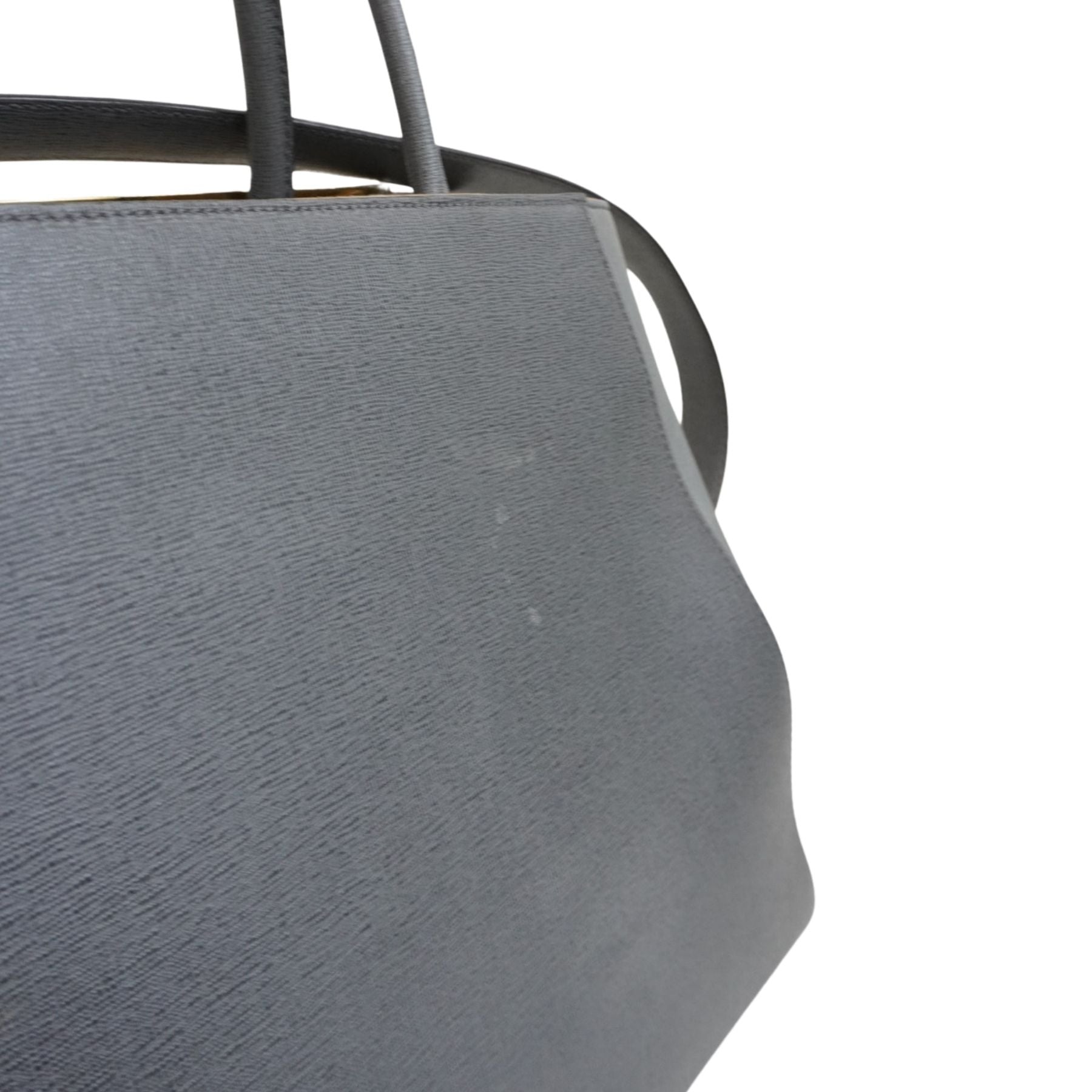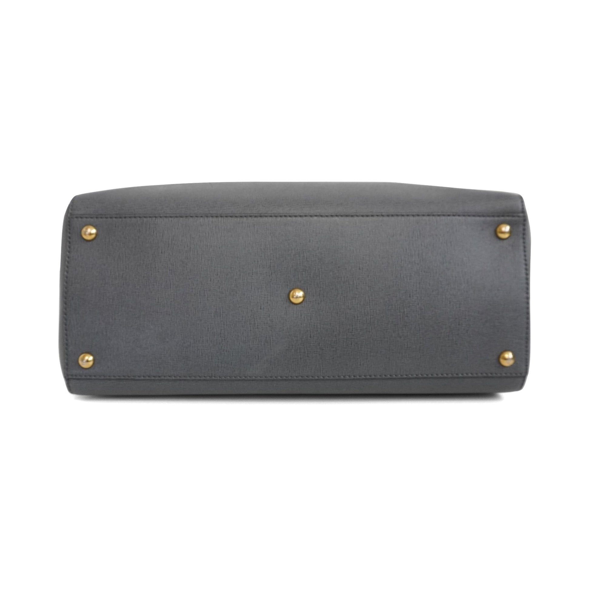 Fendi '2Jours' handbag in grey textured leather with grain leather gussets and gold hardware. Features an enamel logo bar on the front with decorative luggage tag. The interior has a snap button closure and two open pockets divided by a zip pocket in the middle. Includes a removable leather shoulder strap.