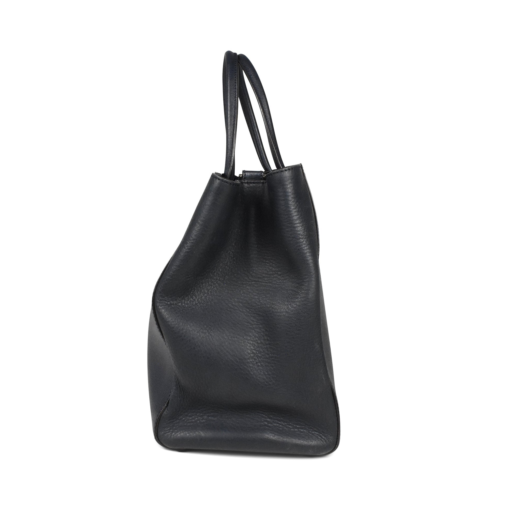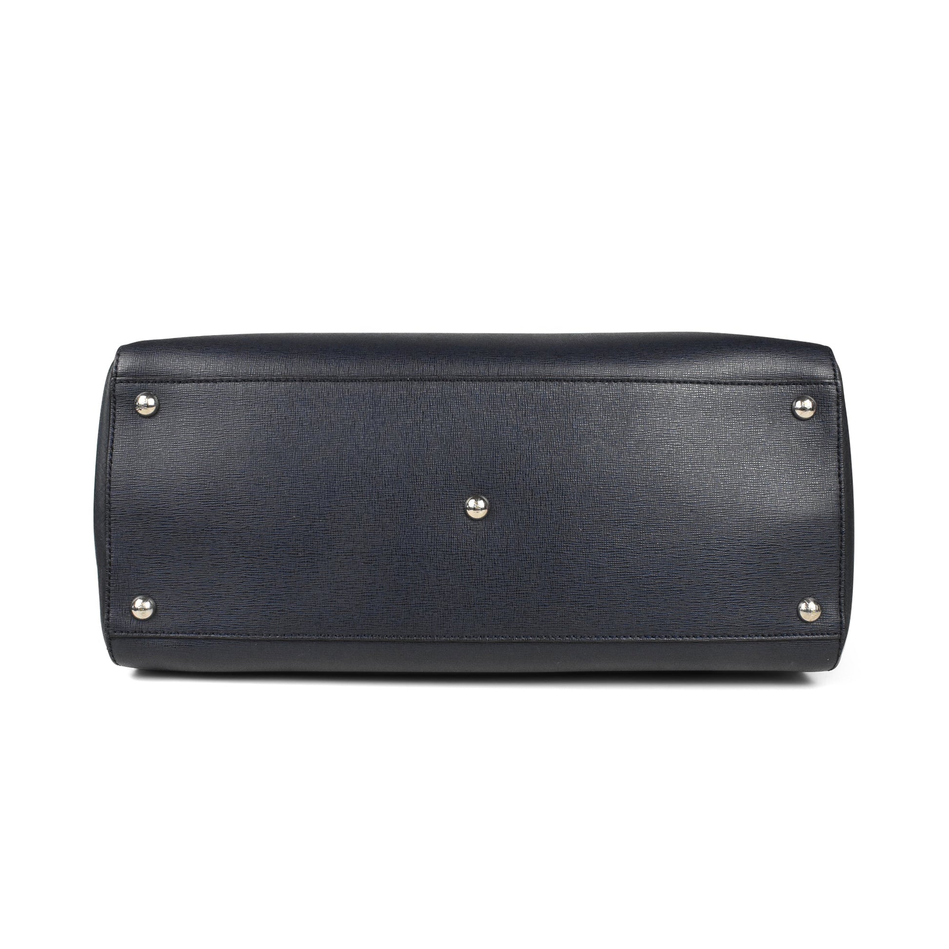 Fendi '2Jours' handbag in navy grained leather with dual rolled top handles, a removable crossbody strap, and a top snap closure in silver hardware. The front of the bag features a silver metal trim with a blue enamel inlay and a removable keychain attachment. The interior is lined with blue suede and has dual storage compartments with a large centre zip pocket.