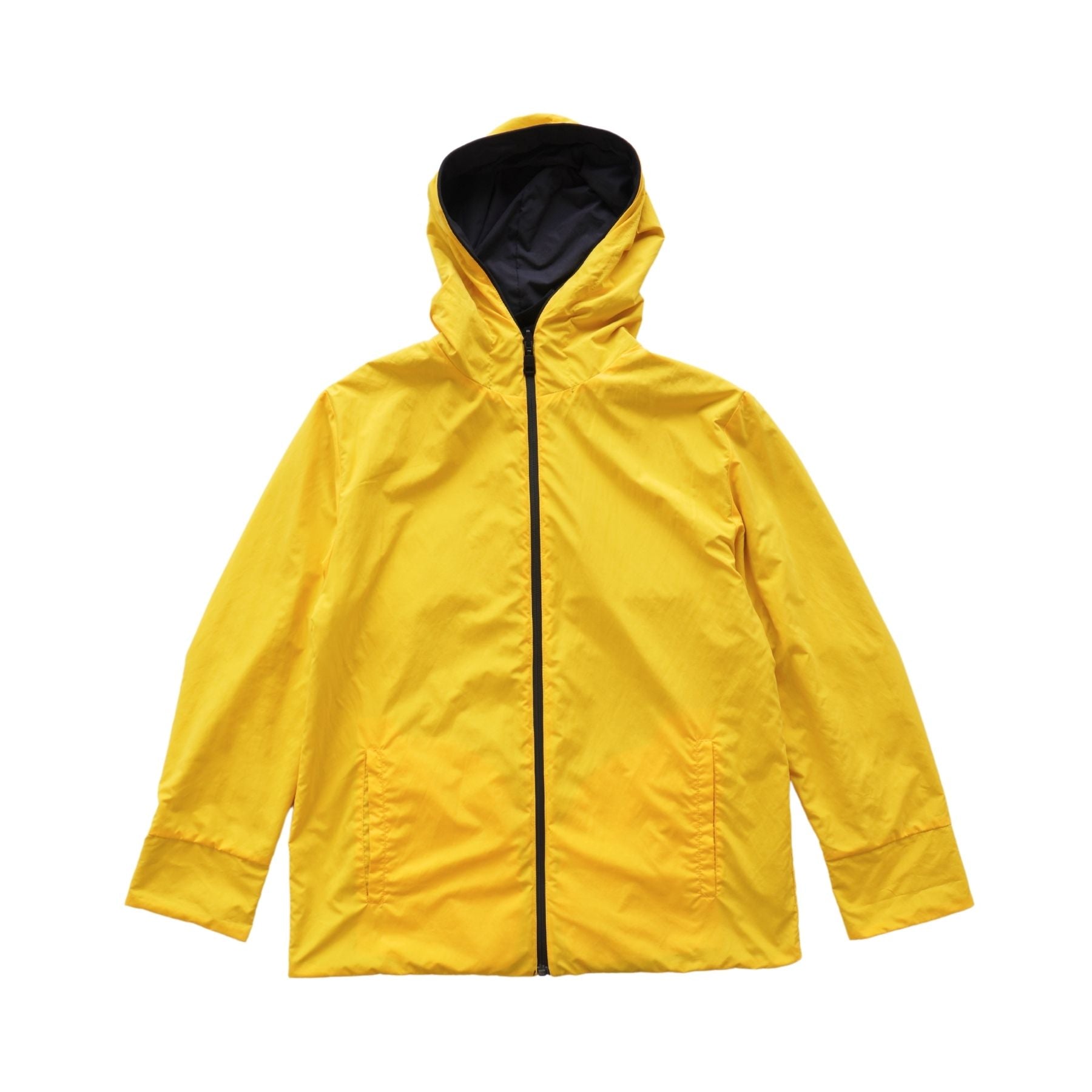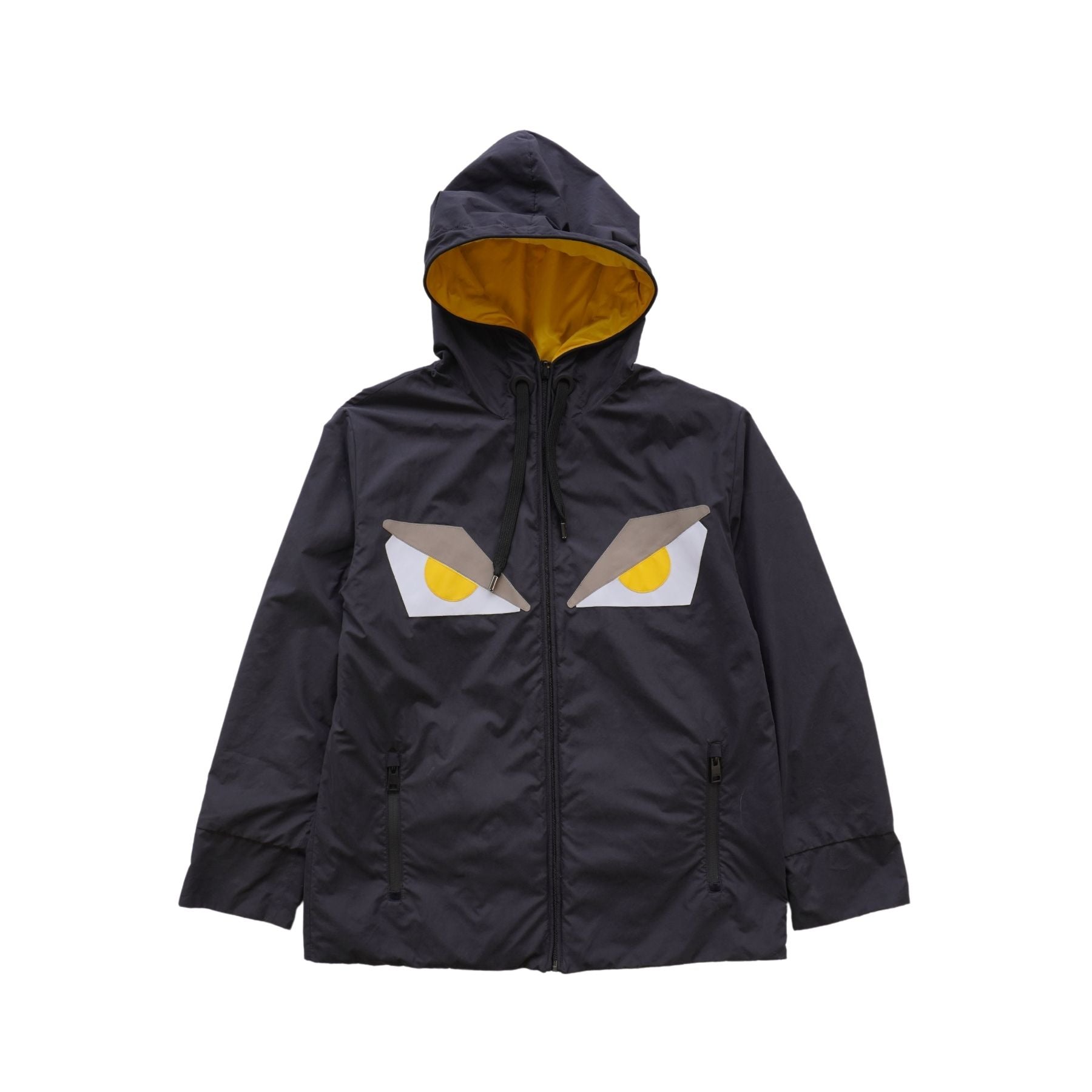 Fendi 'Monster' Reversible Jacket in black wind material with signature eye detail and yellow reversible side. Features a hood, zip closure in black hardware, and open pockets.