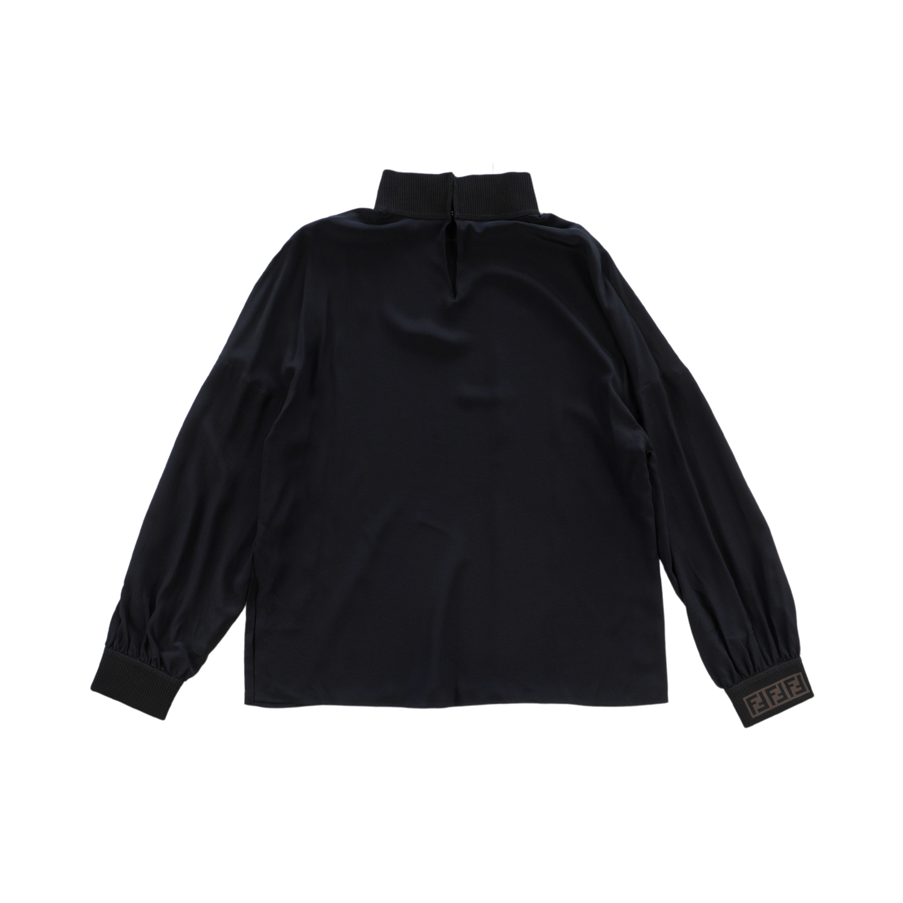 Fendi long-sleeve sheer blouse in black silk with a ribbed neckline and sleeve cuffs. Features a mock neck, brown monogram logo patch on right cuff, slightly ballooned sleeves, side slits, and a button closure on the back.