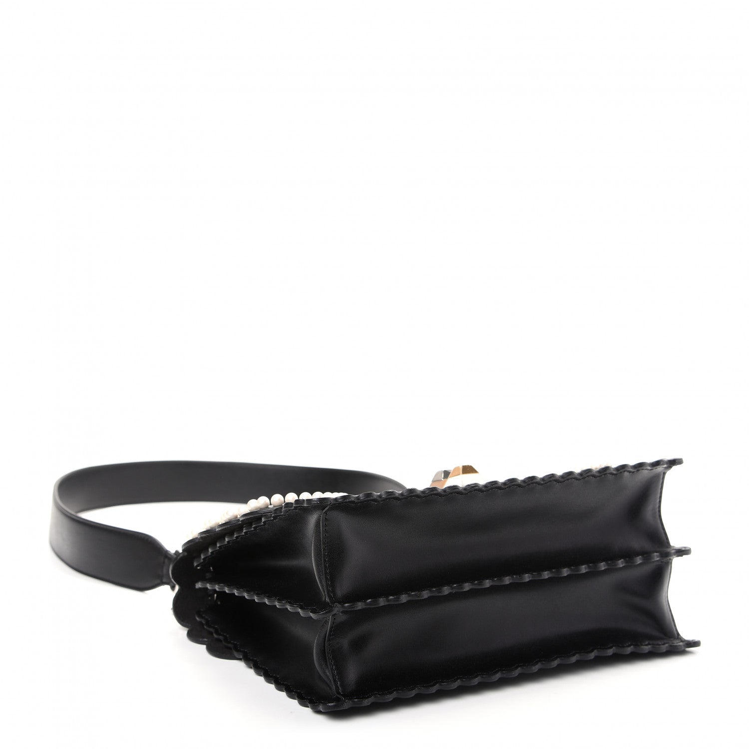 crafted of smooth calfskin leather in black. This shoulder bag features a design of faux pearls, floral embroidery, a black leather shoulder strap, and a beige and white pyramid stud closure. This opens to a partitioned black suede interior with a small patch pocket.