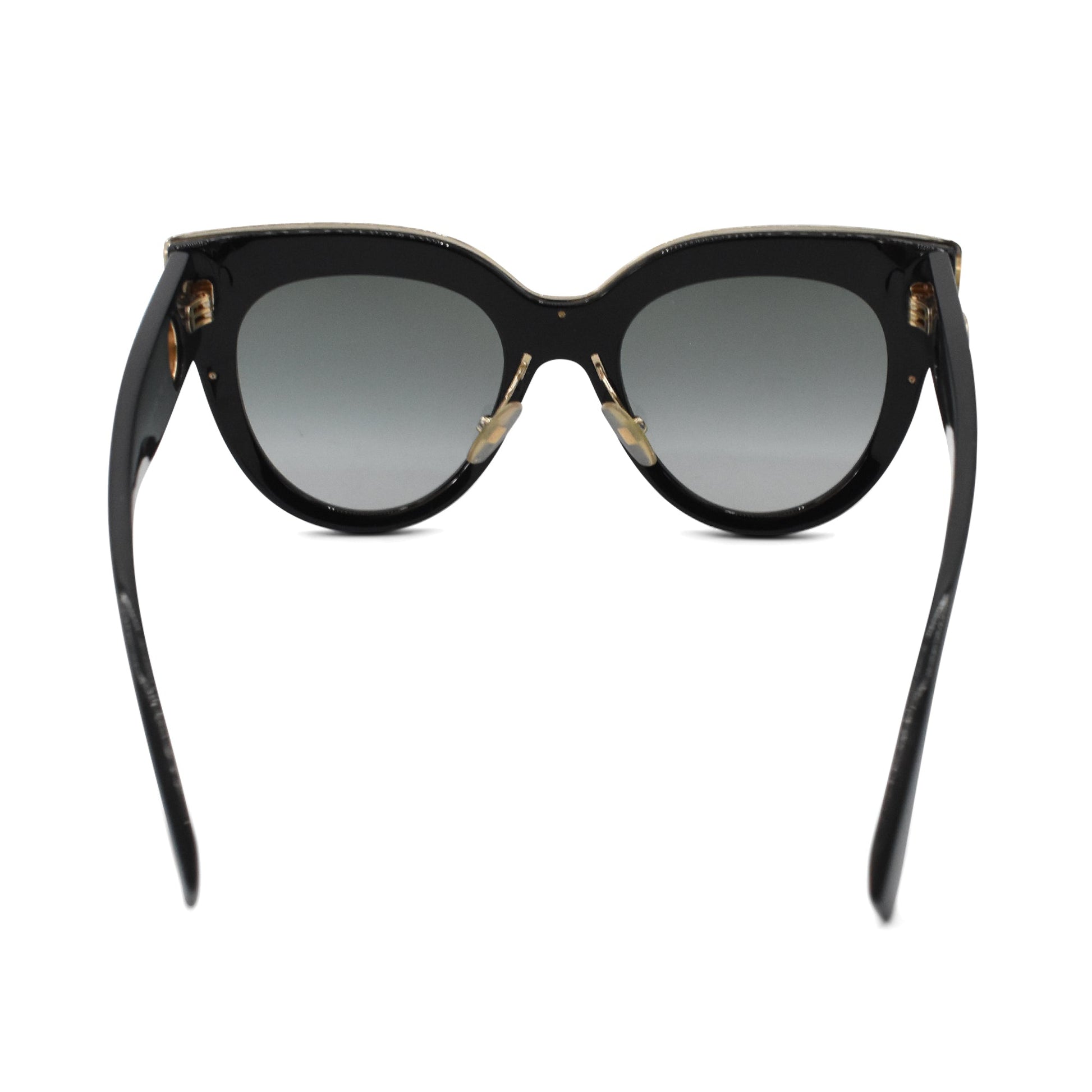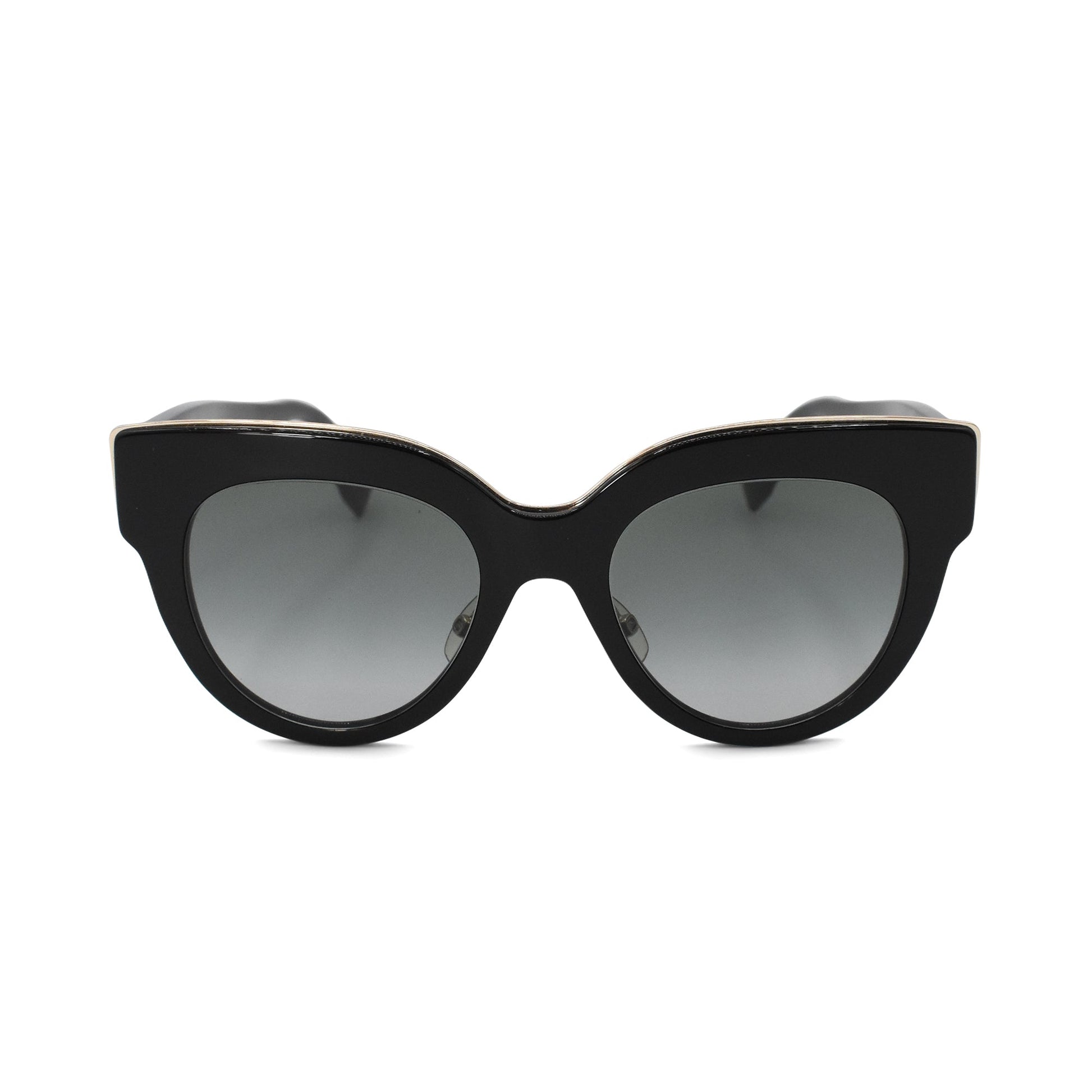 Fendi 'F Is Fendi' sunglasses in black acetate with a cat-eye lens, gold metal trim, and a gold 'FF' zucca cutout on the arms.