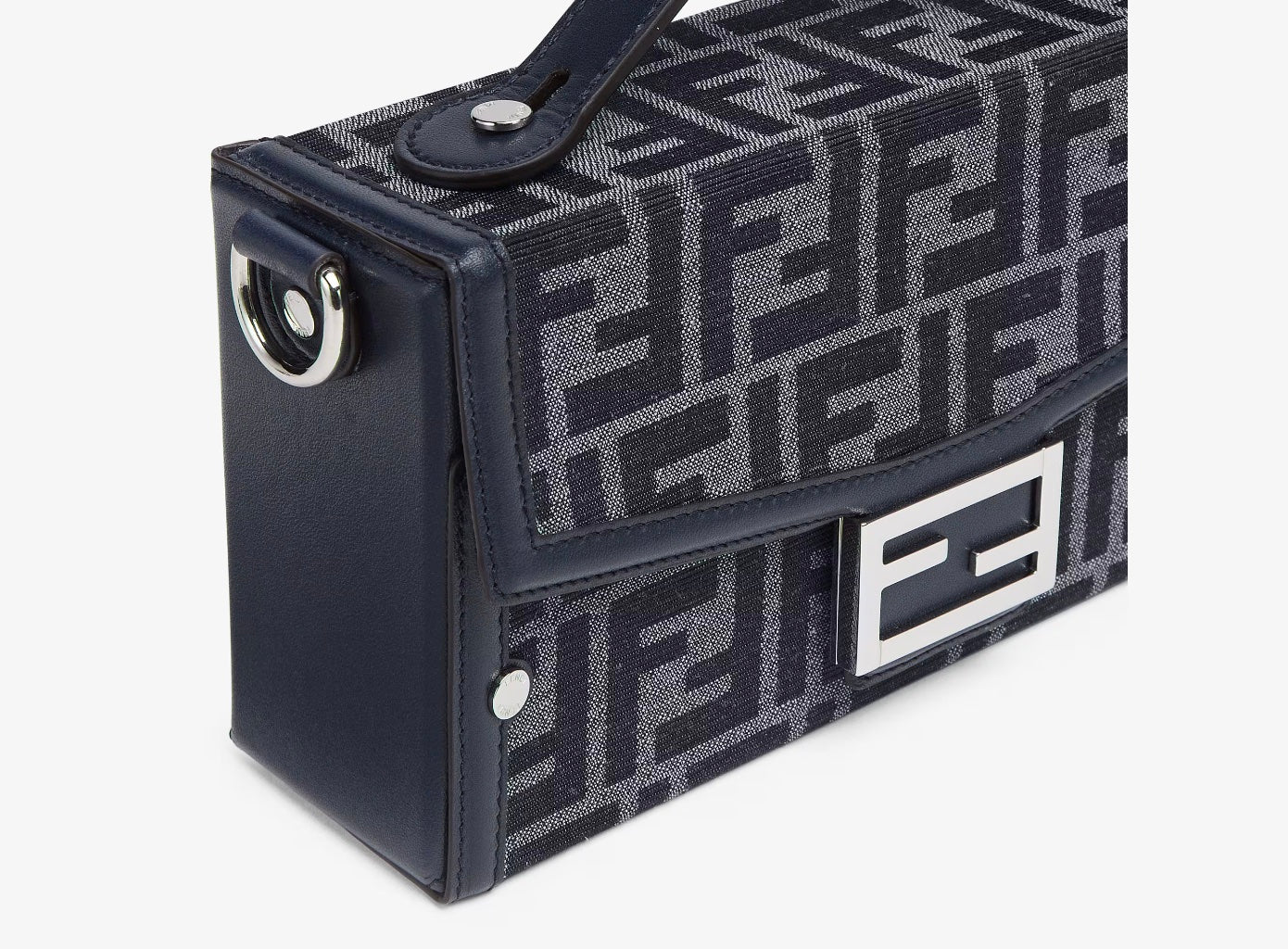 FENDI Baguette Soft Trunk Bag Crafted with Jeans Blue-colored FF jacquard panels. Flap with magnetic FF clasp. Embellished with dark blue leather.