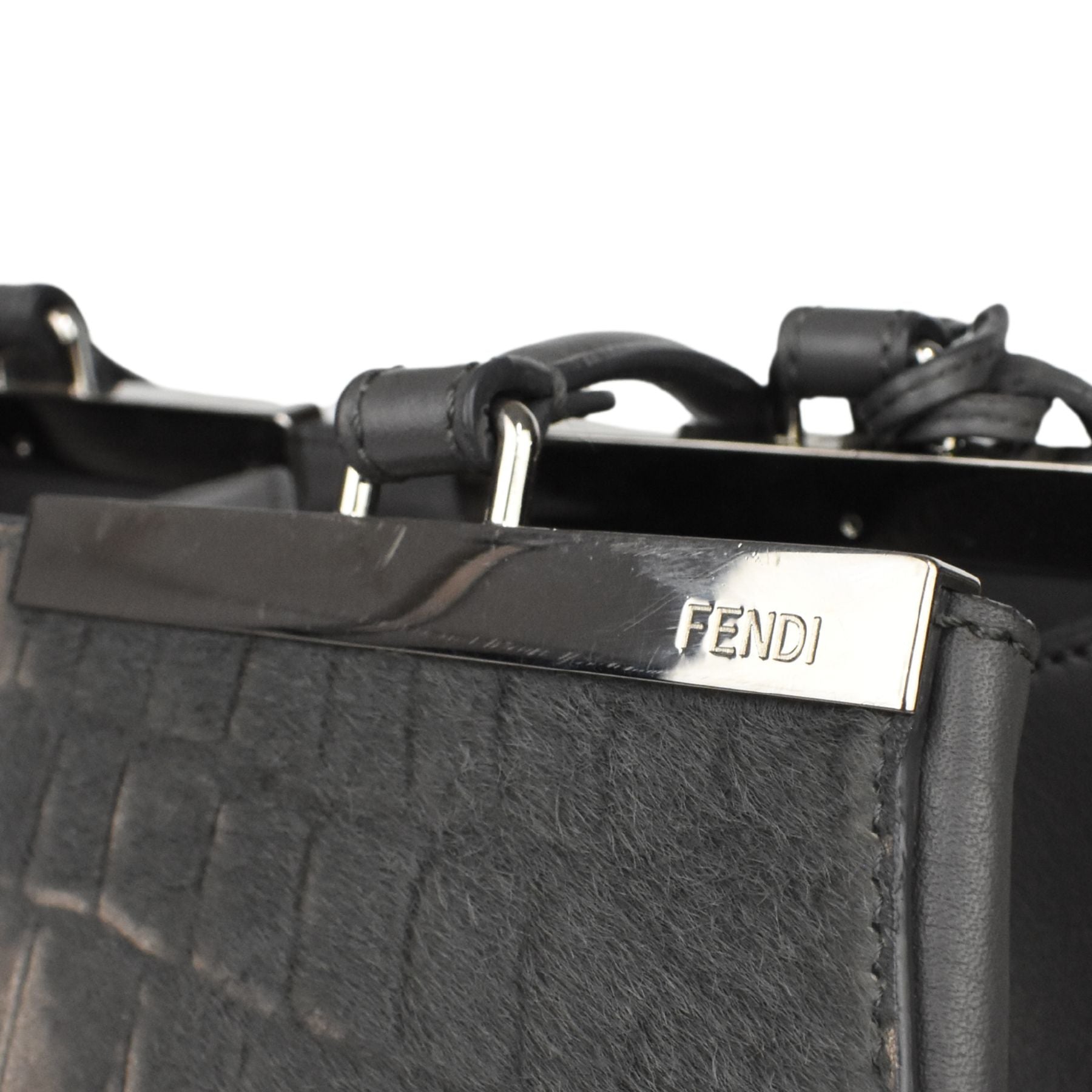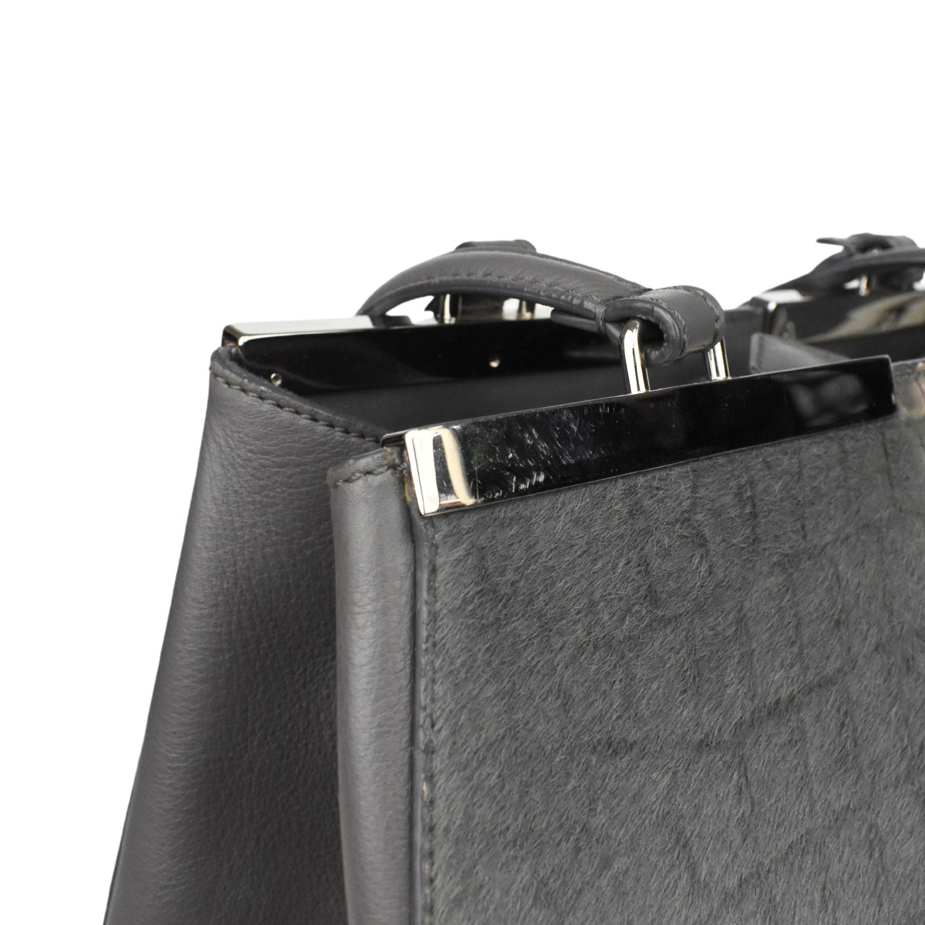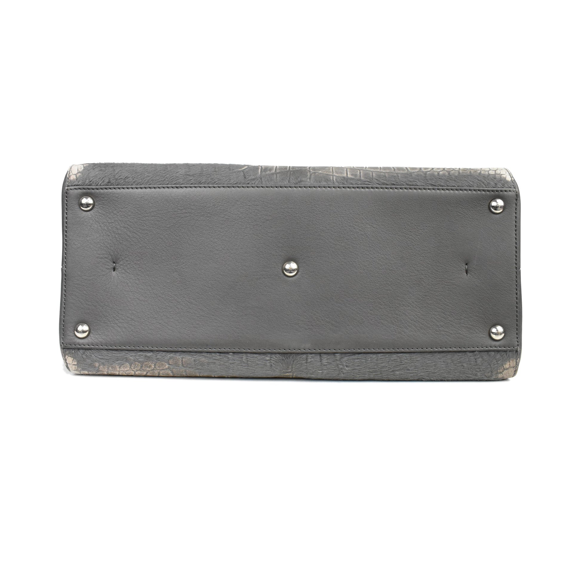 Fendi '3 Jour' Bag in grey embossed leather with pony hair panels on the front and back of the bag. Features a metal bar on the top in silver hardware, a push button closure, and dual top handles. The bag has a luggage tag, grey suede lining with an inner zip pocket and two open pockets.