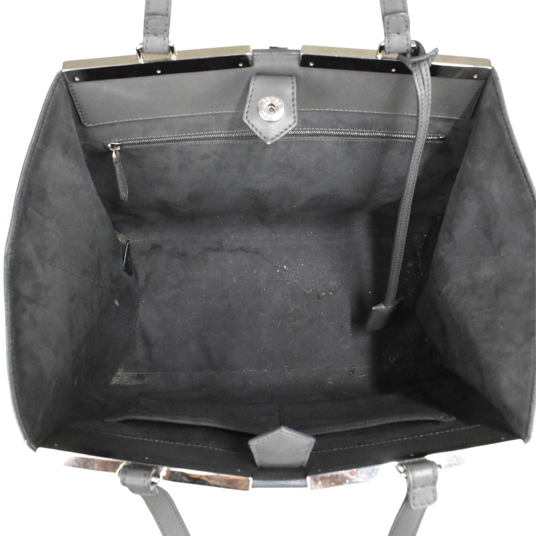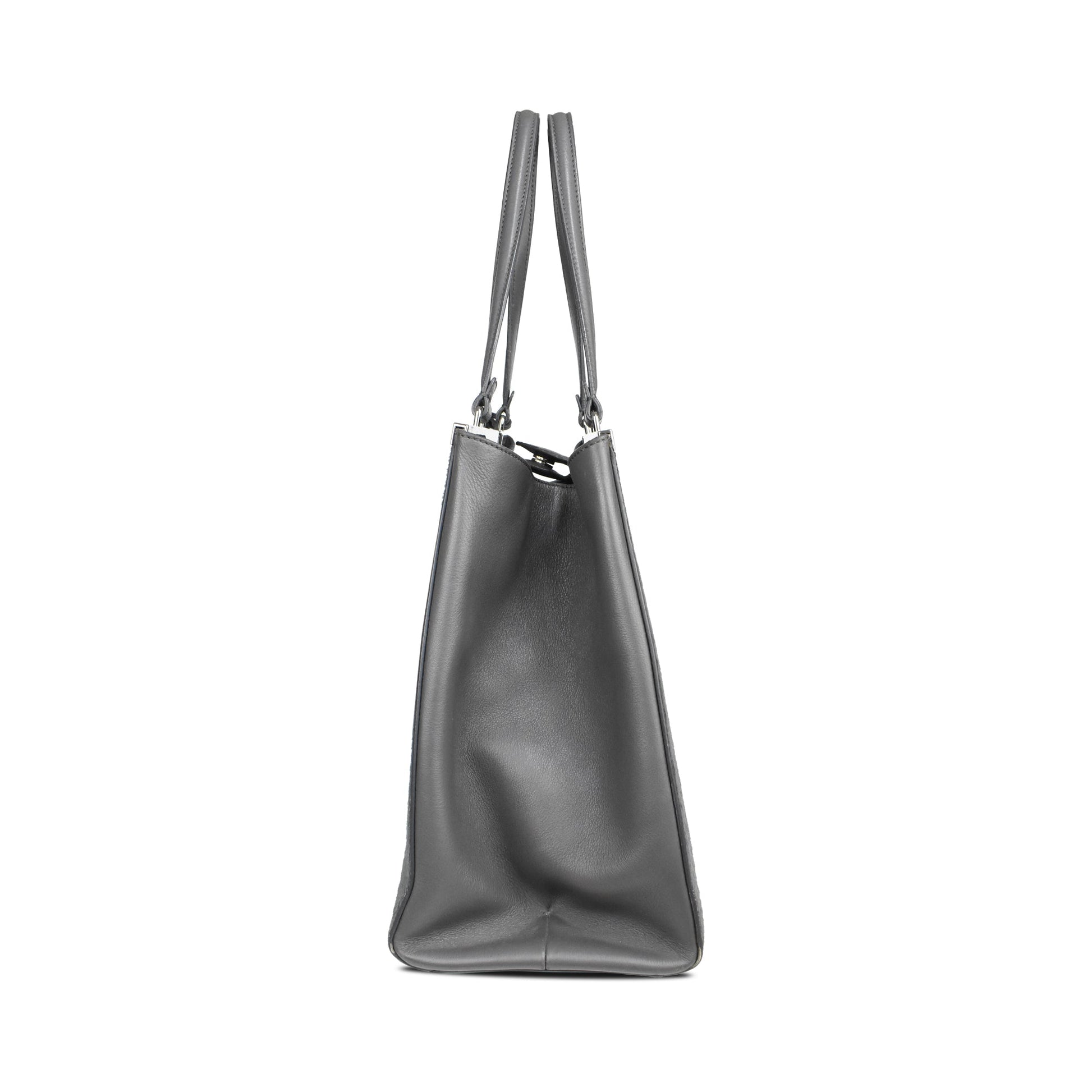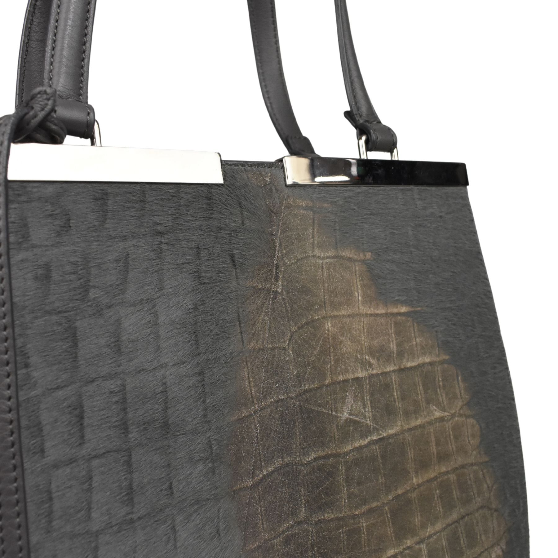 Fendi '3 Jour' Bag in grey embossed leather with pony hair panels on the front and back of the bag. Features a metal bar on the top in silver hardware, a push button closure, and dual top handles. The bag has a luggage tag, grey suede lining with an inner zip pocket and two open pockets.