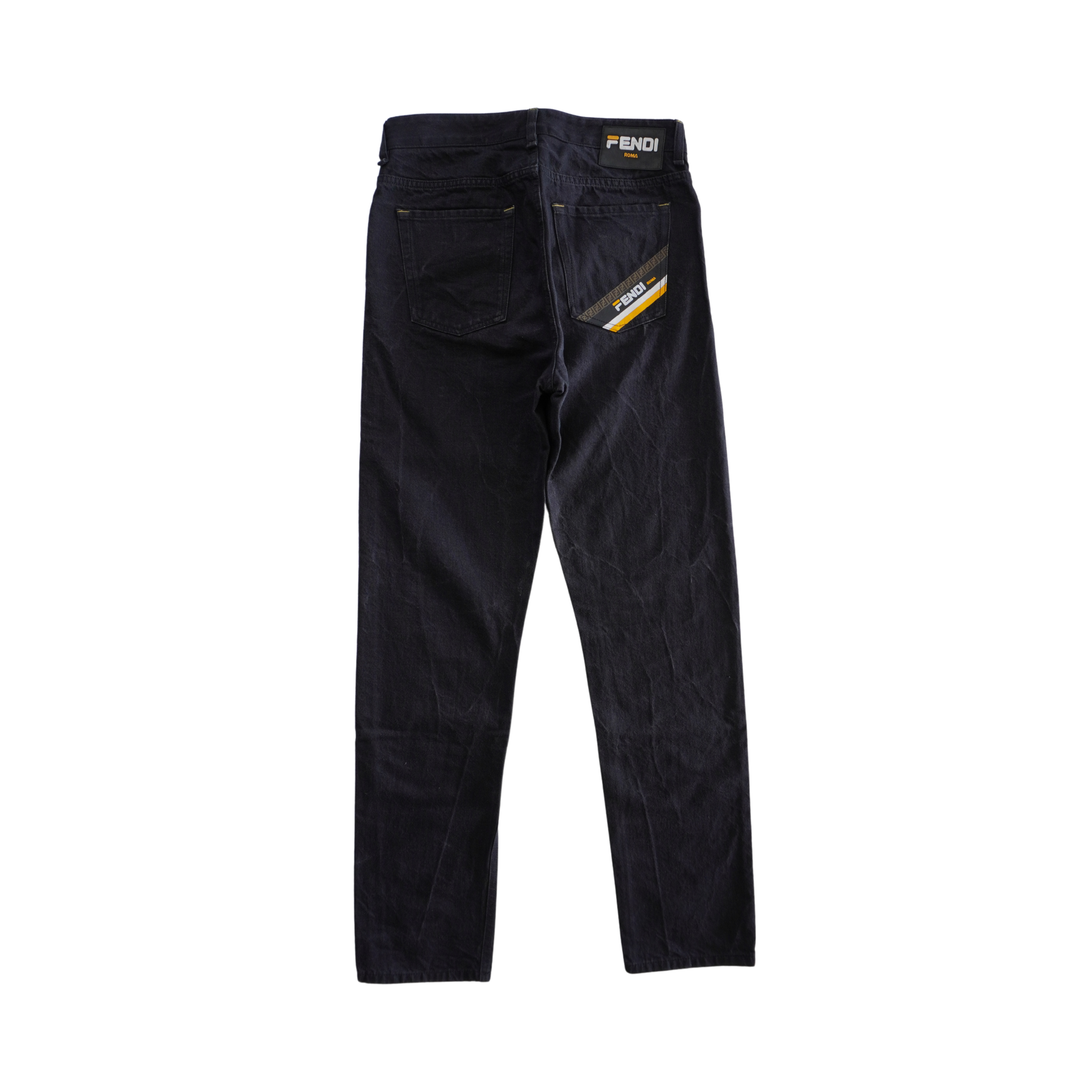 Fendi tapered jeans in black denim with yellow stitching and a stylized yellow, white, and monogram pocket on the back right pocket.