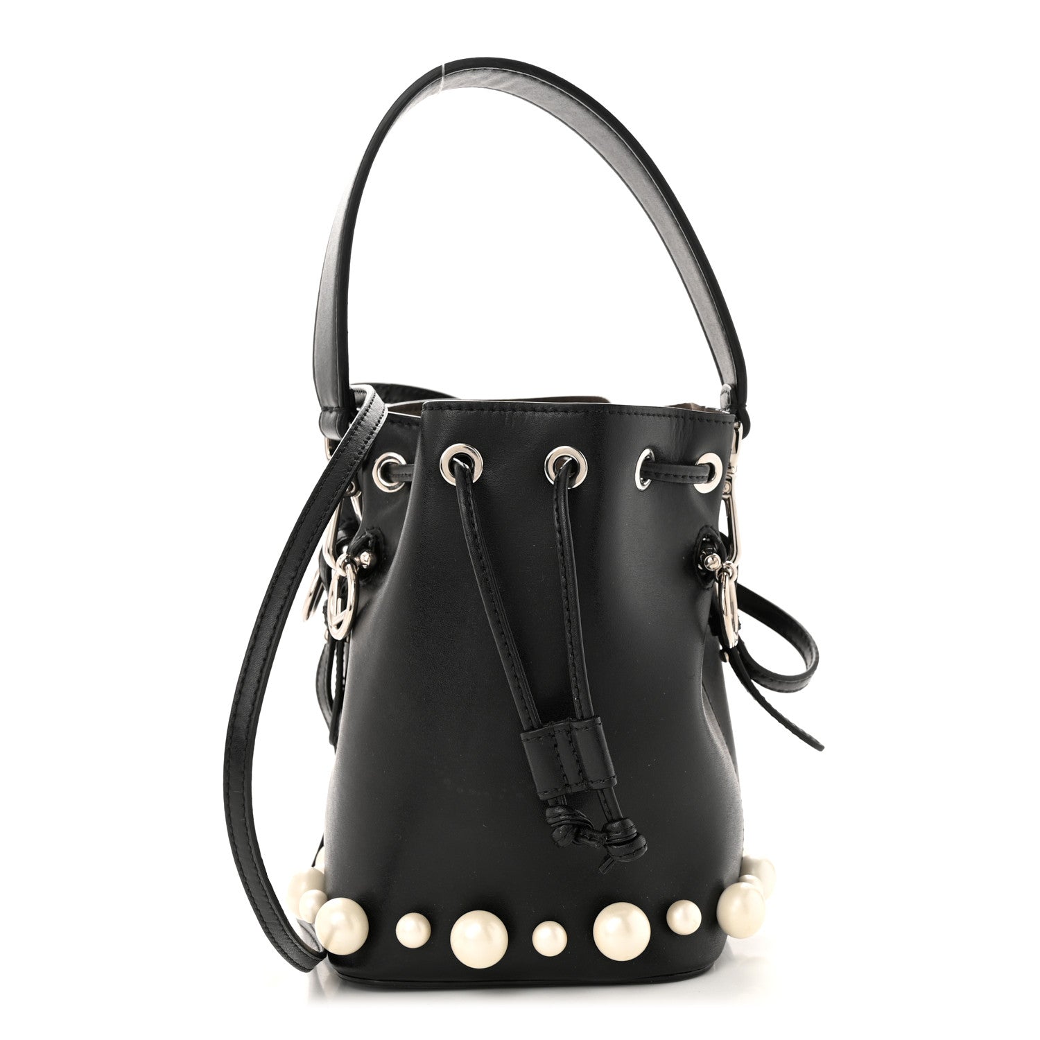 This Chic Mini Bucket bag is Crafted from smooth black calfskin leather and adorned with faux pearls in varying sizes along the base for a bold yet elegant touch. It features silver-tone side bars with signature Fendi circular accents—one displaying the F logo, the other designed for attaching the optional crossbody strap. A leather top handle adds versatility. The bag cinches open to reveal a soft taupe suede interior, perfectly sized for your daily essentials.