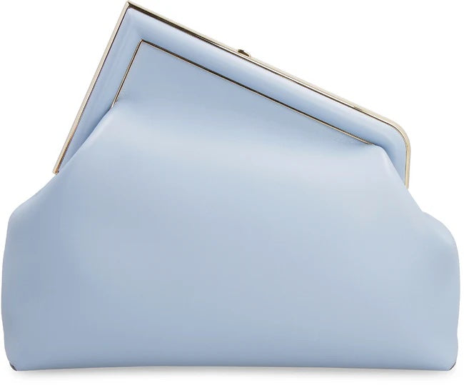 Medium Fendi First Bag Crafted of soft, Baby Blue-colored Nappa leather with an oversized metal F clasp bound in tone on tone Nappa leather.