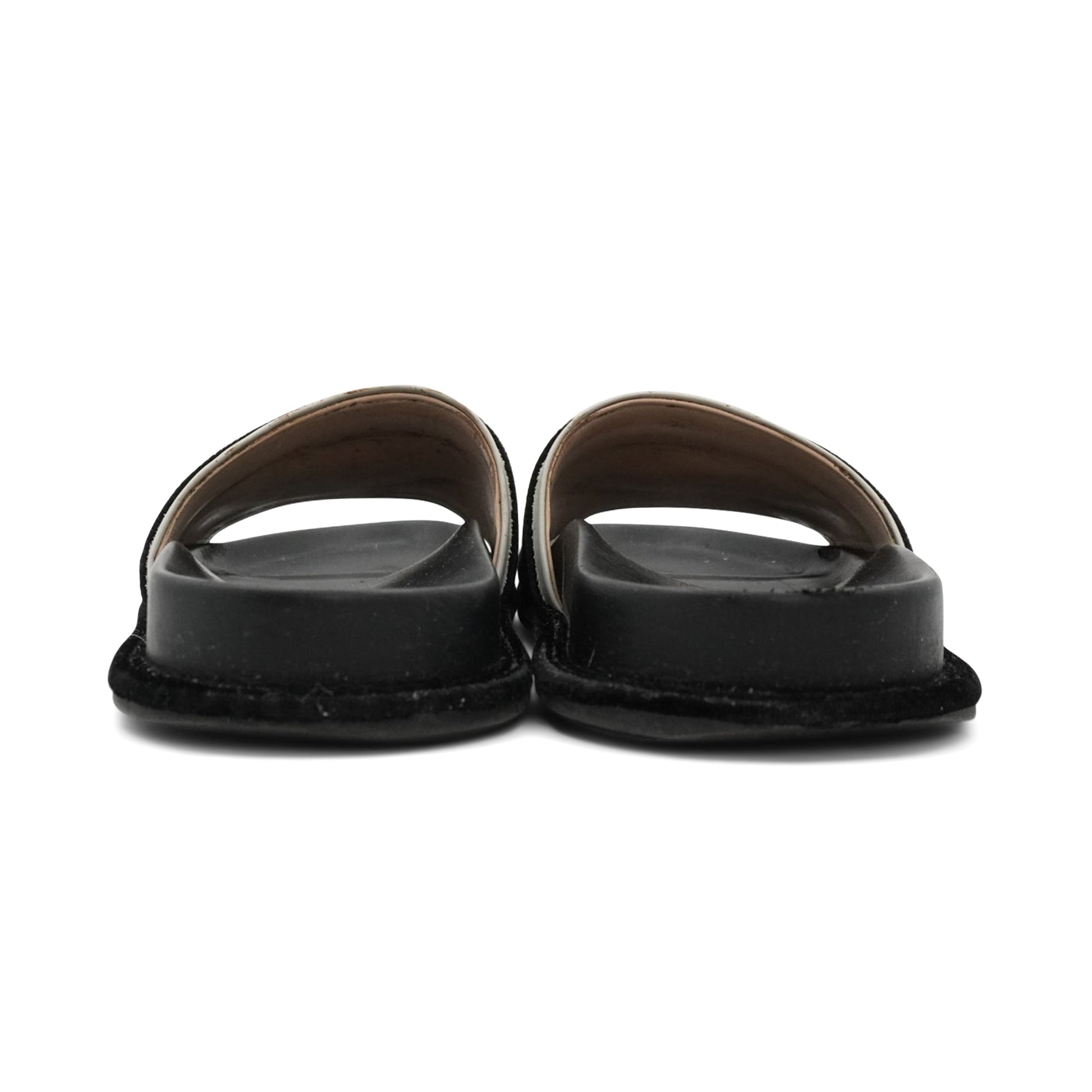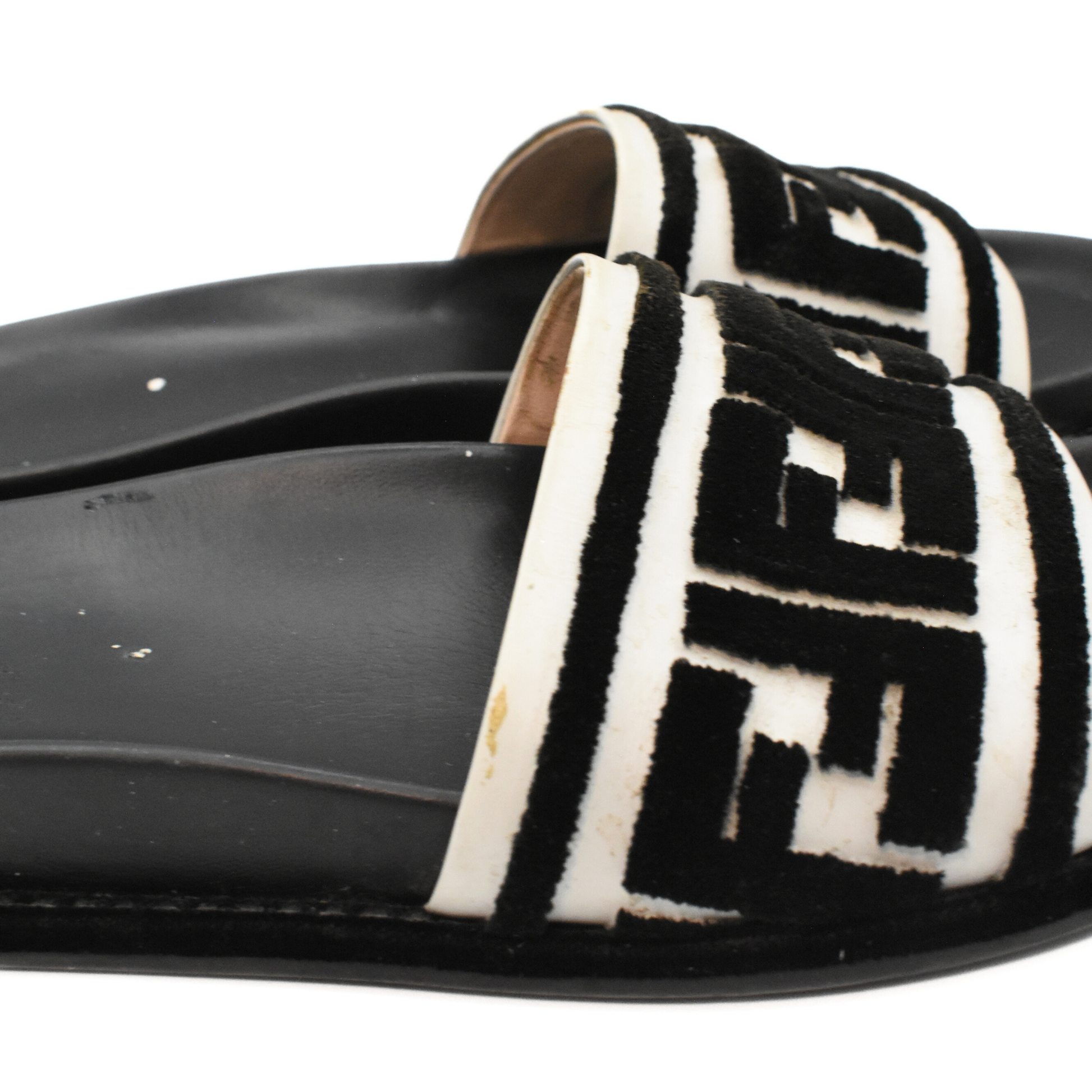 Fendi 'Fun Logo' pool slides in black and white leather with black felted 'FF' zucca graphics on the toe strap.