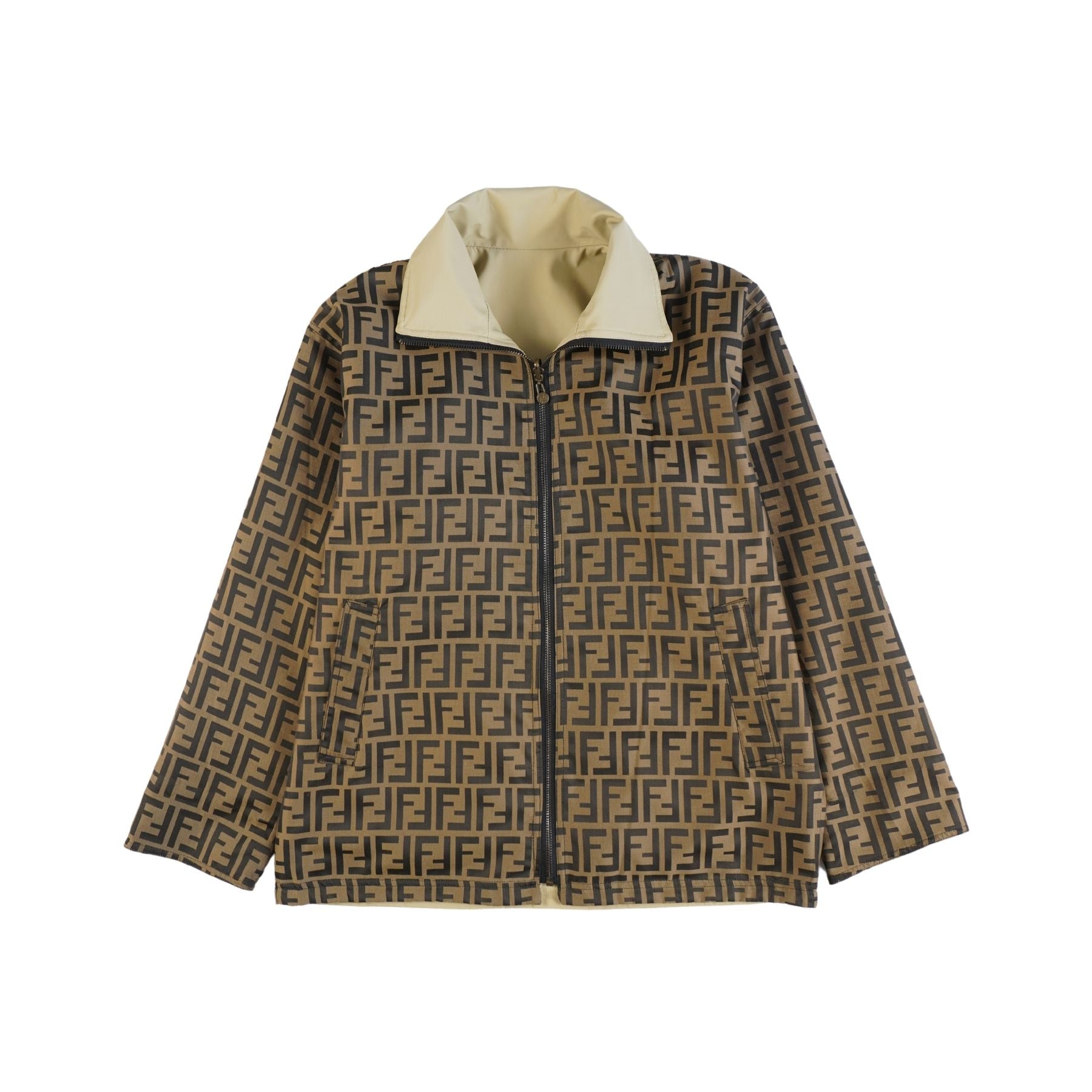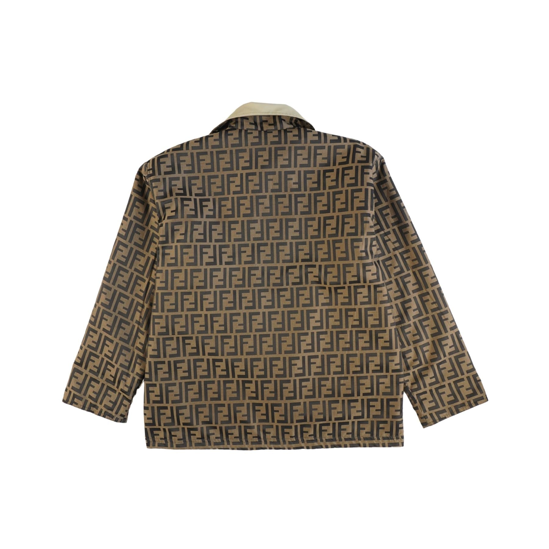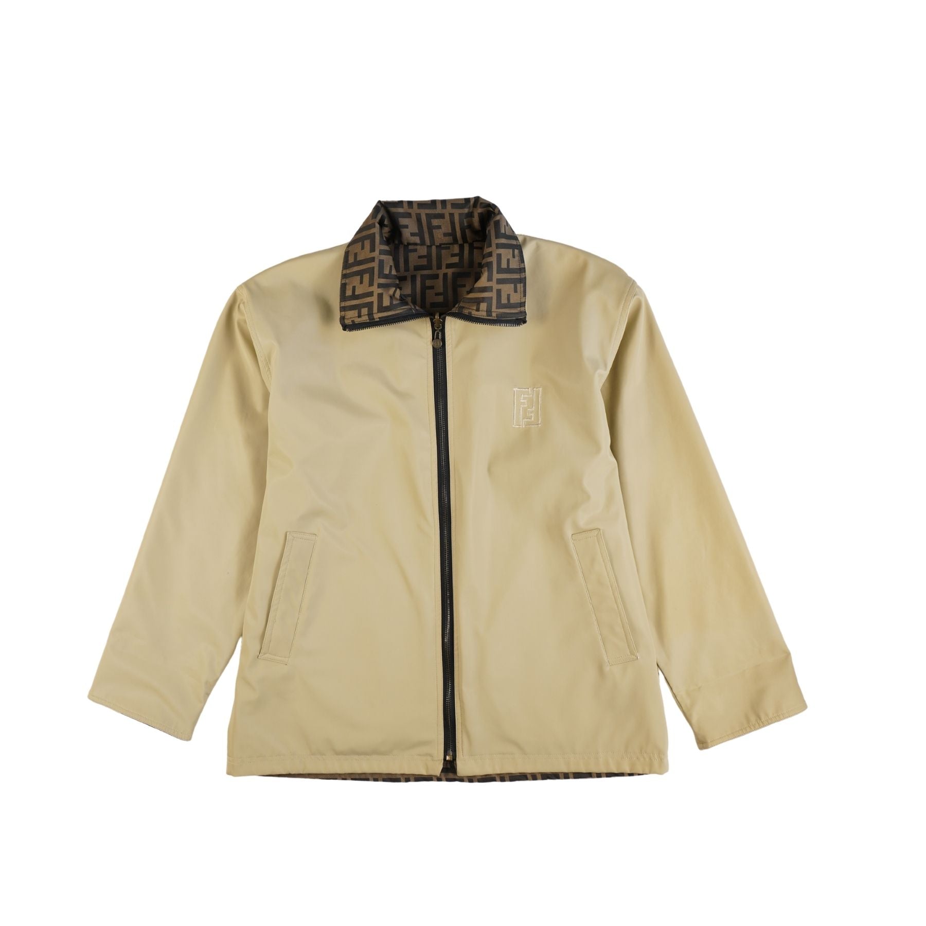 Fendi reversible track jacket in beige nylon on one side and brown and black zucca monogram canvas on the other. Features slip pockets on the sides, a zip-up closure with aged brass hardware, and a beige embroidered logo on the chest of the beige nylon side.
