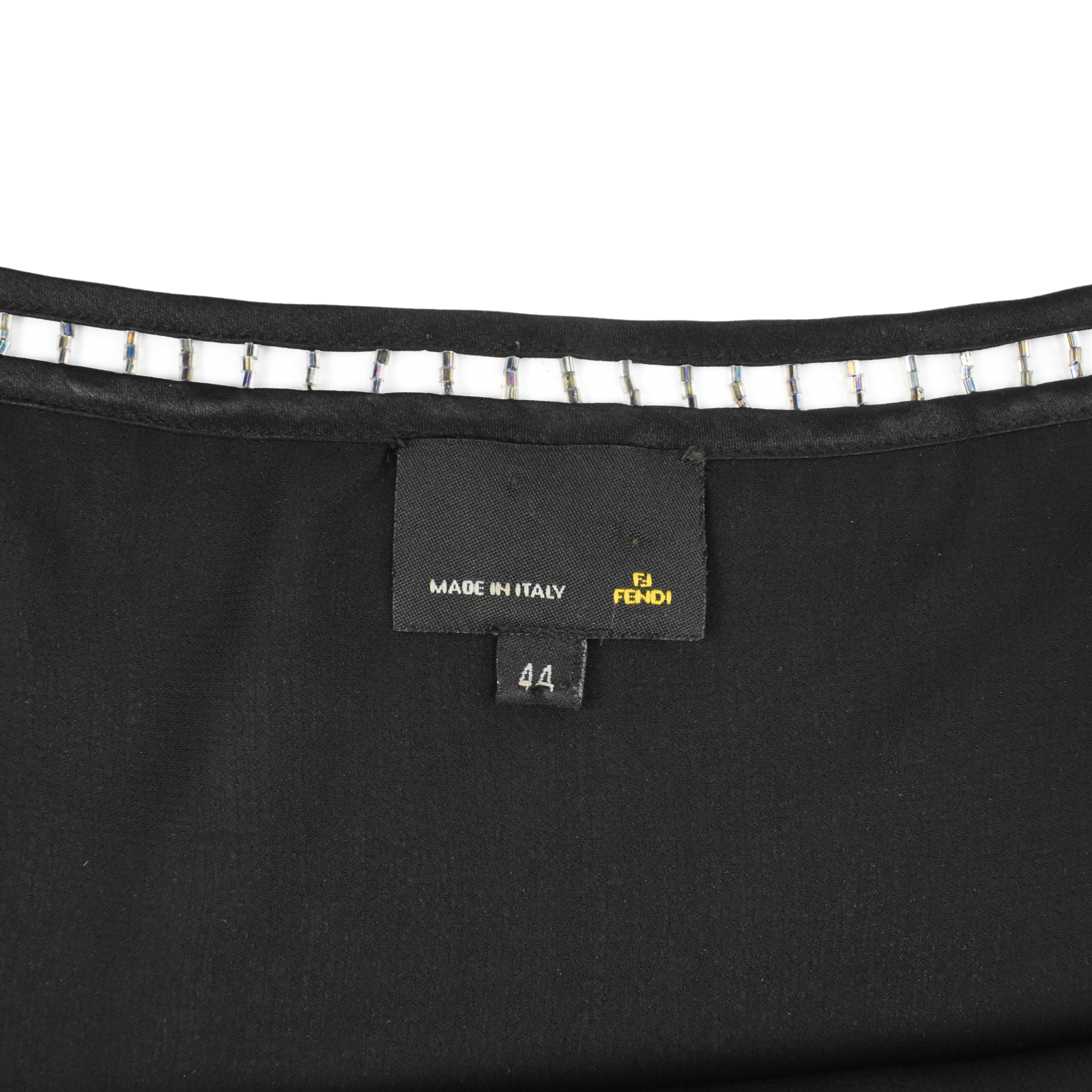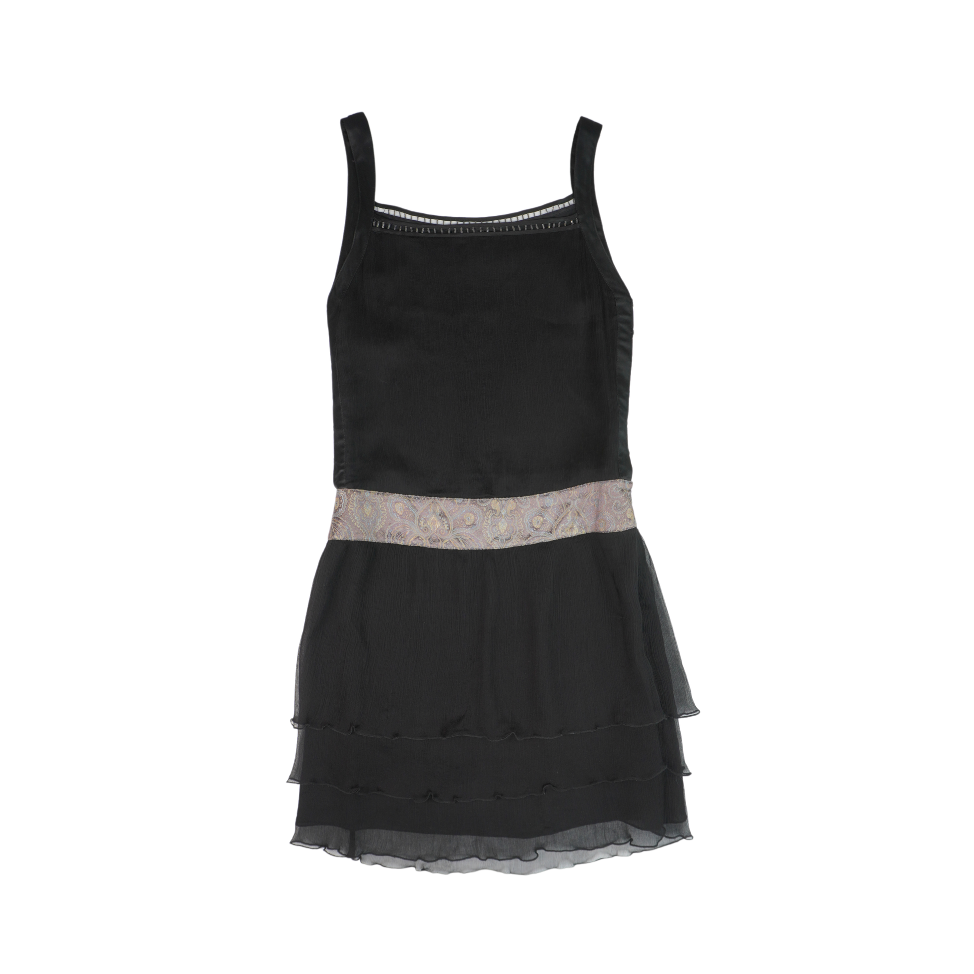 Fendi shift dress in black silk with a tiered skirt with a purple paisley waistband, a ruffle hem, silver ornate buttons down the side seams, and beading trim around the neckline.