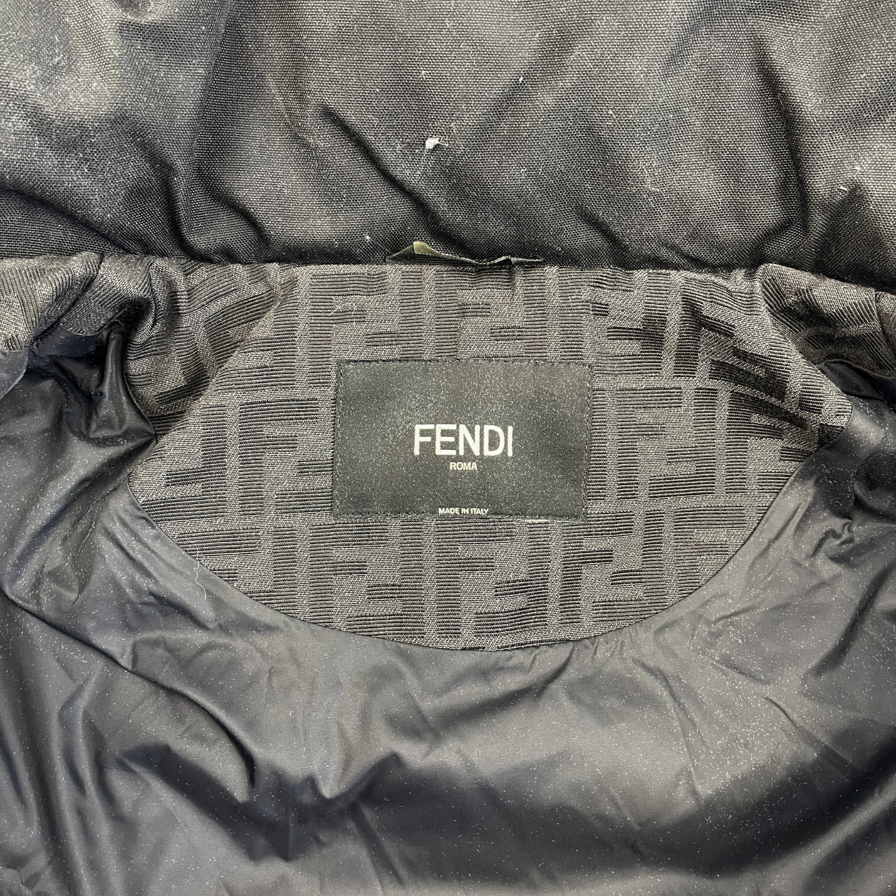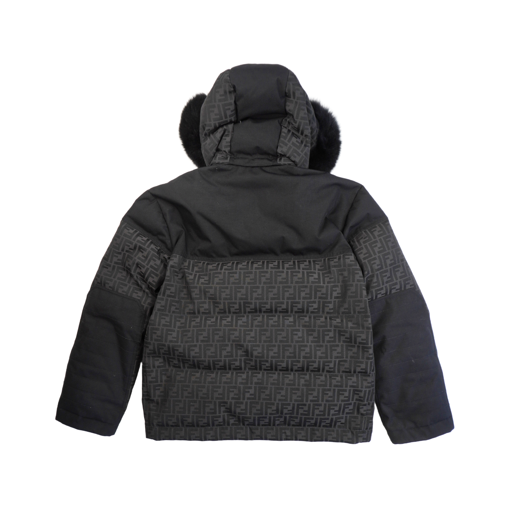 Fendi ski jacket in black and grey with signature FF 'zucca' printed panels around the chest and sleeves, large front-zip pockets, a front-zip opening in black hardware, a black rubber logo patch on the chest, and a hood with black fox fur lining.