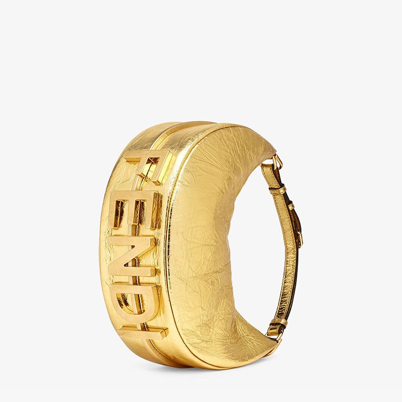 FENDI Laminated Craquele Lambskin Small Fendigraphy Hobo in Gold. This stylish mini bag is crafted in textured gold leather with the Fendi logo in vintage gold at the base. The gold clips allows it to be attached to larger bags or worn on the wrist. The top zipper opens to a striped monogram fabric interior.