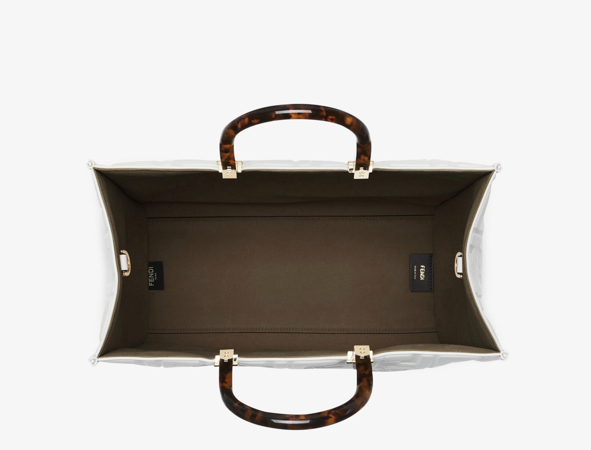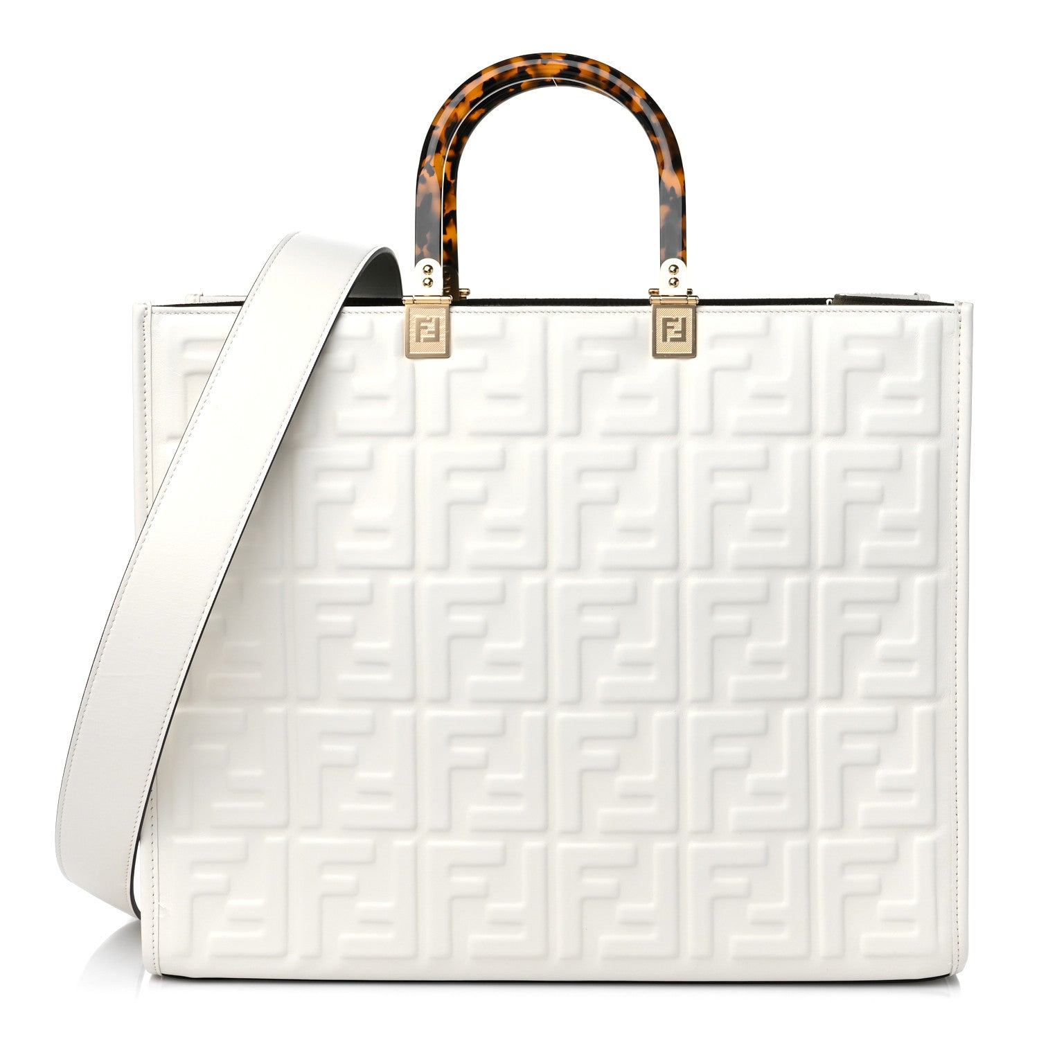 FENDI Medium Sunshine Shopper bag crafted of white leather with raised 3D-texture FF motif and rigid tortoiseshell-effect plexiglass handles.
