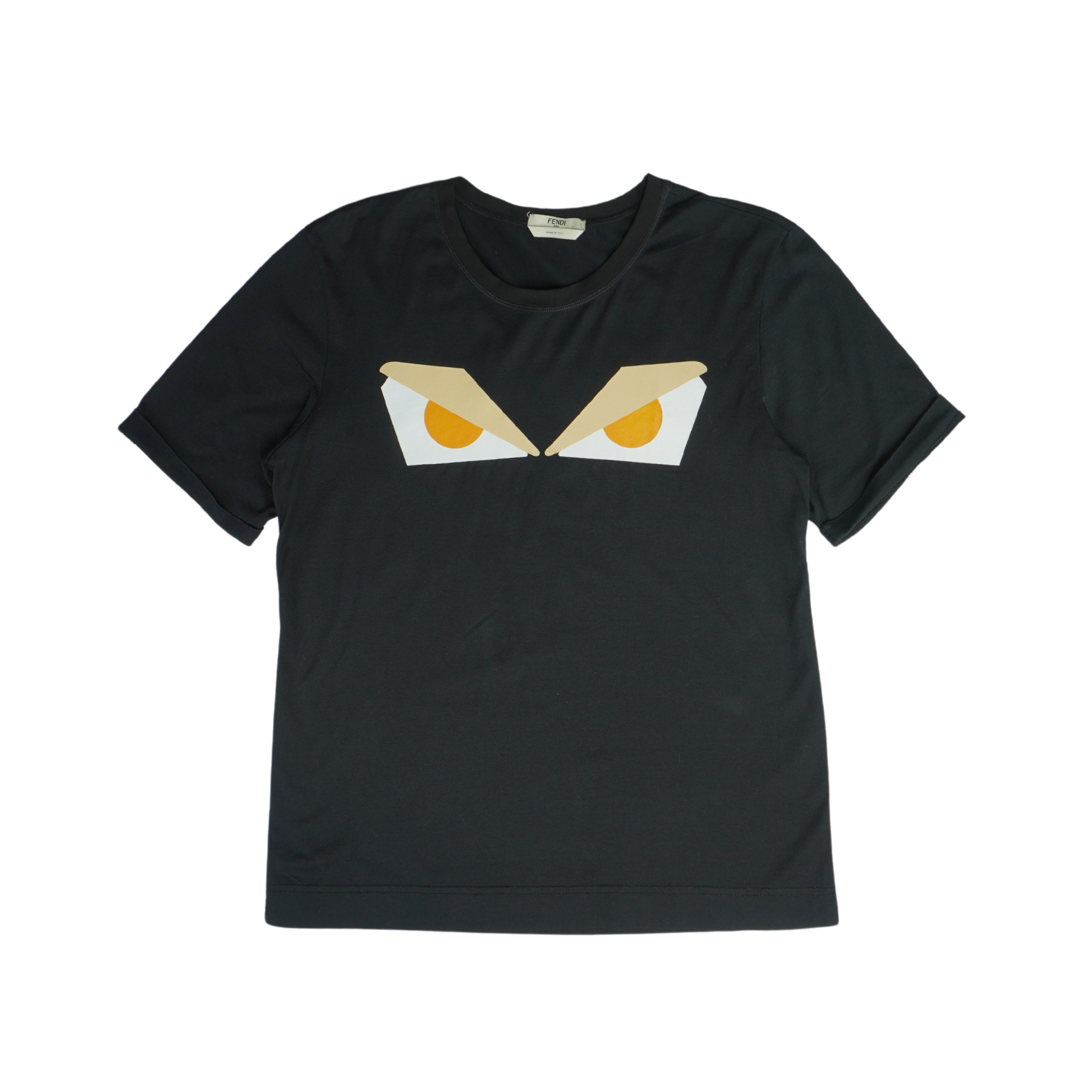 Fendi t-shirt in black cotton with rolled sleeves and a white and yellow eye graphic on the chest.