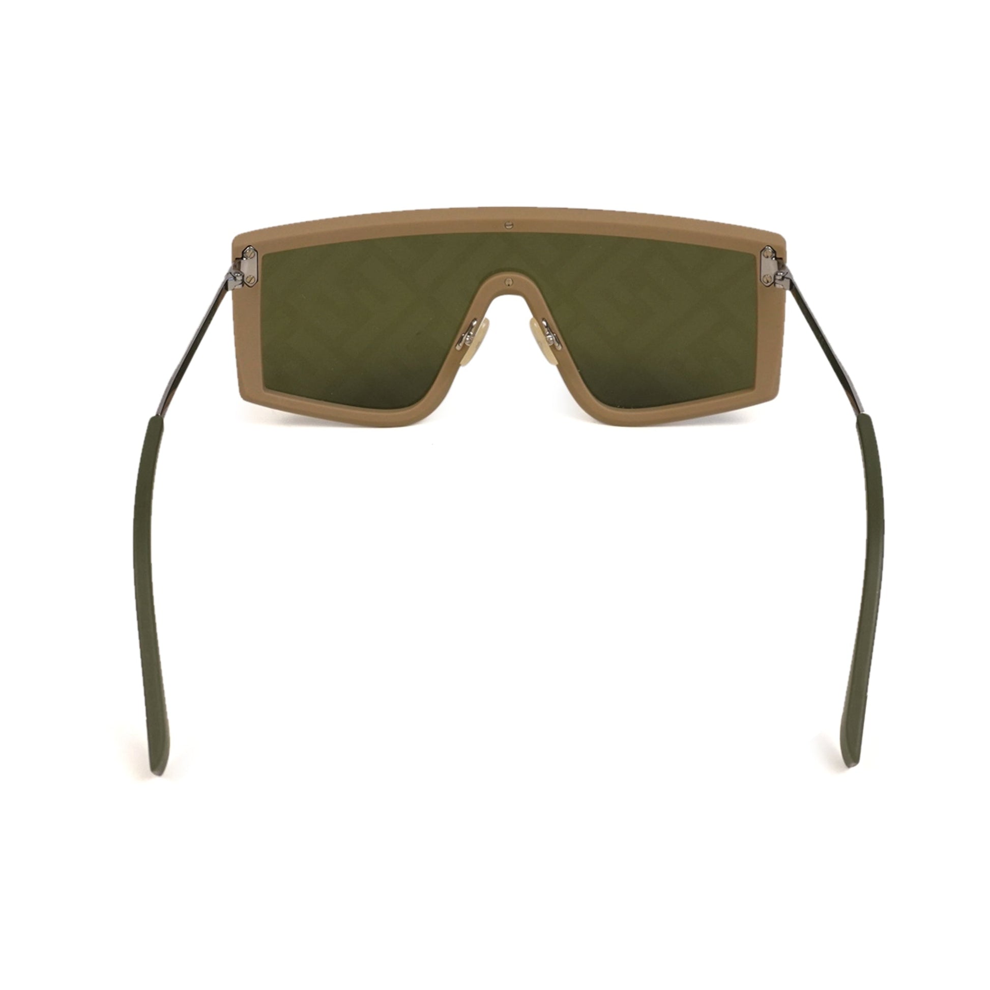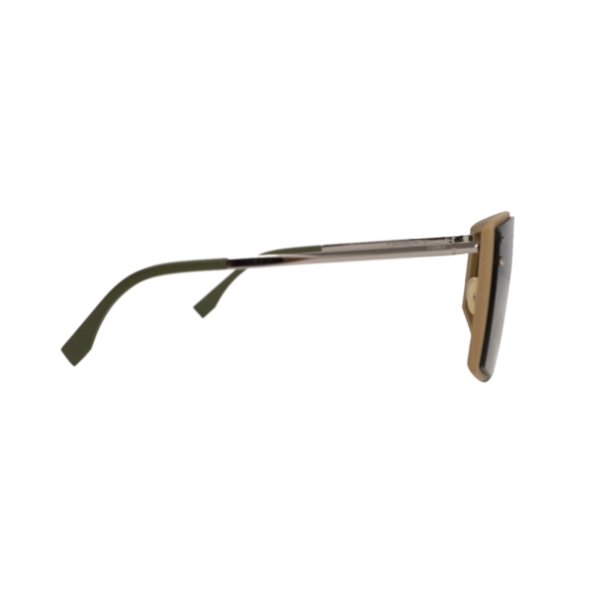 Fendi shield sunglasses in a beige frame, a monogram olive green lens, and metal with green arms.
