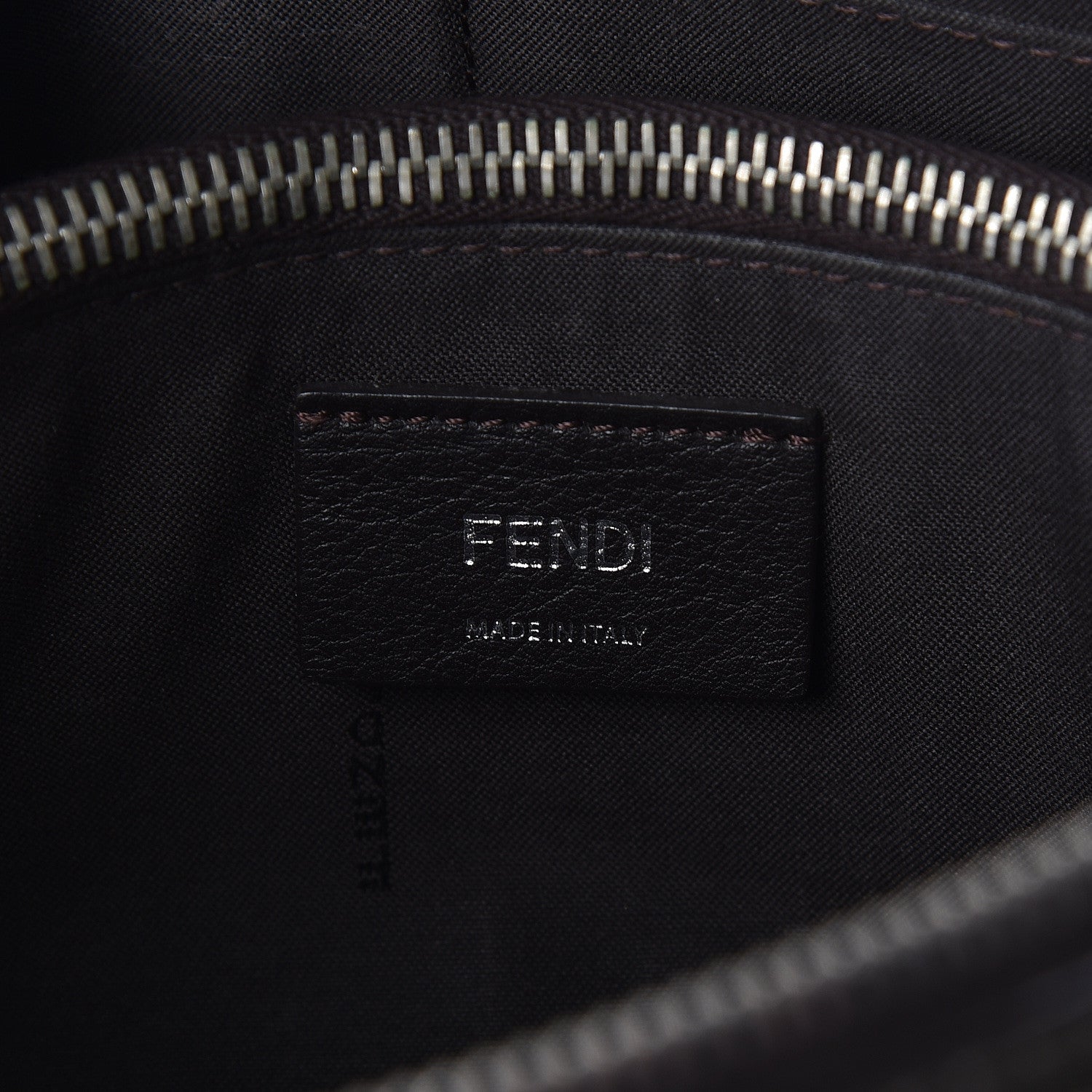 The overextended top zipper opens to a partitioned Fendi logo fabric interior with zipper and patch pockets.