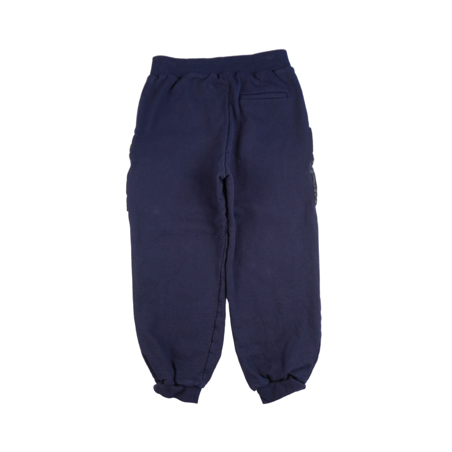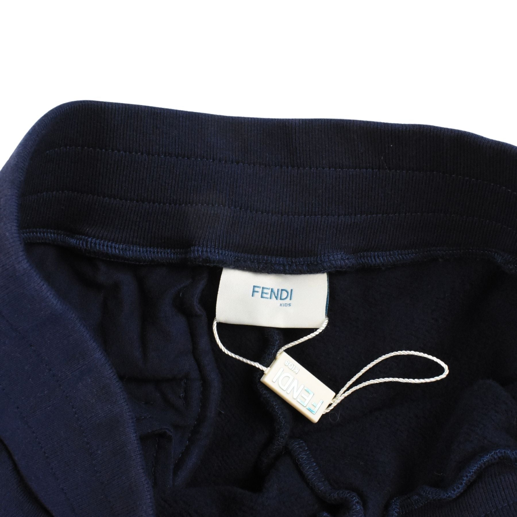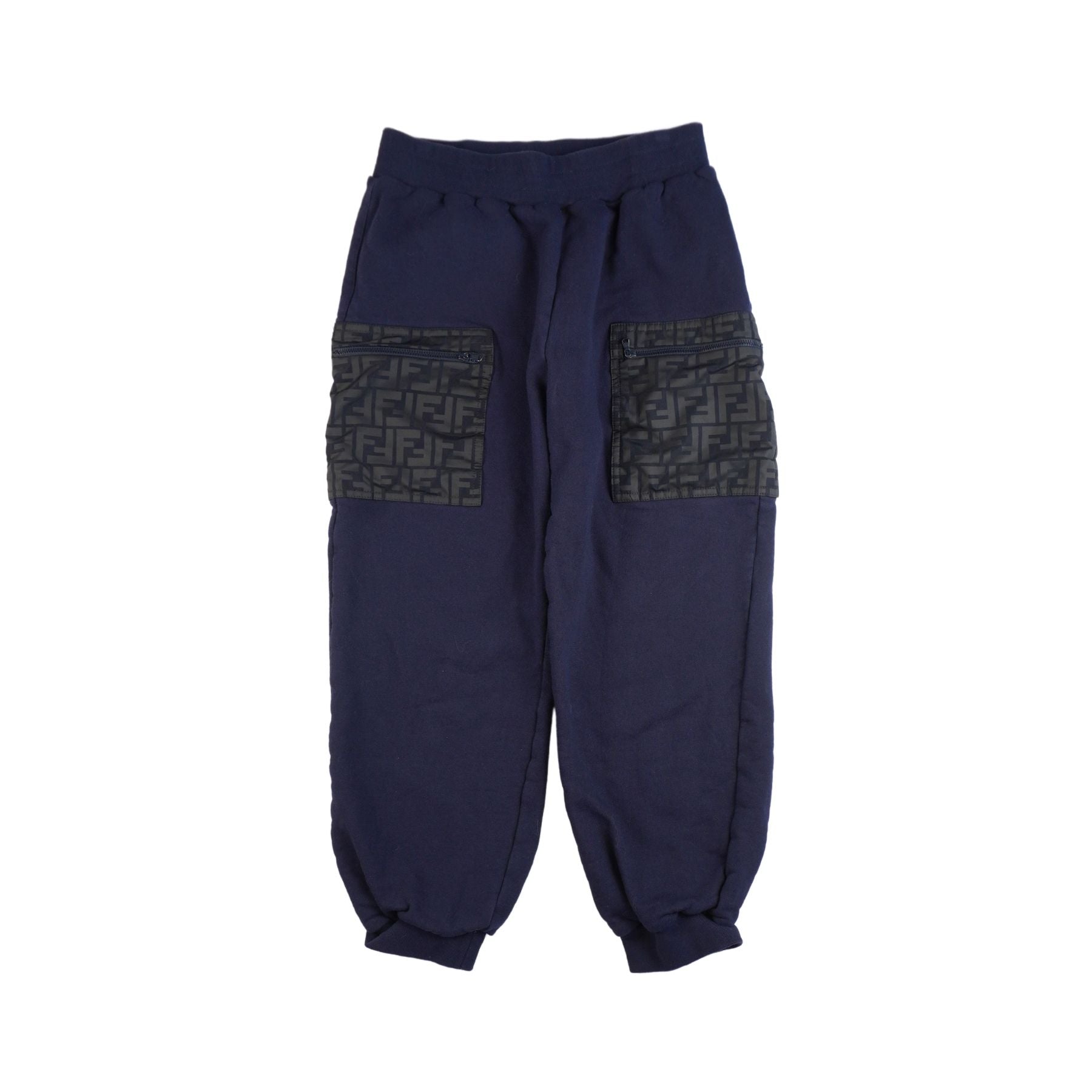 Fendi jogger sweatpants in navy blue cotton with black nylon 'zucca' printed zip pockets and an elastic waistband and cuffs.