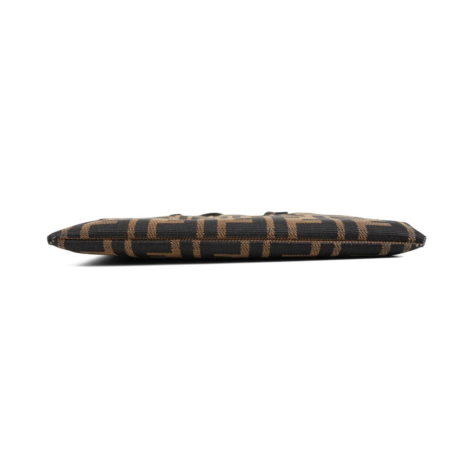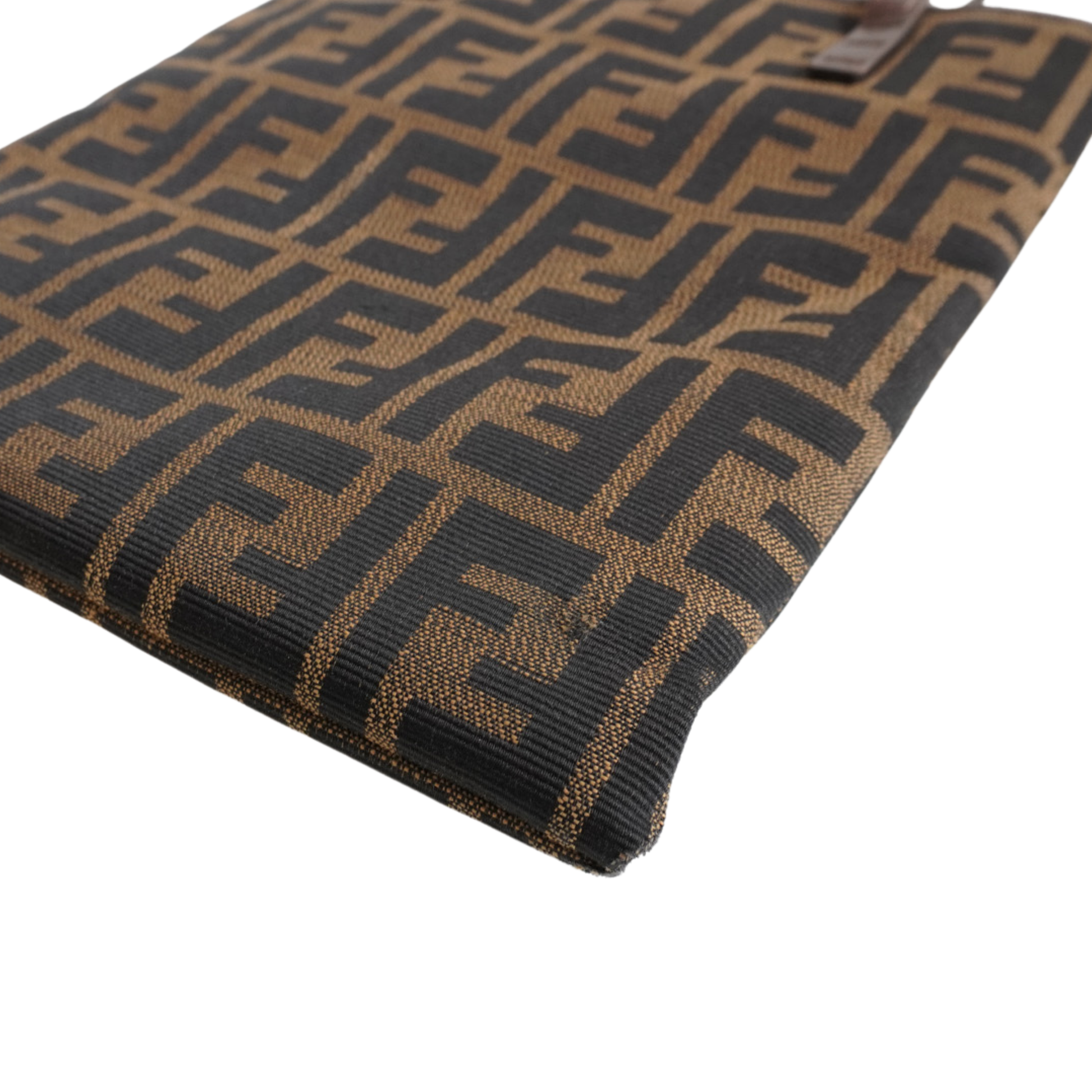 Fendi mini tote bag in brown and black 'FF Zucca' monogram printed canvas with brown leather trim, dual top handles, a top snap closure, and a brown canvas lined interior with zip and slip pockets.