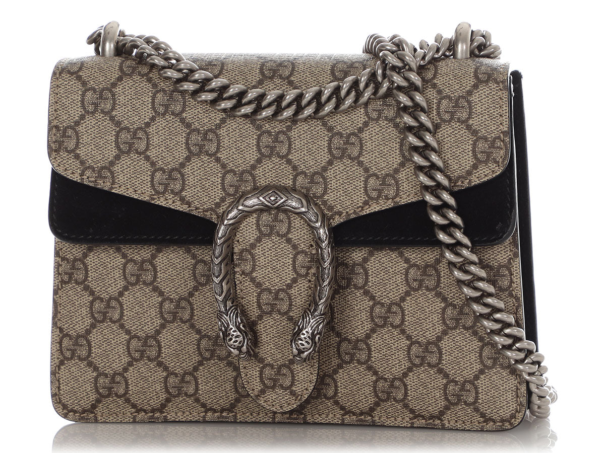 Gucci’s Mini GG Supreme Dionysus Bag is an everyday cutie in goes-with-everything neutral tones! Made of beige monogram canvas with black-suede details, it has brushed-silver hardware, including the tiger-head clasp on the front flap. Under the main flap, there’s a flapped pocket on the front face, while the pocketless interior is lined in black suede and more GG canvas. In great condition with a dustbag, it has some rubbing and light marks on the suede parts and a light perfume smell. The chain strap can be worn doubled up with a 12.75-inch drop or pulled long with a 23.25-inch drop, giving you two ways to style this marvelous mini Gucci!