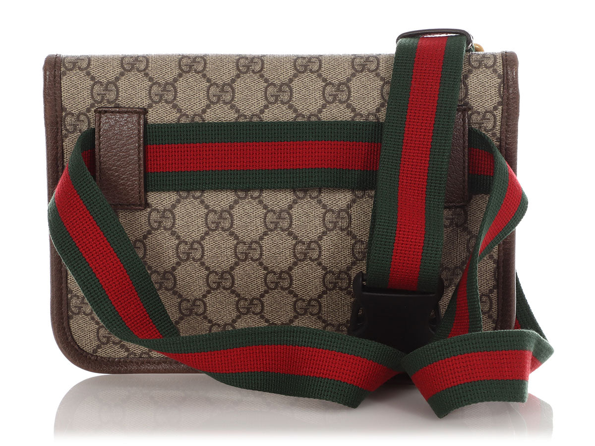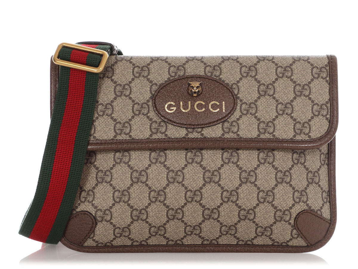 Slung across your body or around your hips, Gucci’s GG Neo Vintage Belt Bag is a modern spin on a classic Gucci look! Made of brown GG Supreme canvas with brown leather trim and antiqued gold hardware, it has a logo patch embellished with a cat head on the front, and comes with an adjustable green-and-red webbing strap shown with a 20.75-inch drop. The front flap secures with a magnet and inside you’ll find a pocketless interior lined in beige fabric. In excellent condition, it has a small stain inside. You can never go wrong with the timeless look of Gucci!