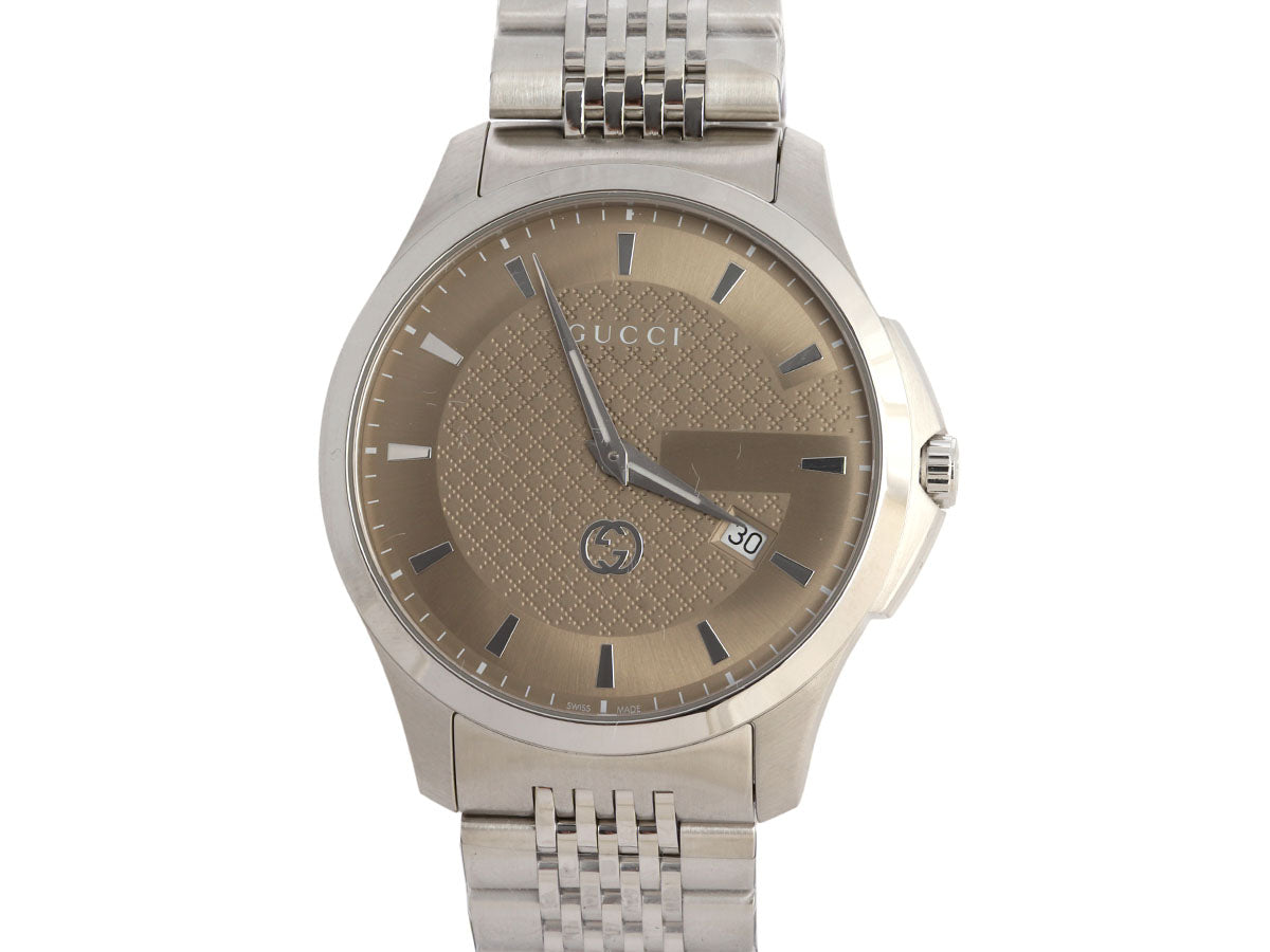 Gucci’s Stainless Steel G-Timeless Watch 40mm is a unisex timepiece with a cool look! This Swiss-made quartz watch has a brown quilted dial with a date window at the 4 o’clock position, baton hour markers, and a deployment bracelet. New and never worn, it comes with a box. Gucci describes its Timeless collection as blending tradition and innovation, as evident in this classy piece!