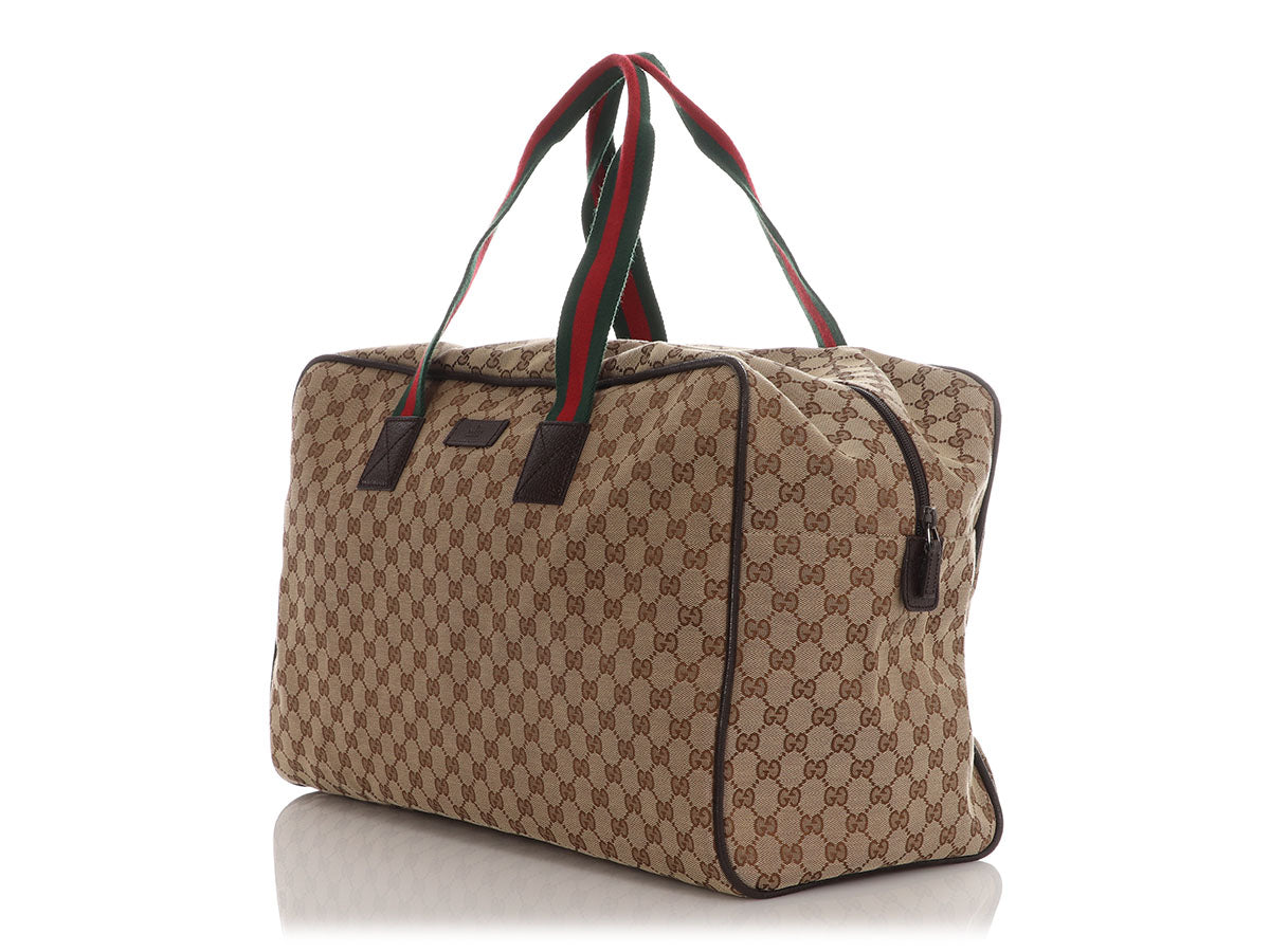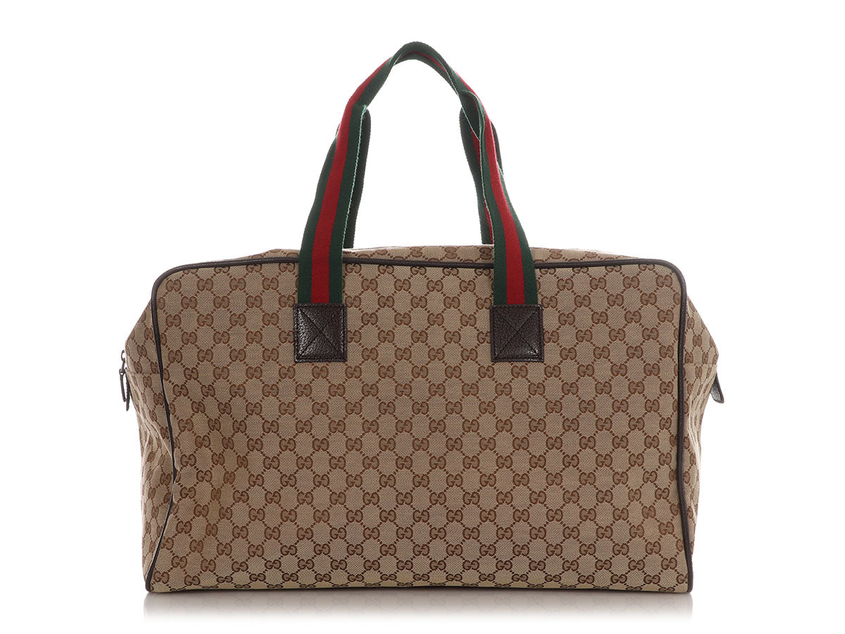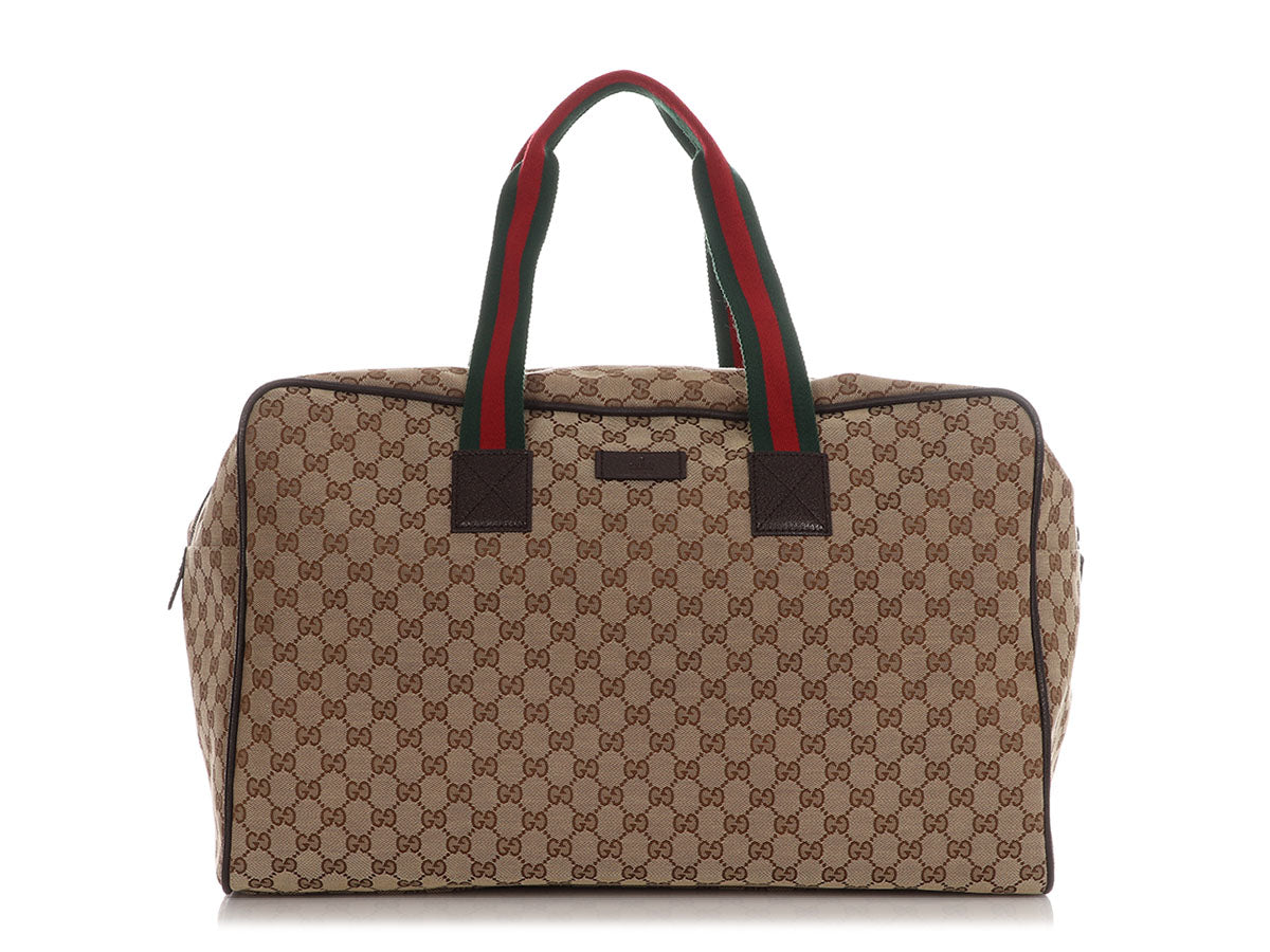 With Gucci’s GG Canvas Weekender Duffle, you’re in for a fabulous weekend! Made of brown logo canvas with brown leather piping and green-and-red webbing straps with a 9-inch drop, it zips open to brown fabric inside with one zipped pocket. In excellent condition with a dustbag and info booklet, it has a few faint marks inside and a faint perfume smell. It’s perfect for travel or as a carry-on, so bring on the weekend!