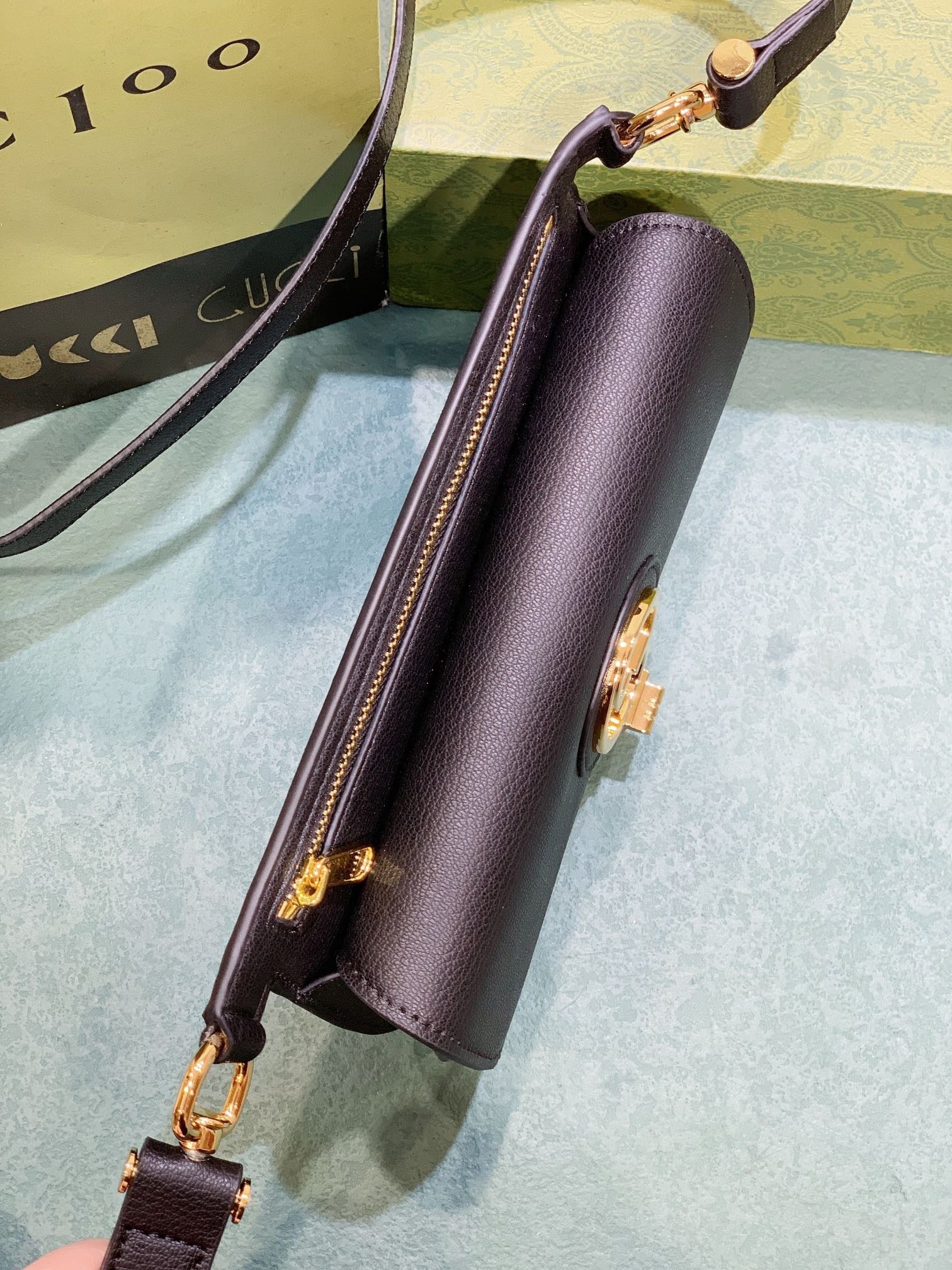 - Gold-toned hardware