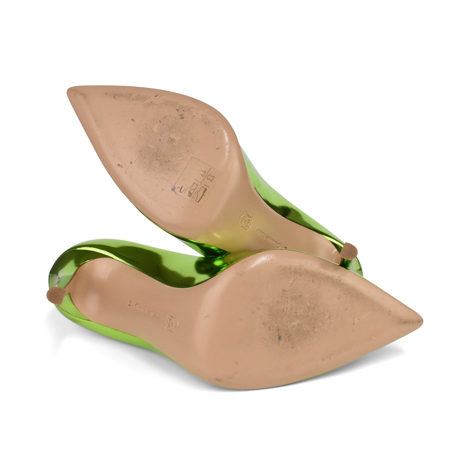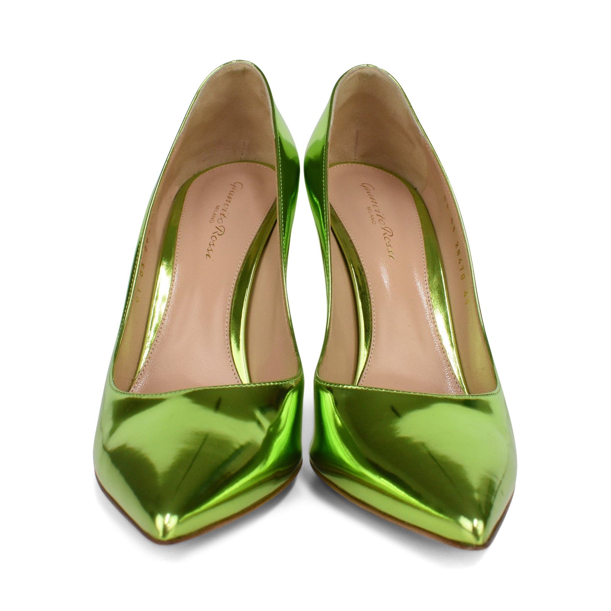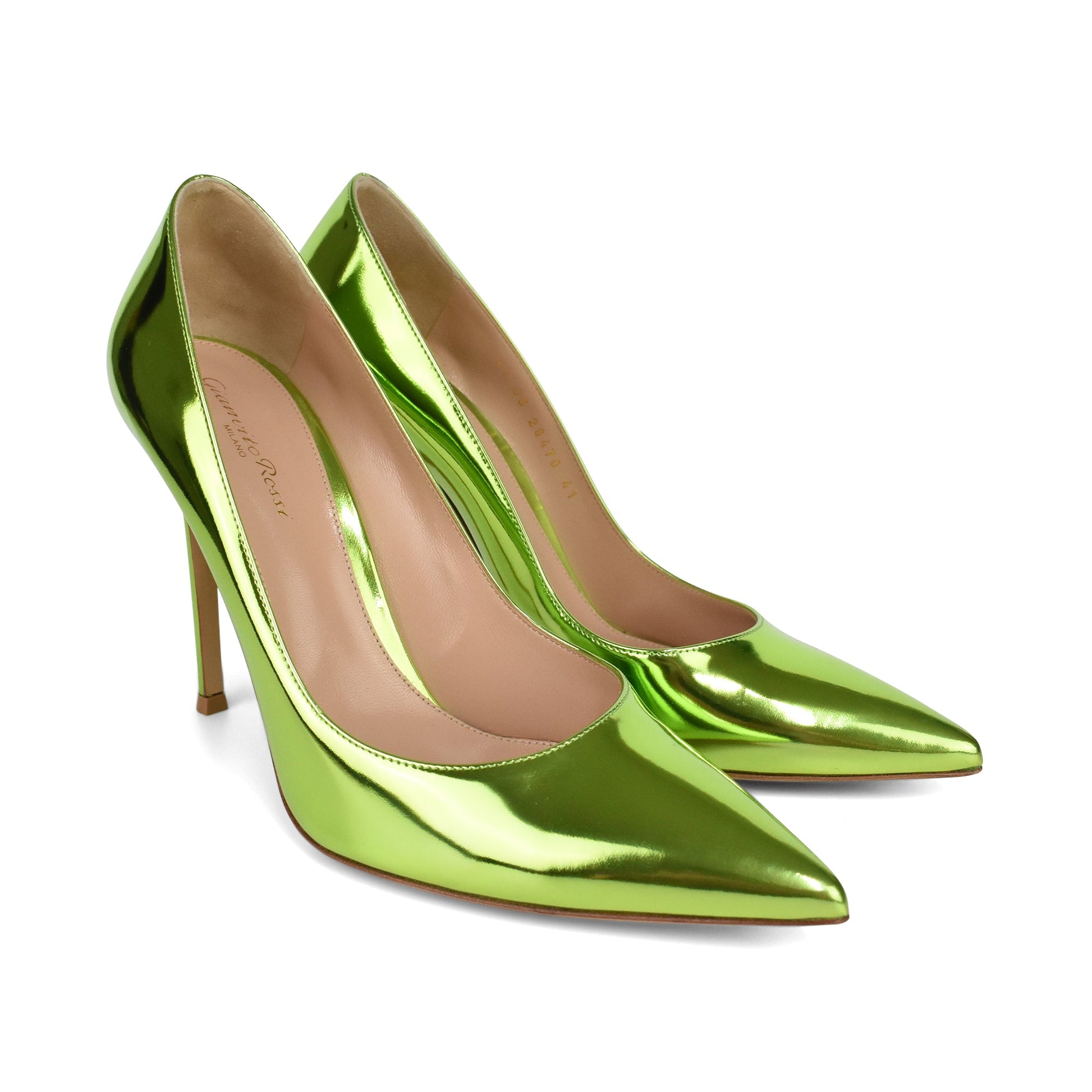 Gianvito Rossi stiletto pumps in green metallic patent leather with a pointed toe and stiletto heel.