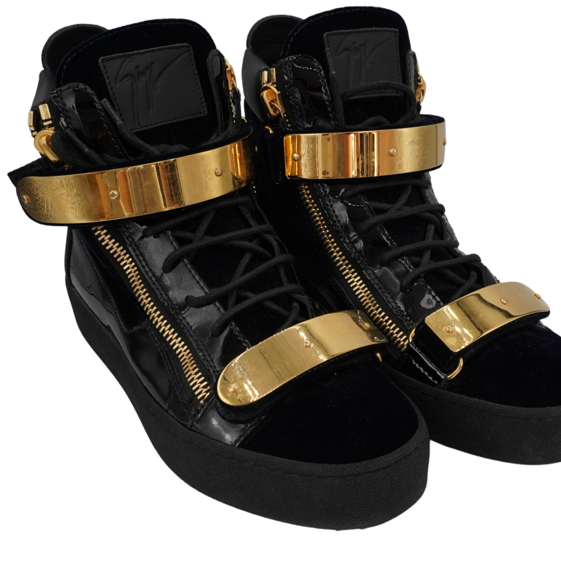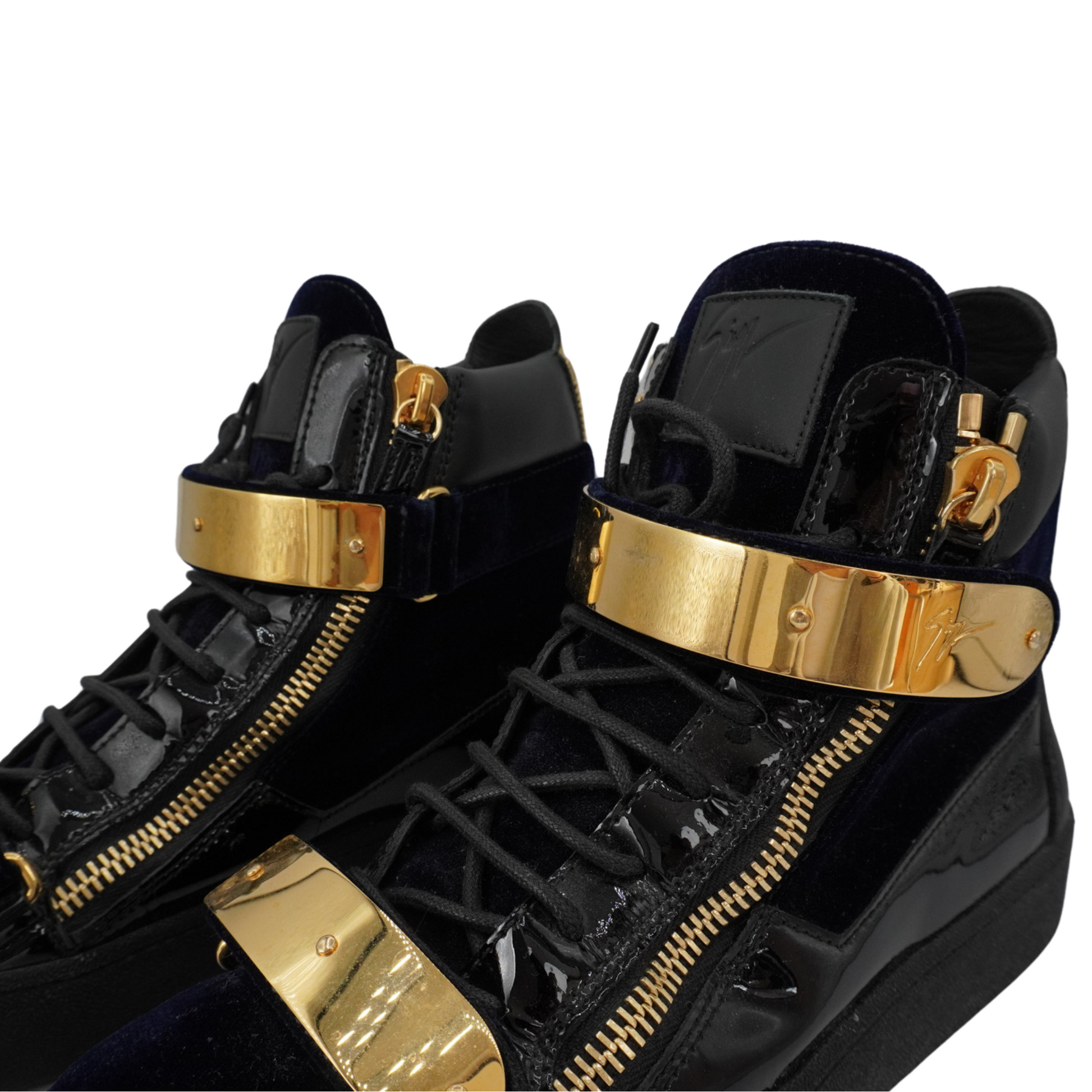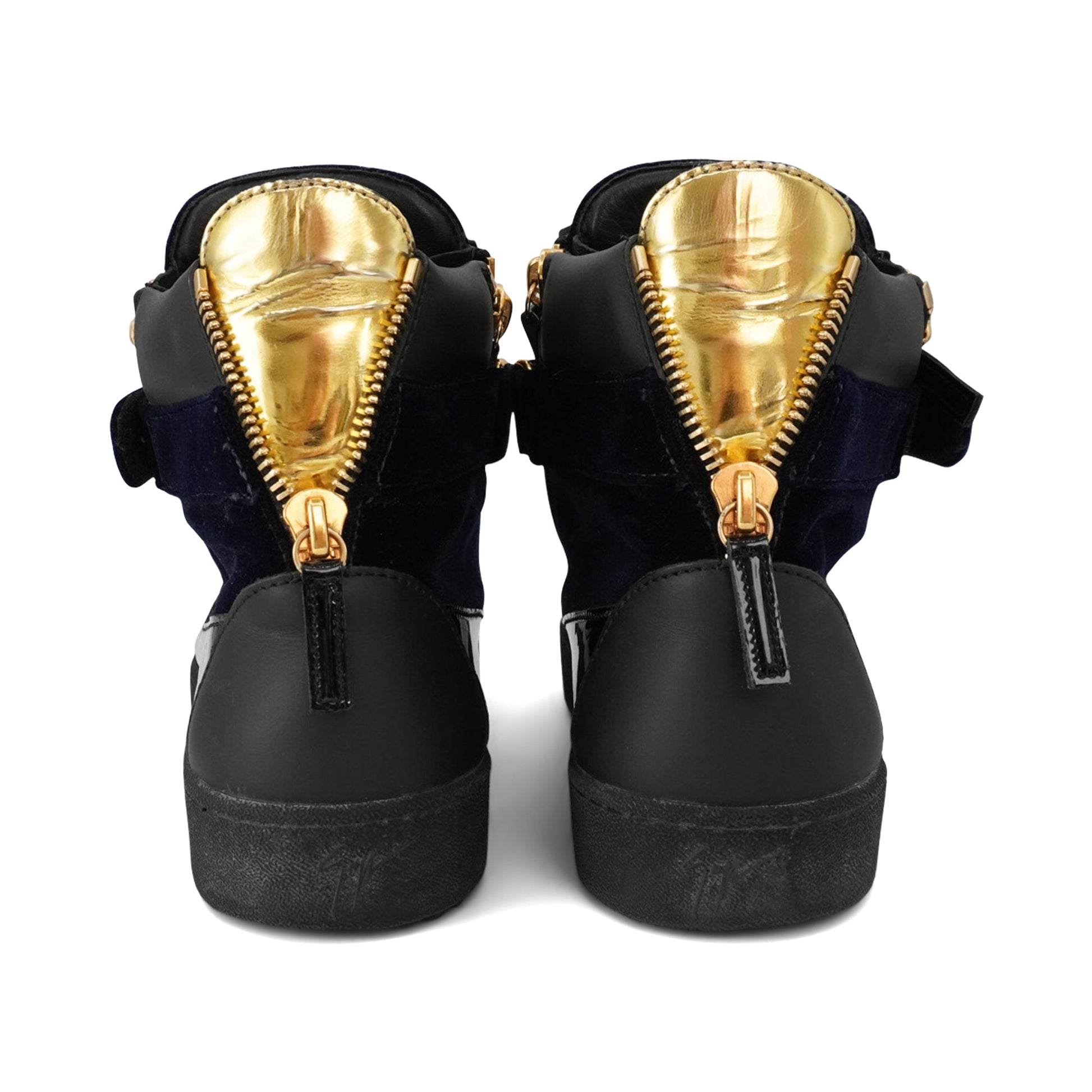 Giuseppe Zanotti 'Coby' high-top sneakers in navy velvet with black patent leather trim, gold zip and strap hardware, and a thick rubber sole.