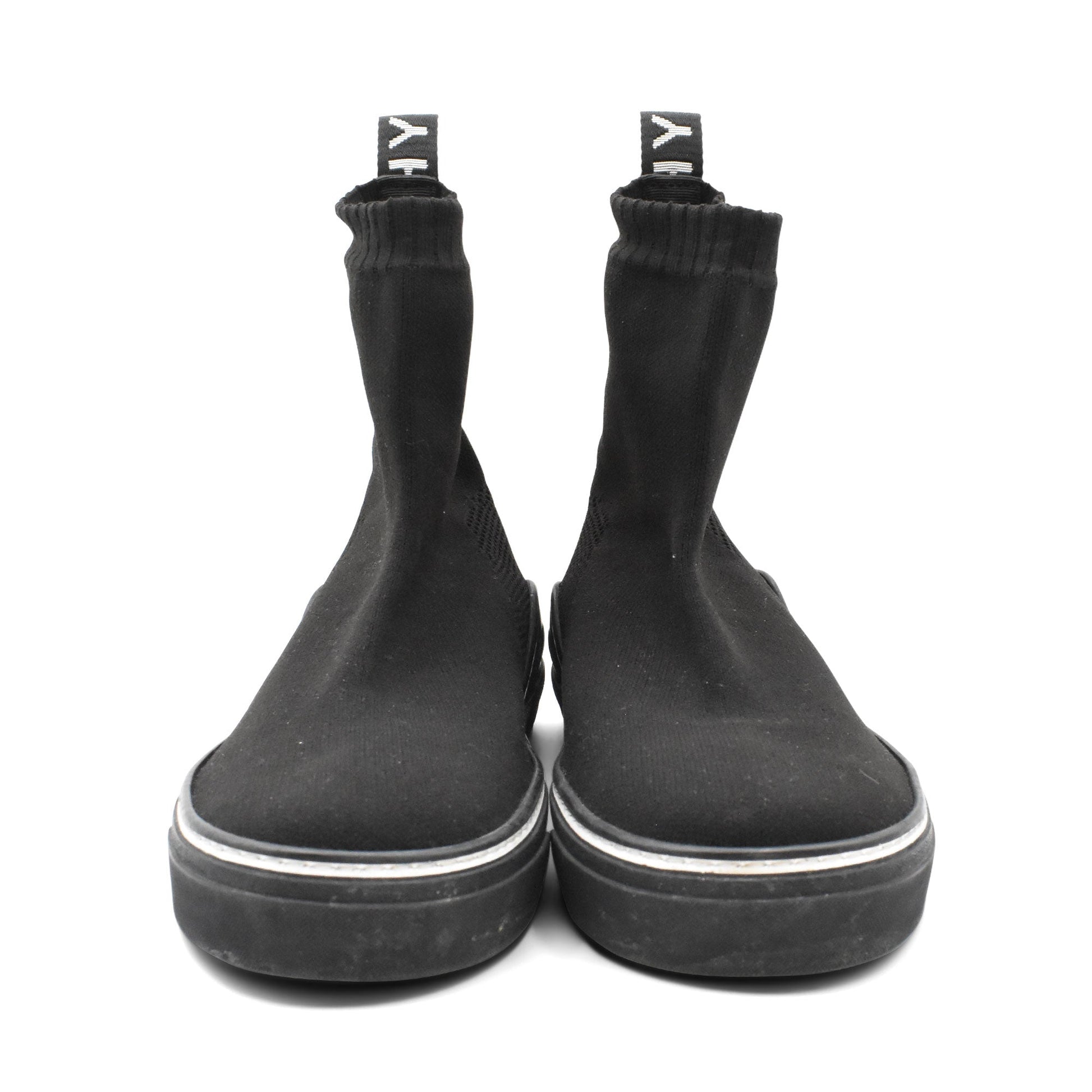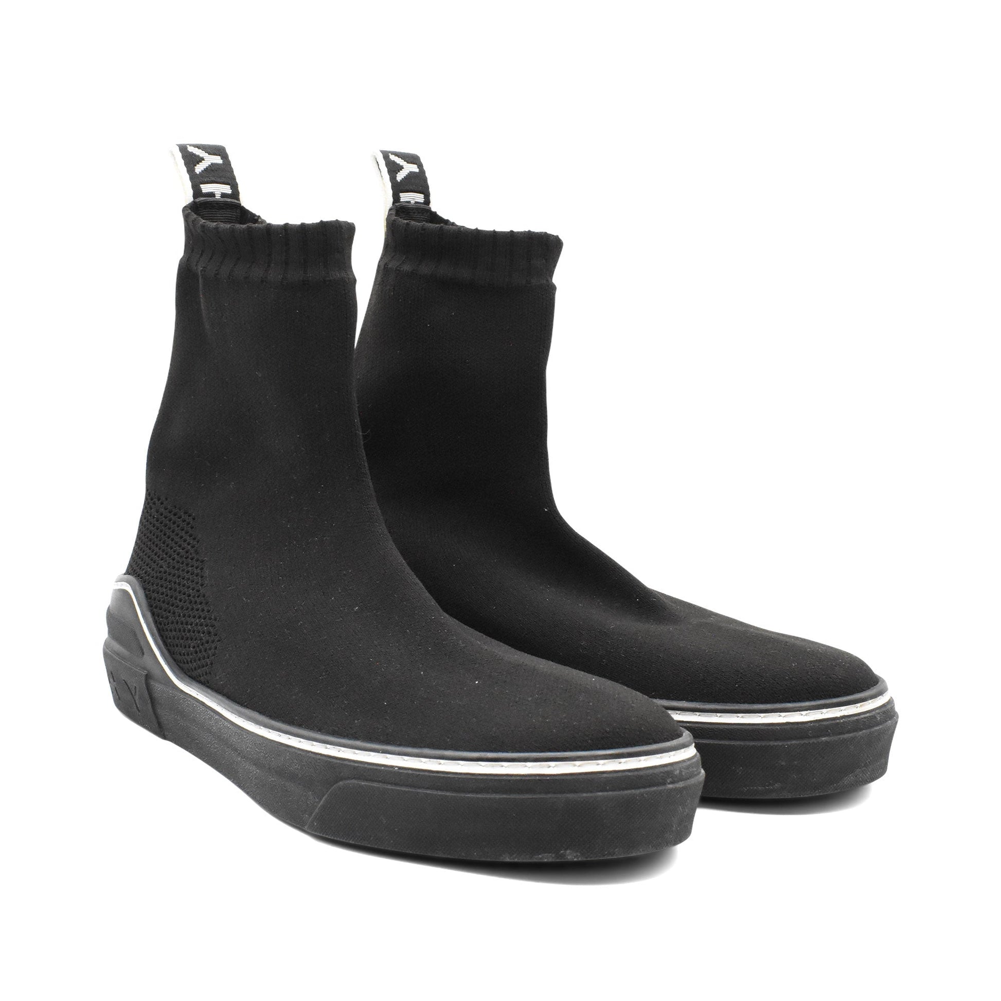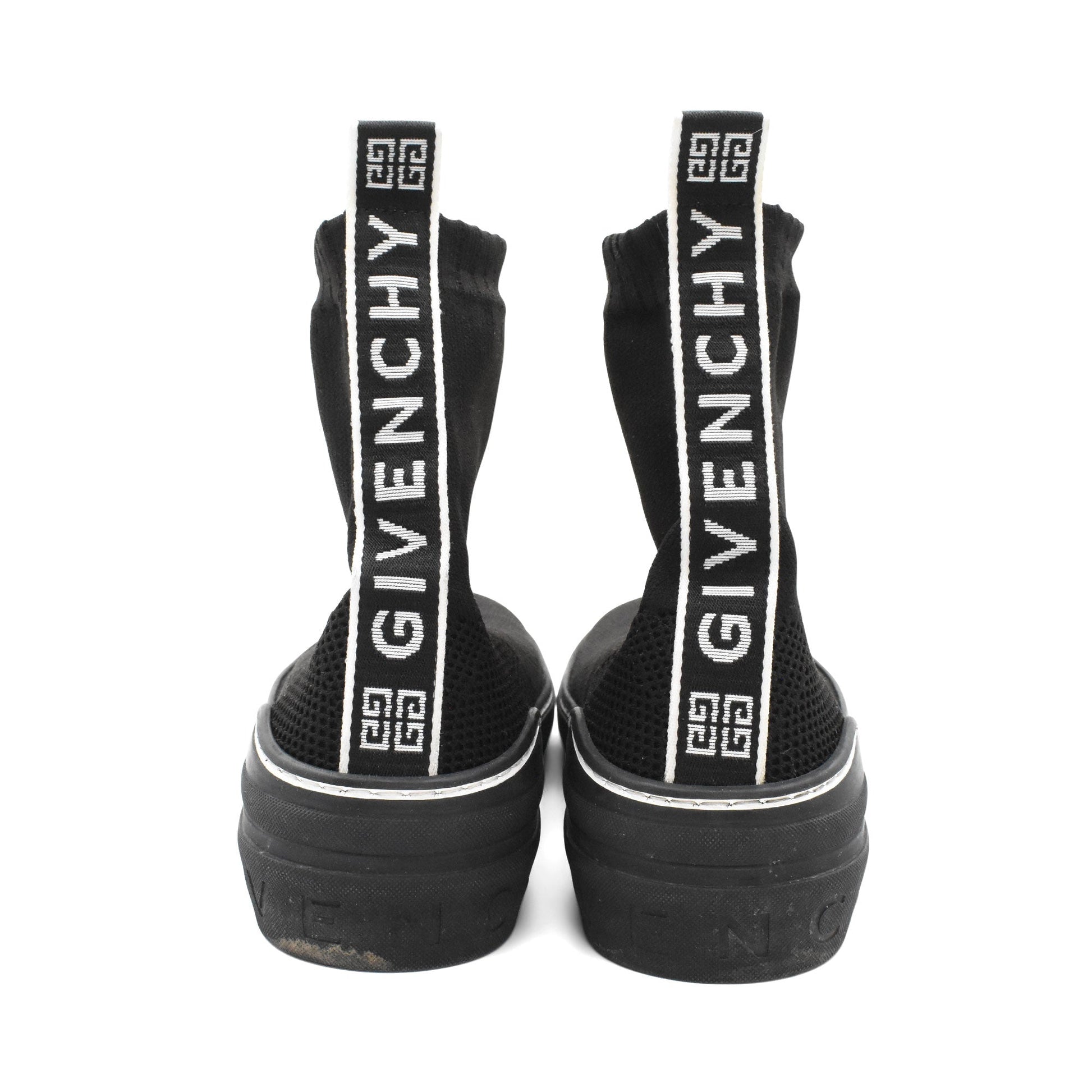 Givenchy high-top sock sneakers in black stretch knit with white trim, a white canvas logo stripe down the back, and a black rubber sole.