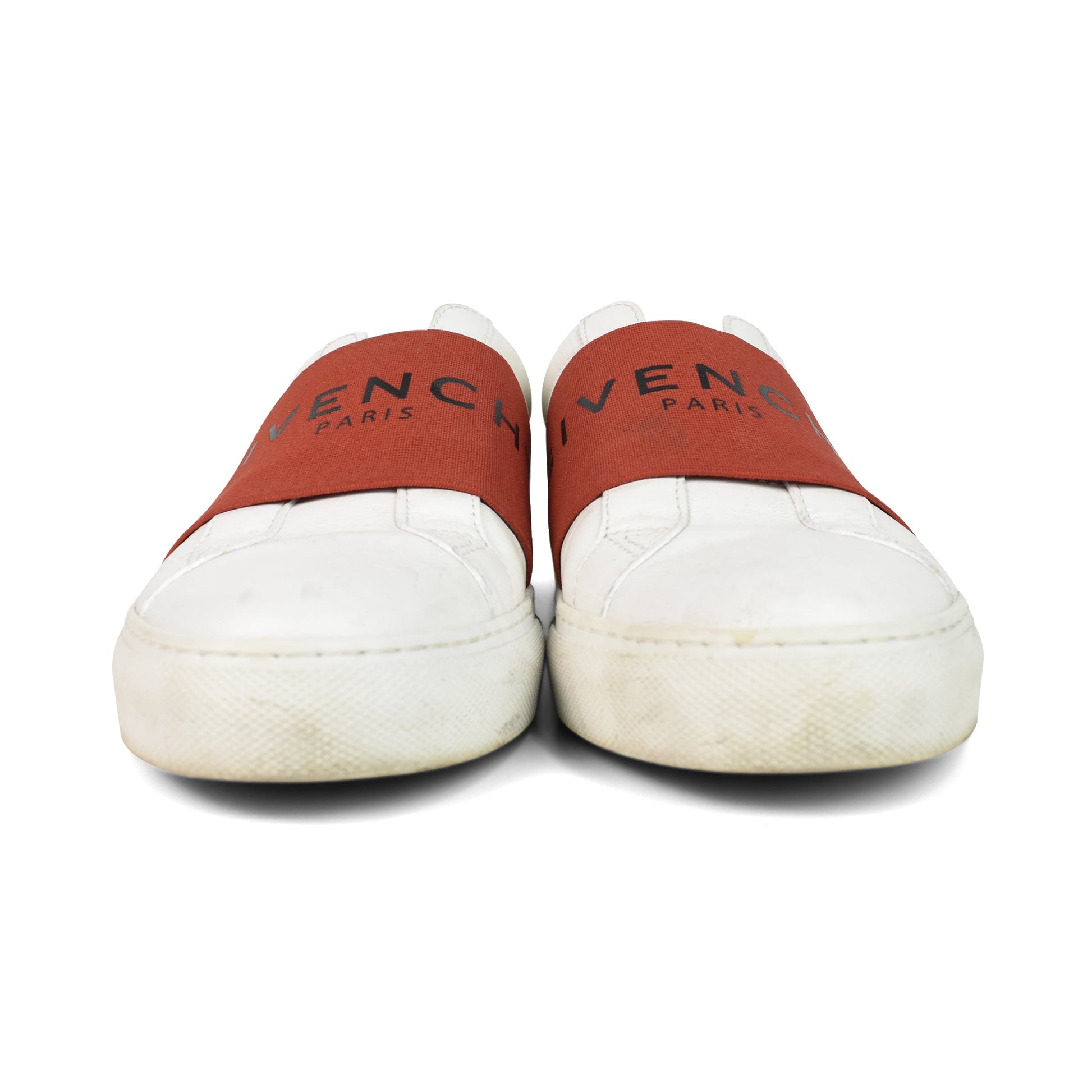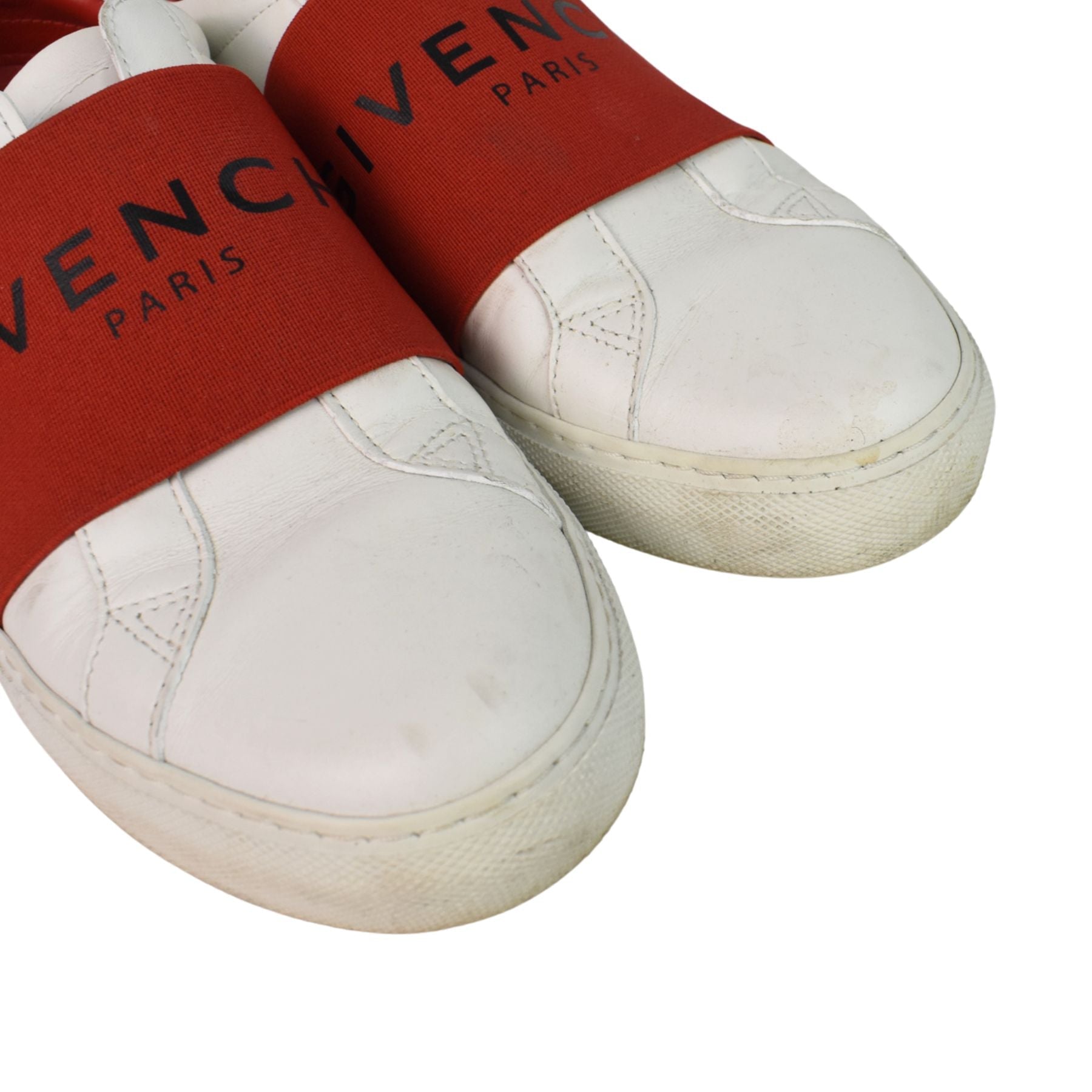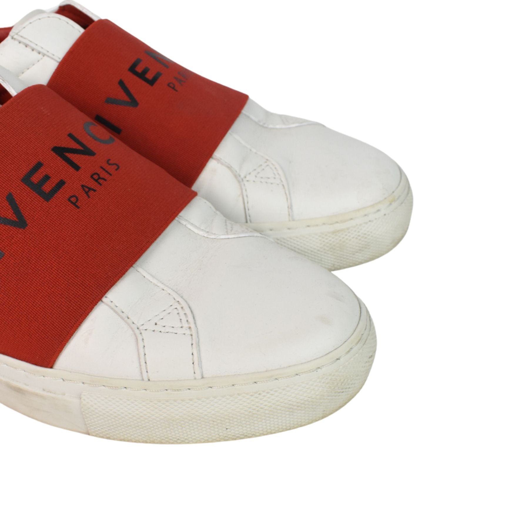Givenchy slip-on sneakers in white leather with a red and black logo elastic strap band and a red heel detail.