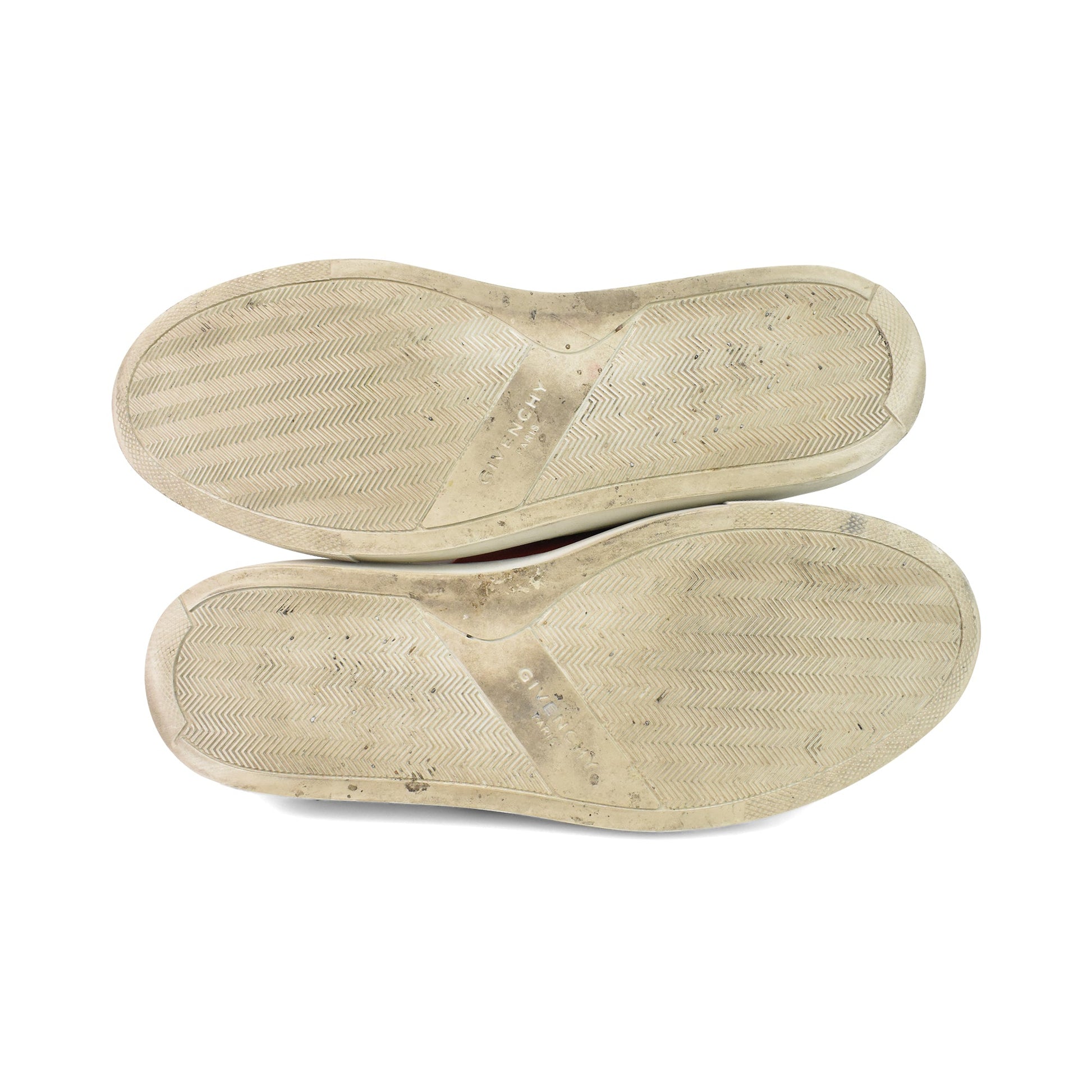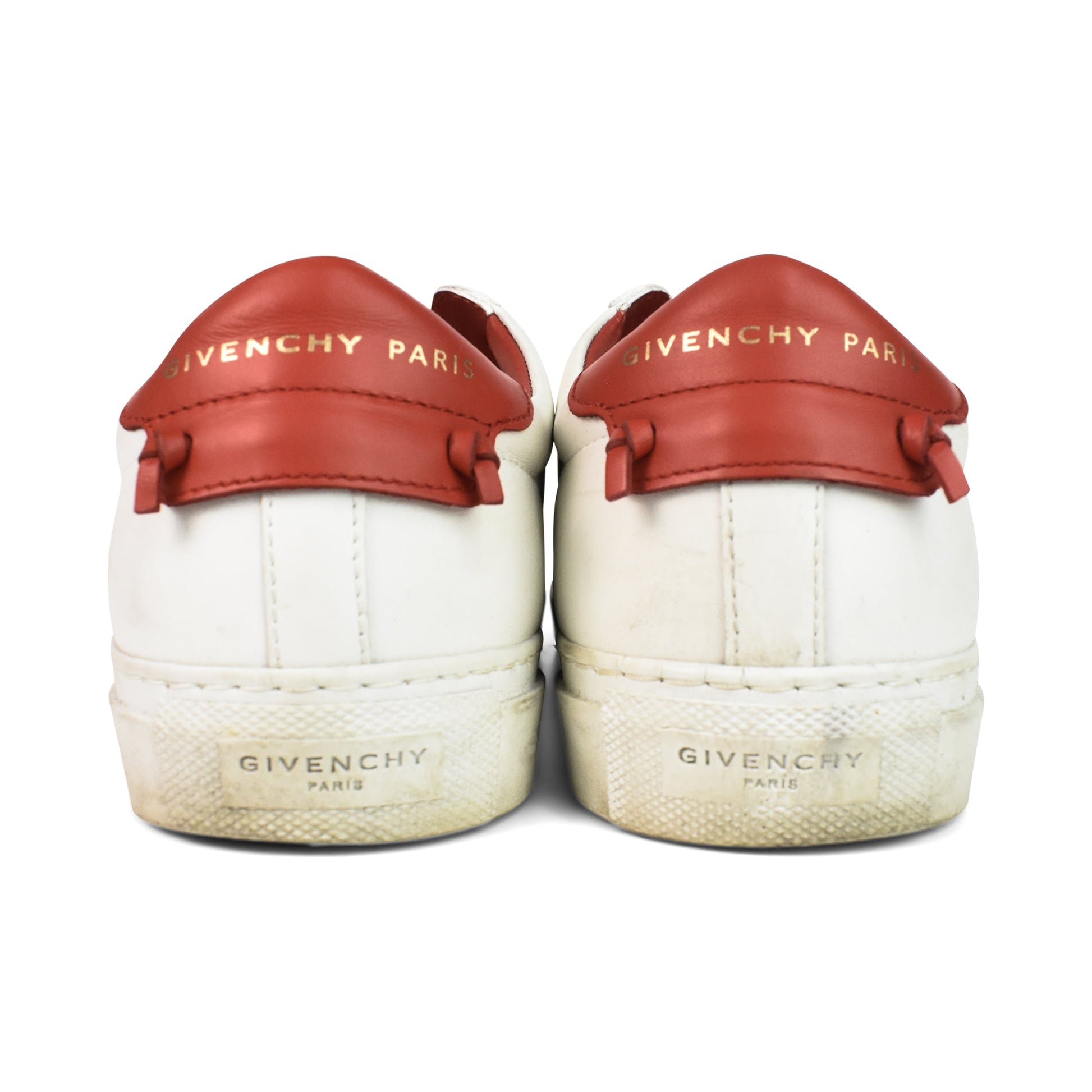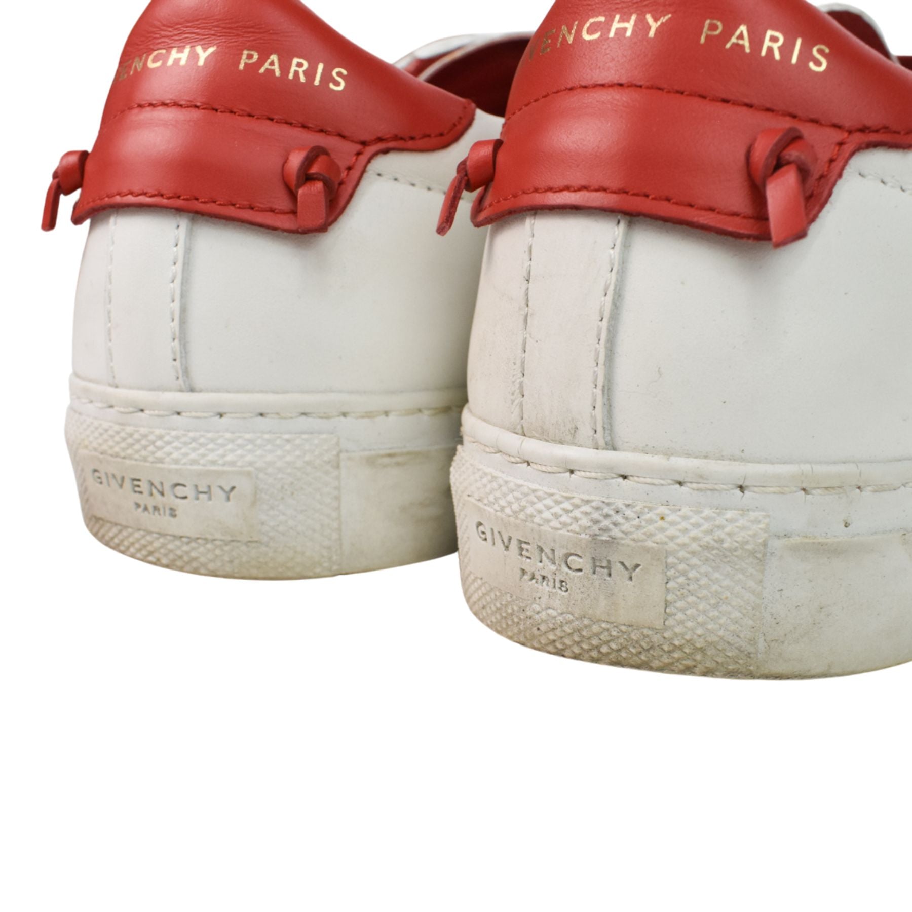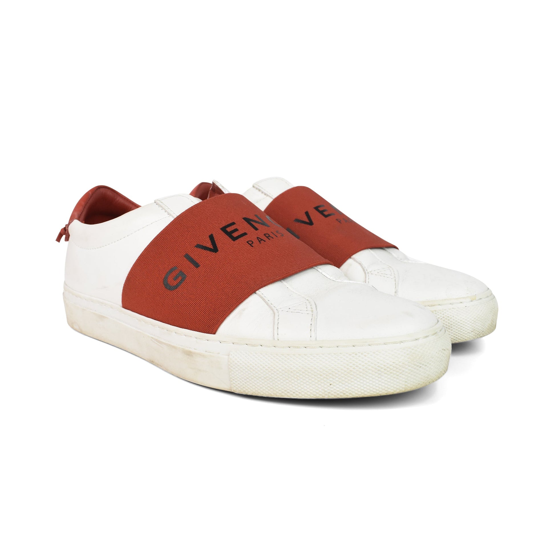 Givenchy slip-on sneakers in white leather with a red and black logo elastic strap band and a red heel detail.