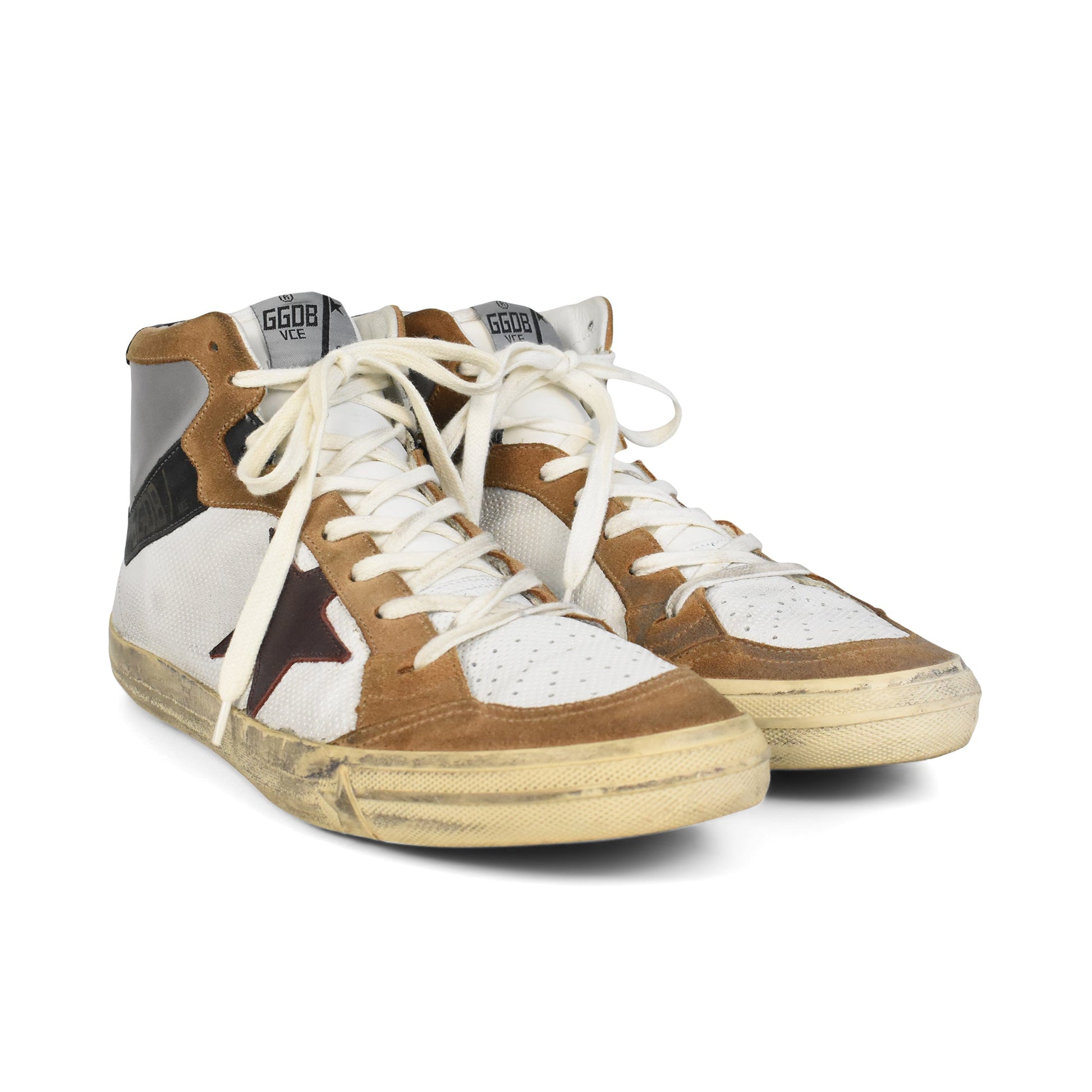 Golden Goose high-top sneaker in white perforated leather with silver and black leather panelling. Features tan suede details, a burgundy red leather star on the sides, distressing throughout, beige rubber soles, and white flat laces.