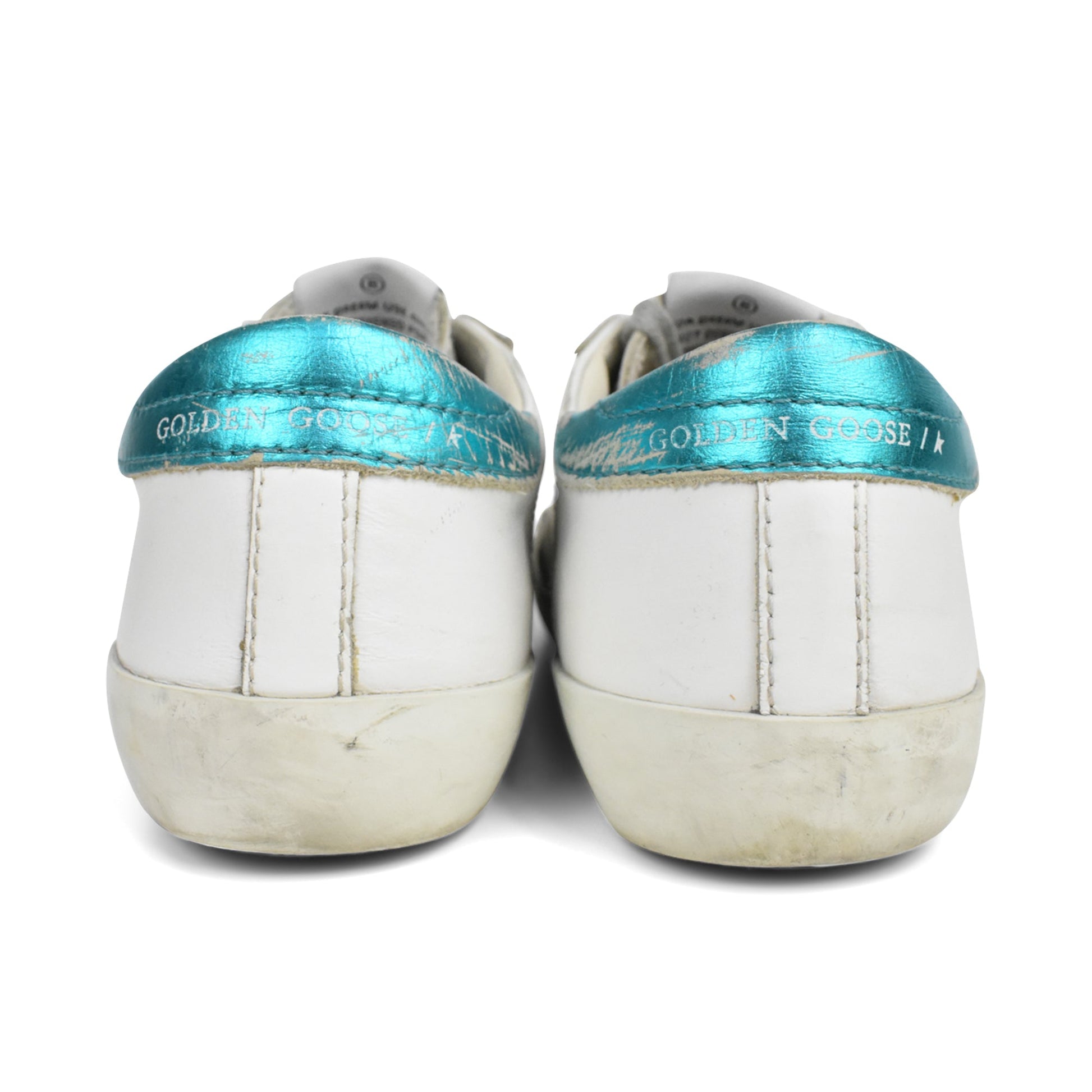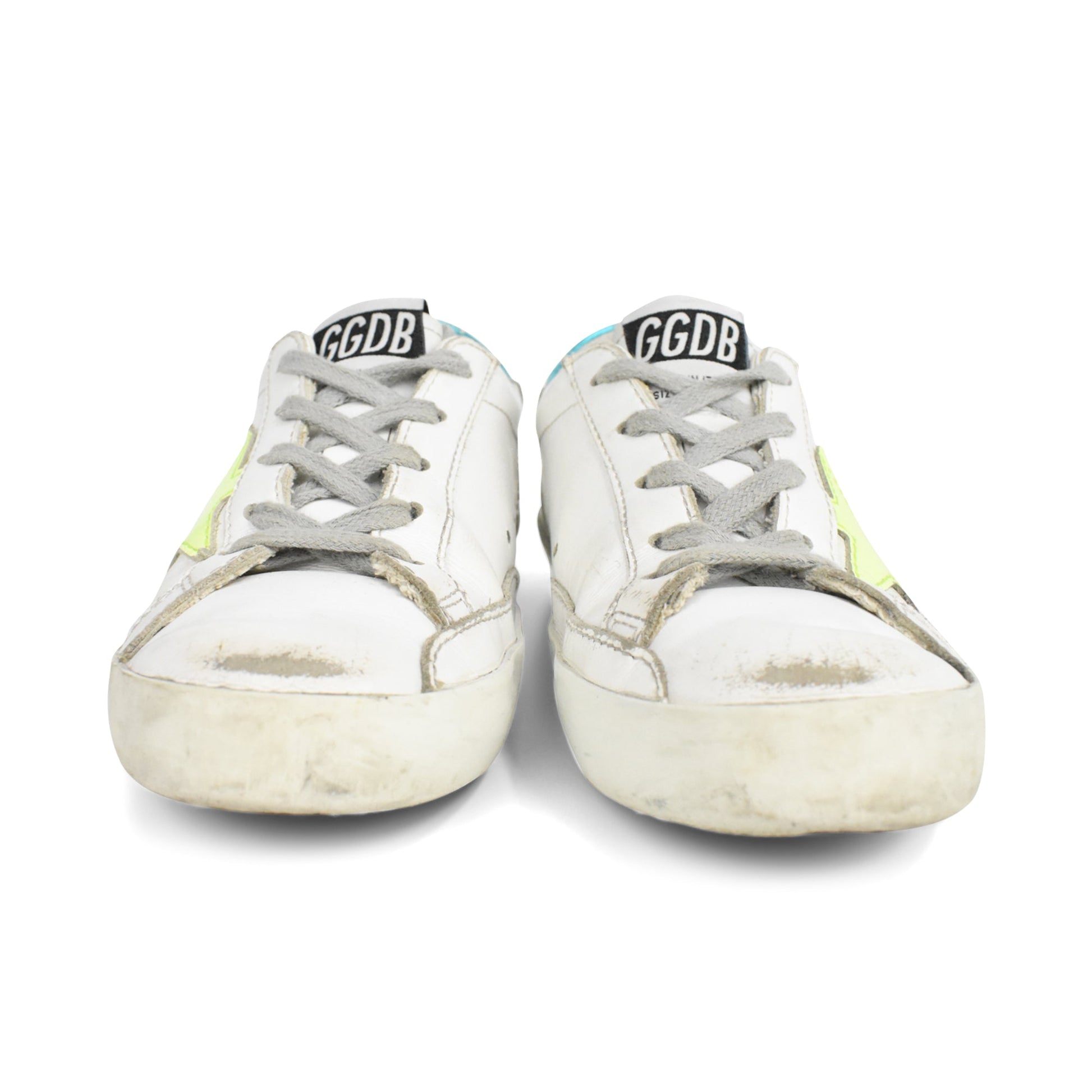 Golden Goose low-top sneakers in white leather with a neon yellow star appliqué, metallic blue trim at the heel, and all-over distressing.