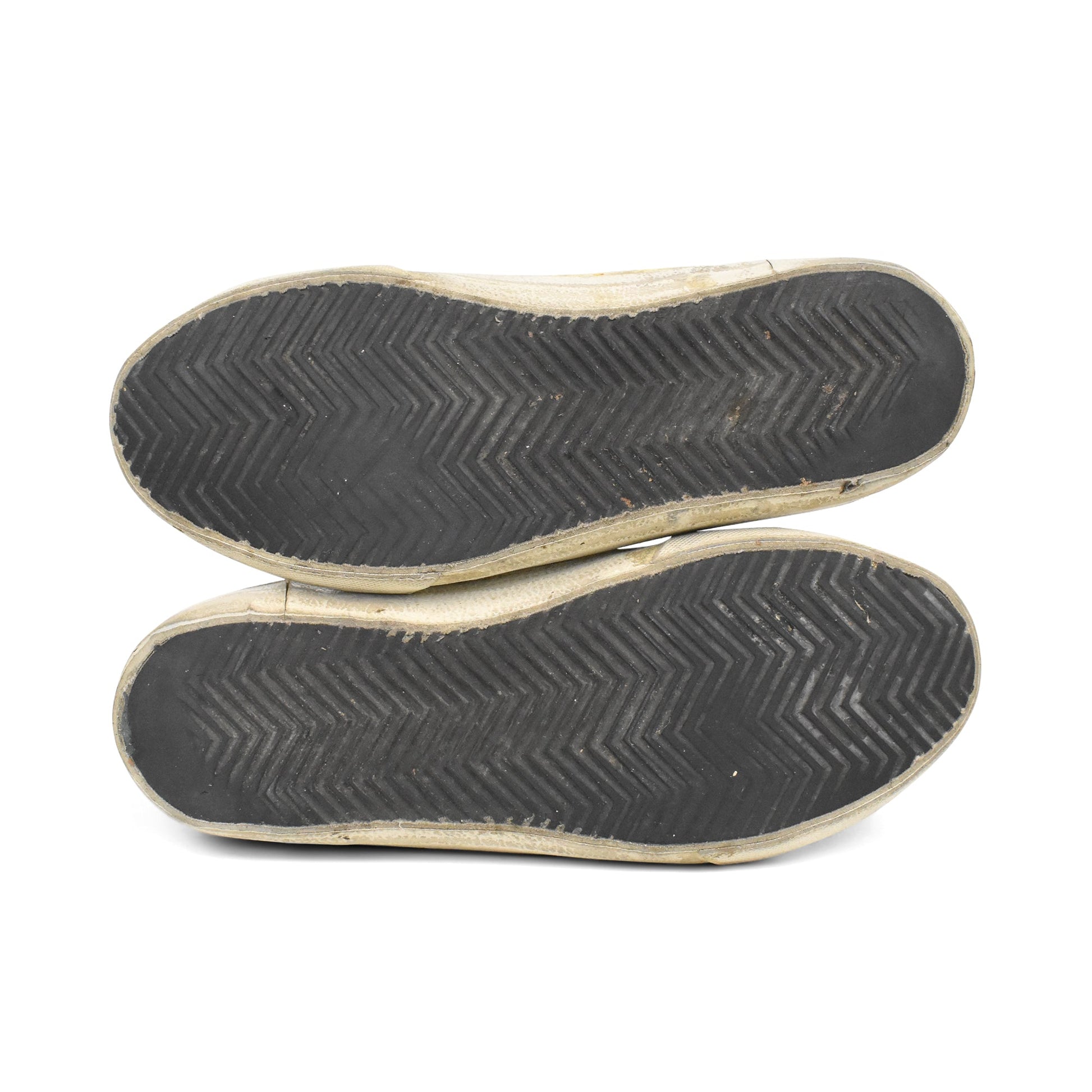 Golden Goose high-top sneakers in grey suede with white leather panelling, an inner zip closure in silver hardware, grey and red star and stripe detailing on the sides, and intentional distressing throughout.