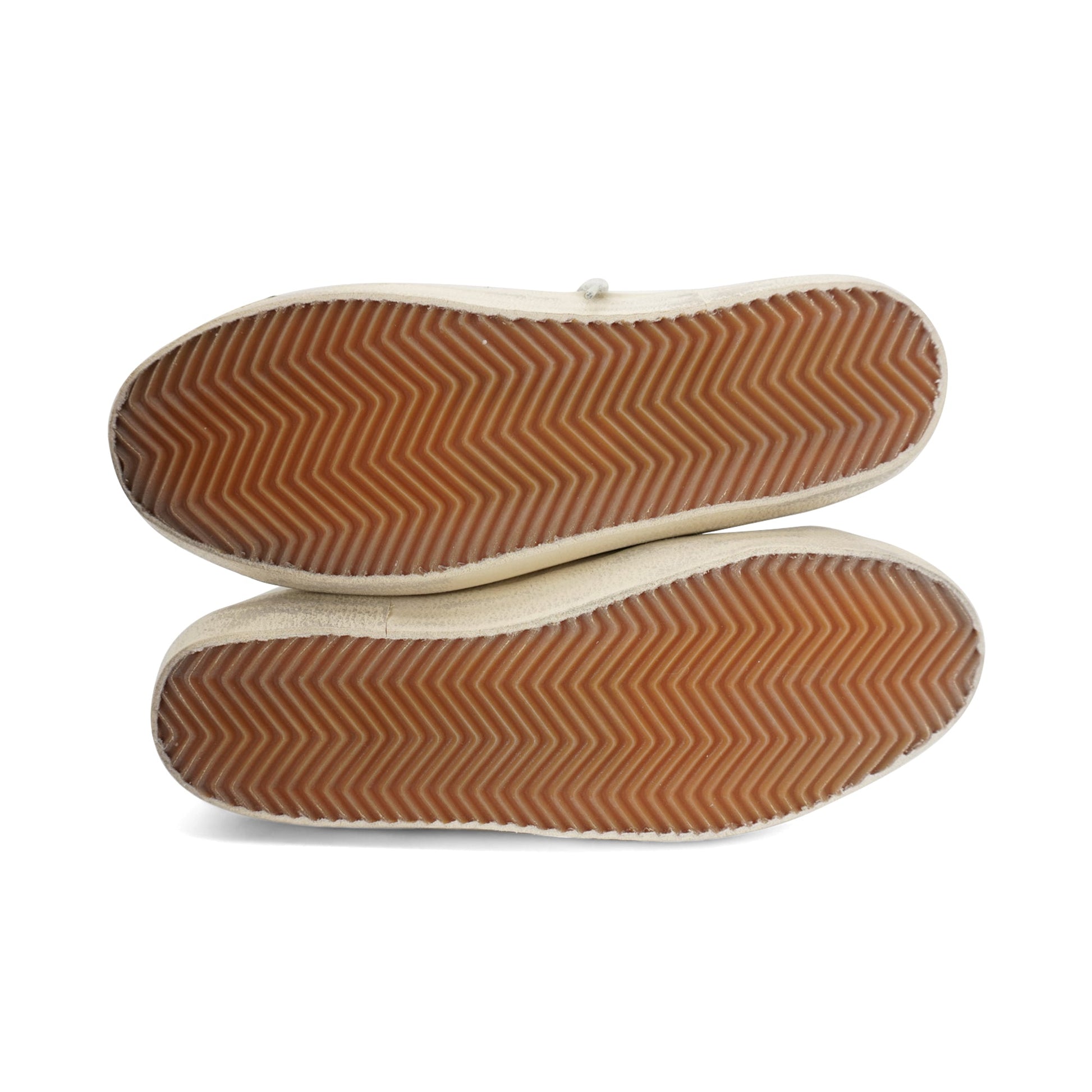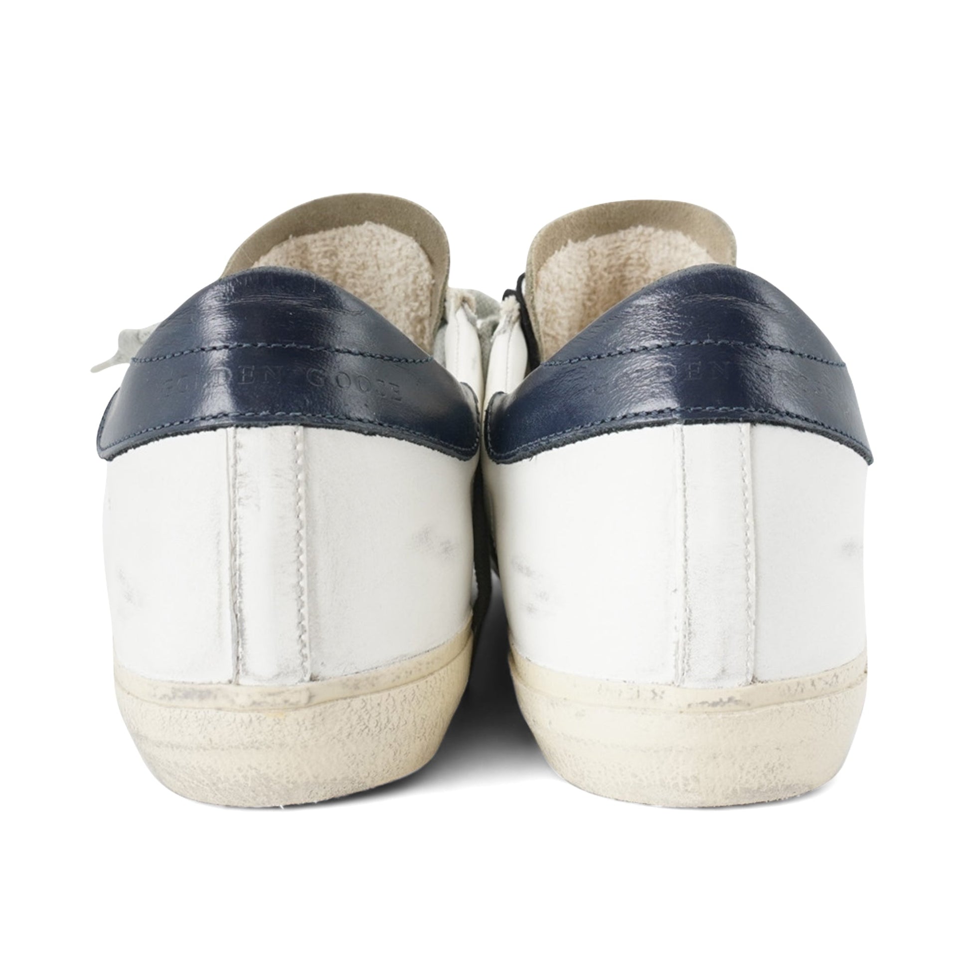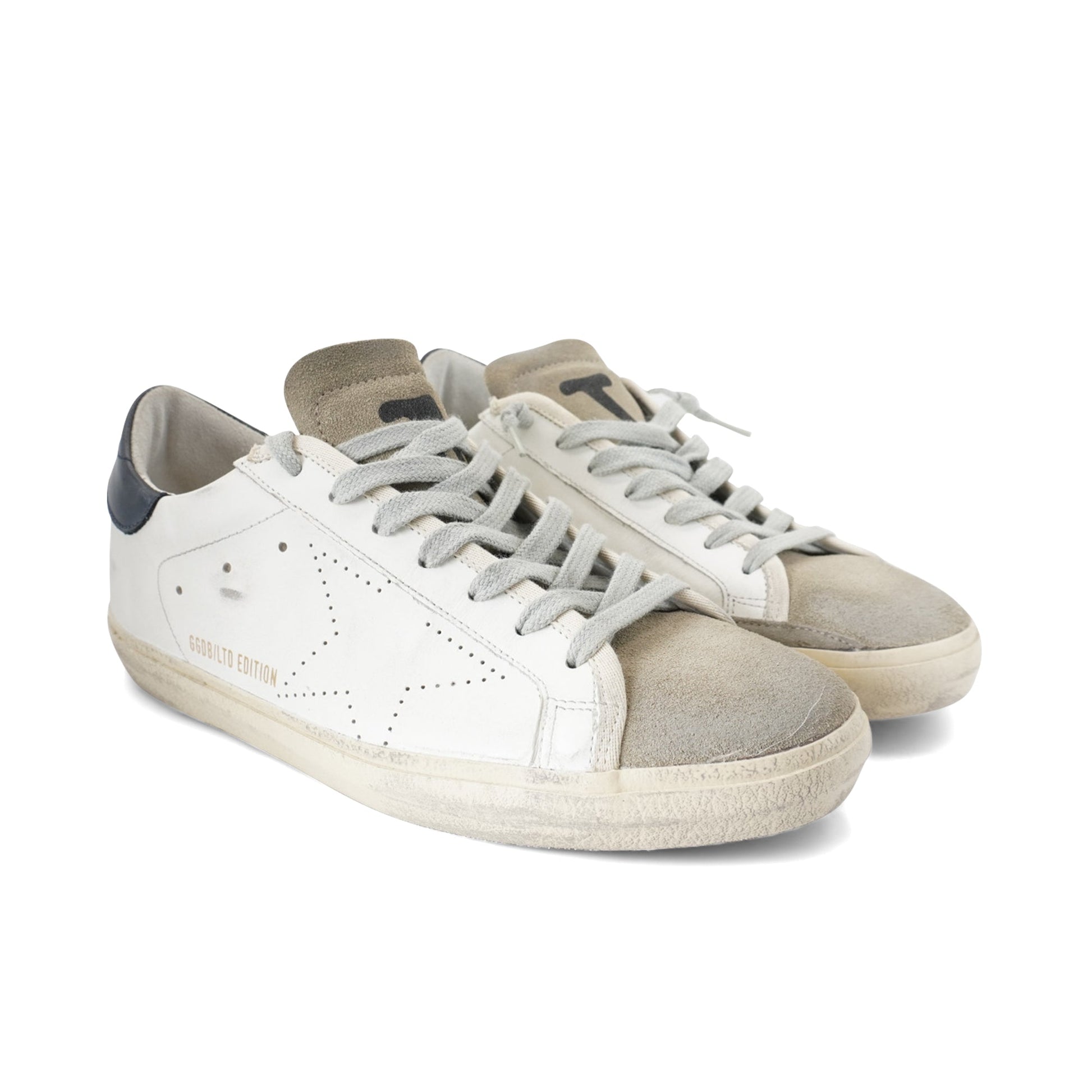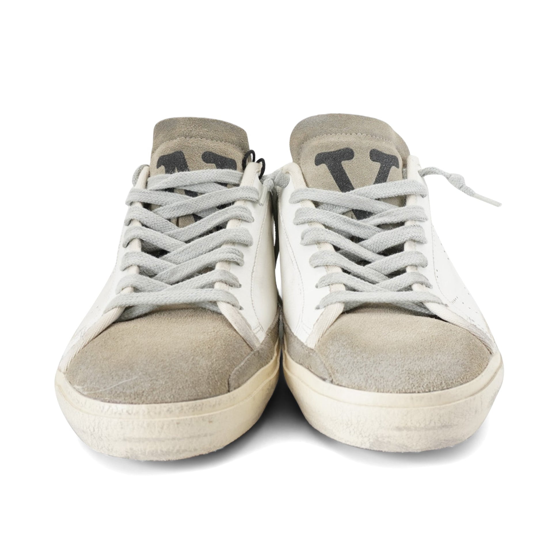 Golden Goose 'Super Star' low top sneakers in pre-distressed white leather and grey suede with navy leather heel tab and perforated star.
